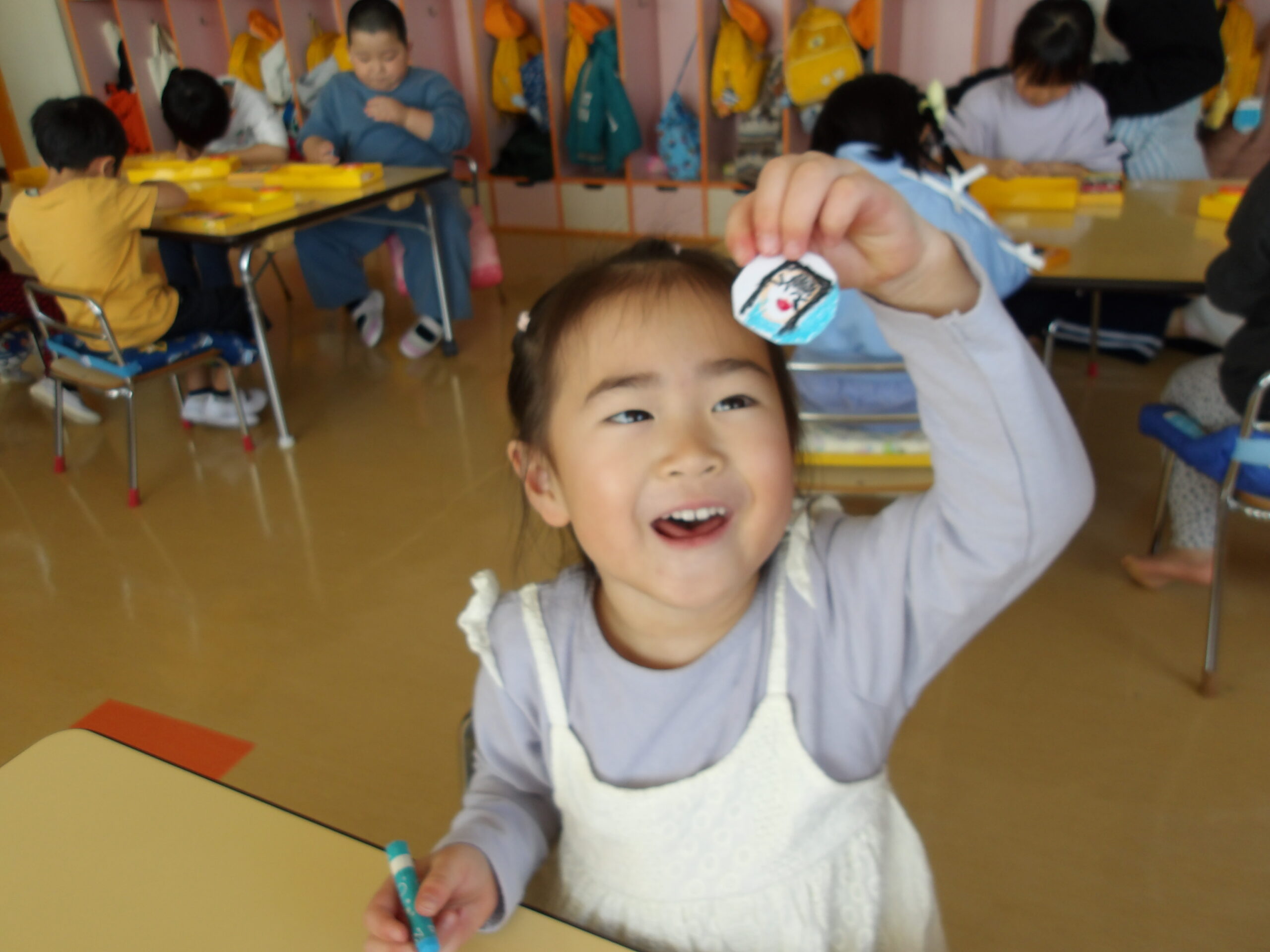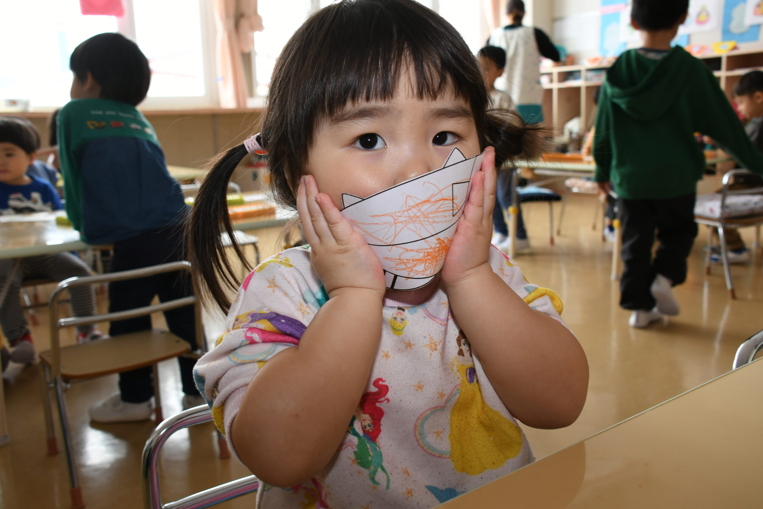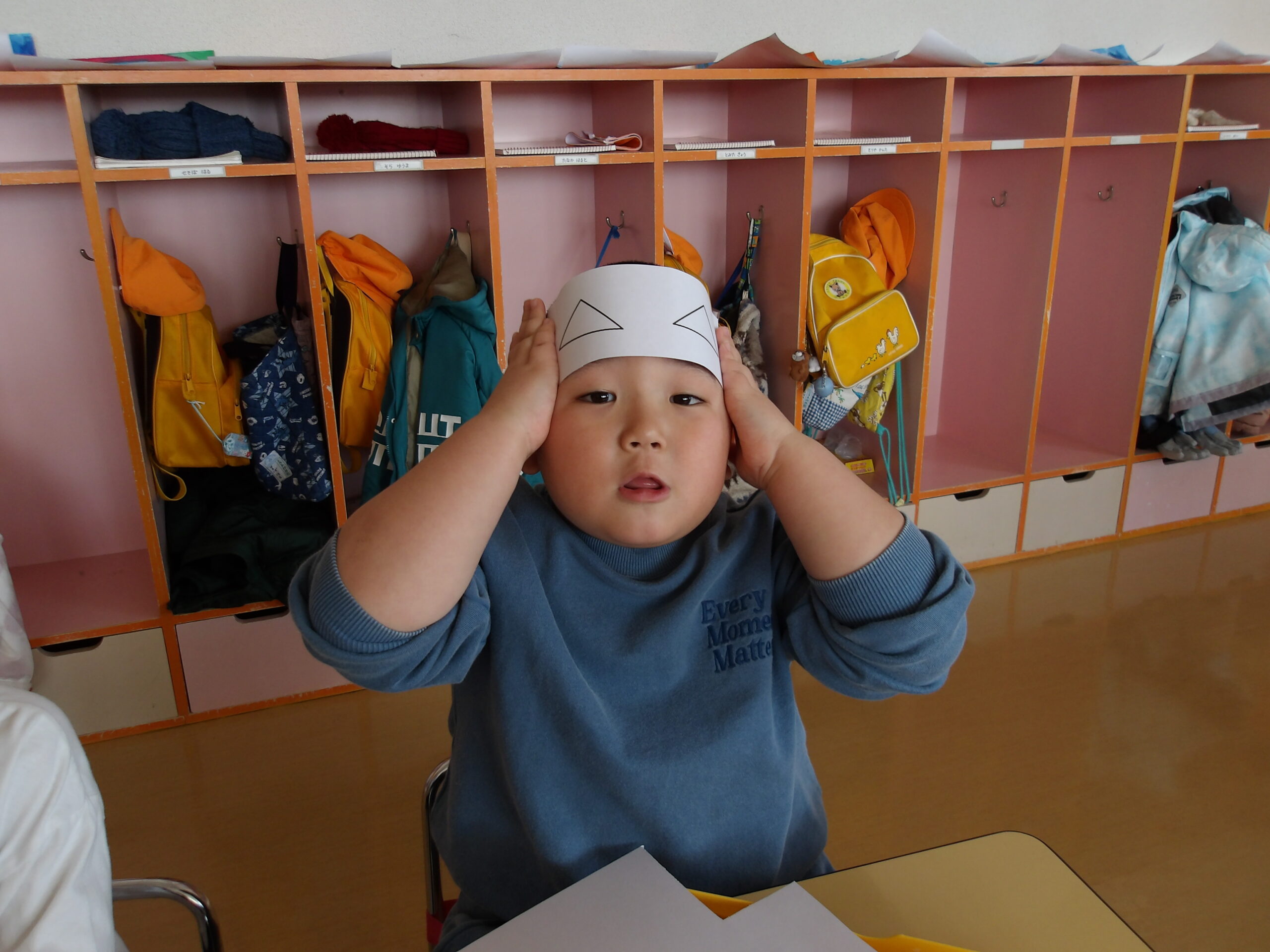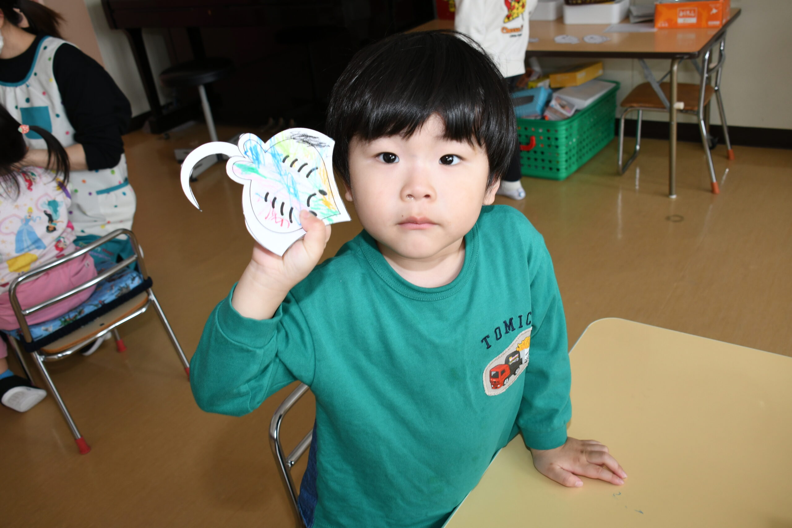 年少組のお友達も、お兄さんお姉さんのを見ながら、自分で考えた場所にそれぞれ飾りや丸折り紙を付けて、完成させて喜んで被っていました。