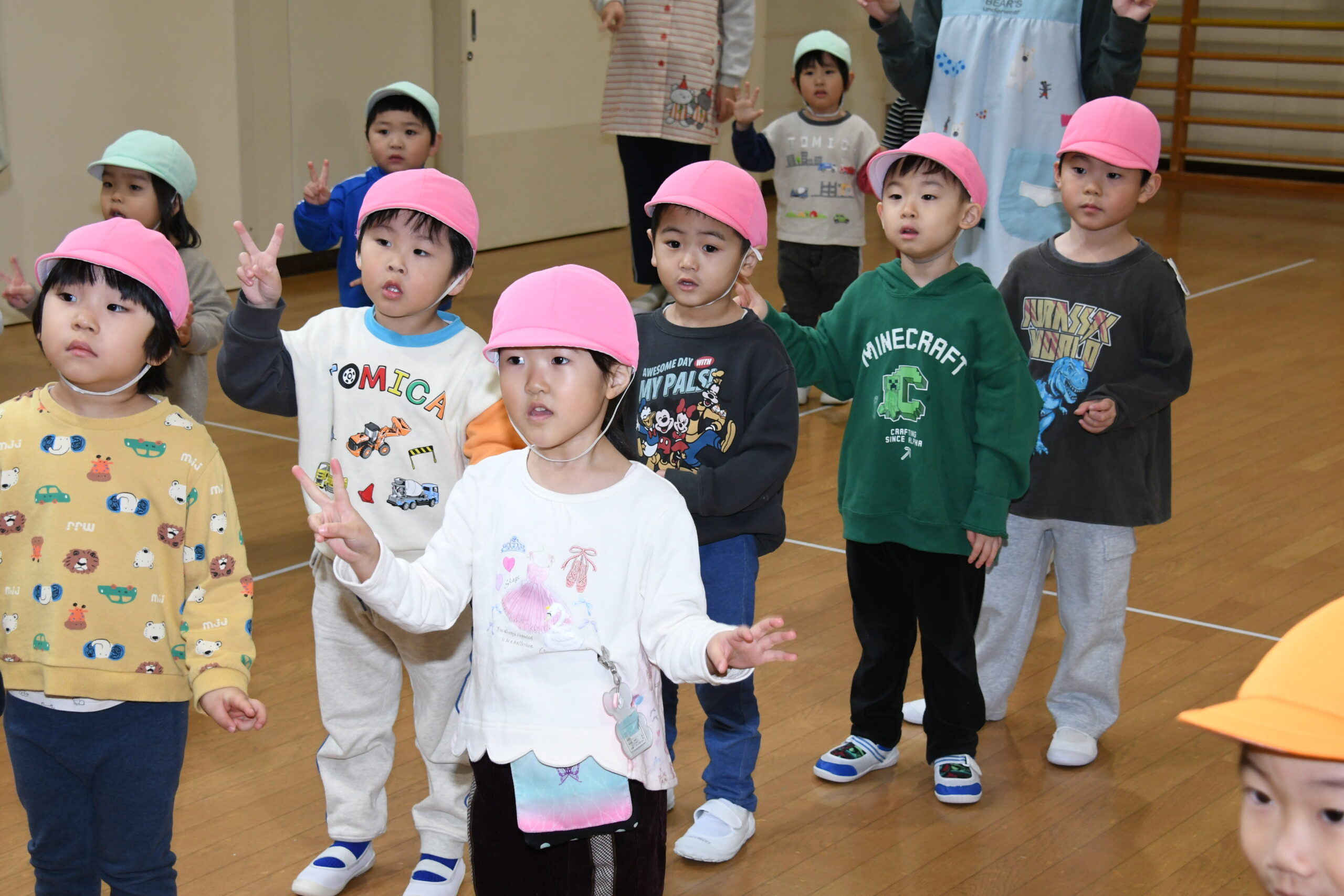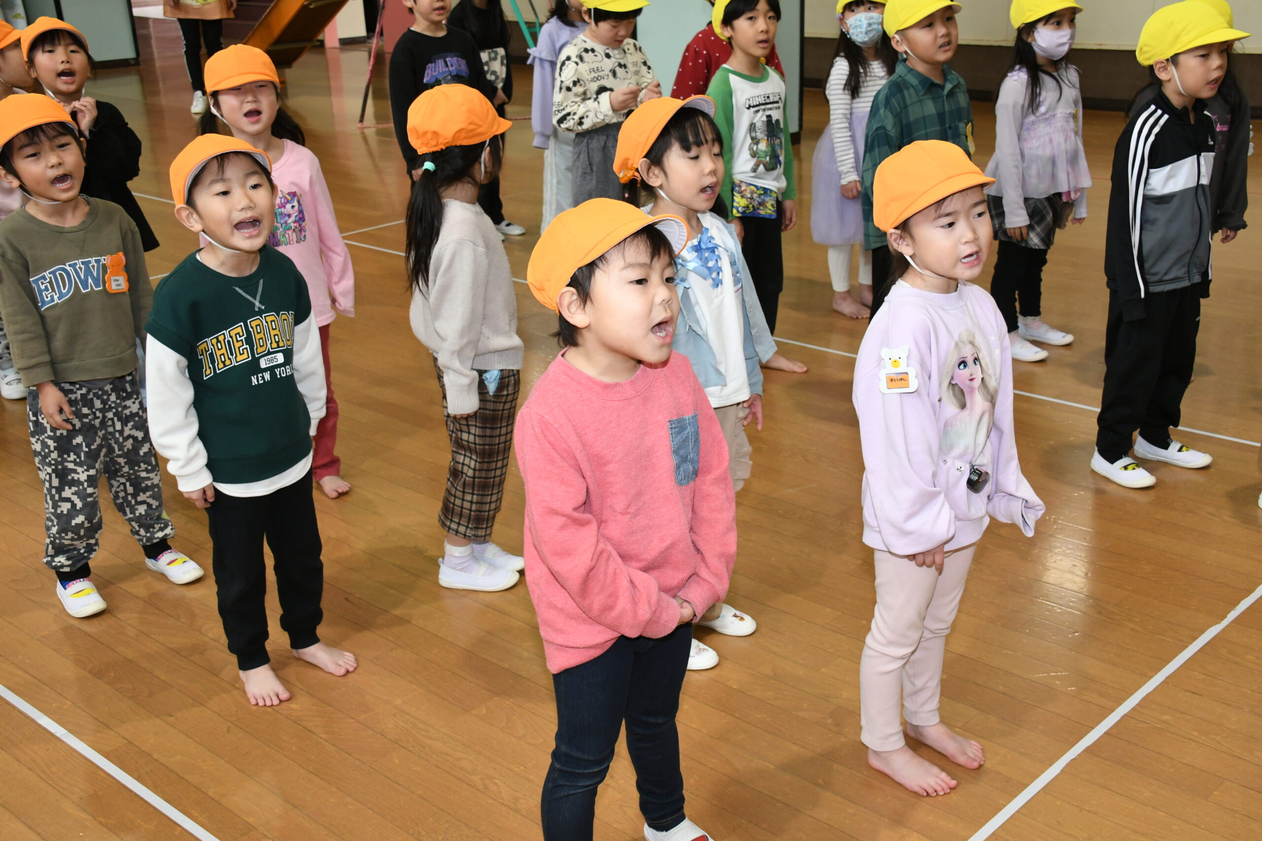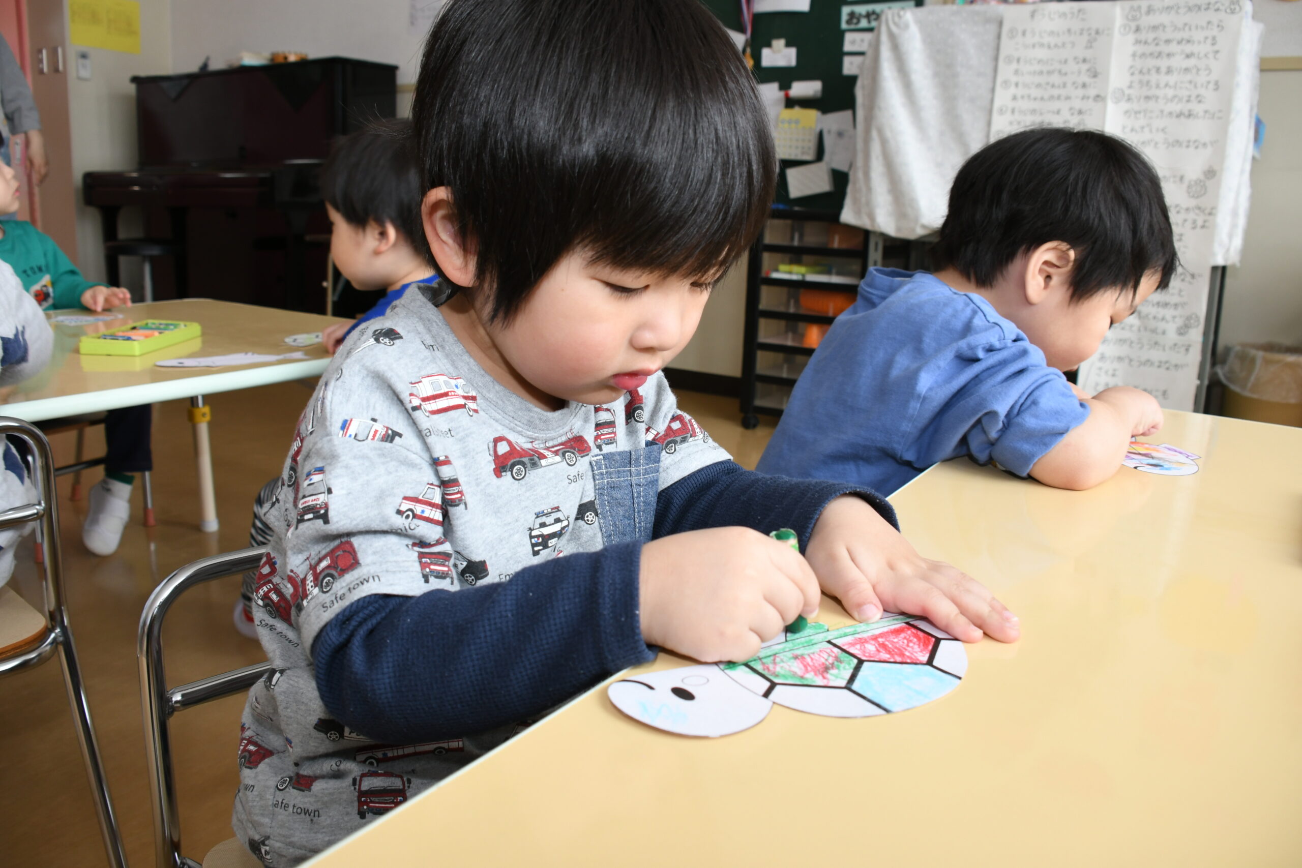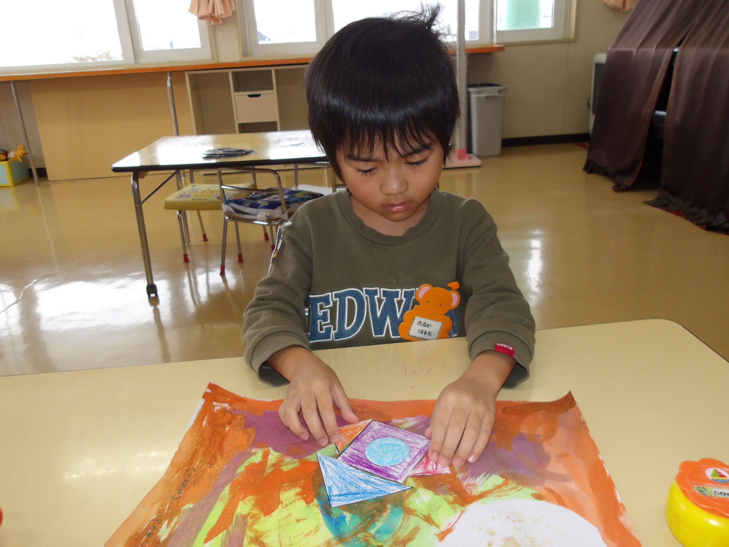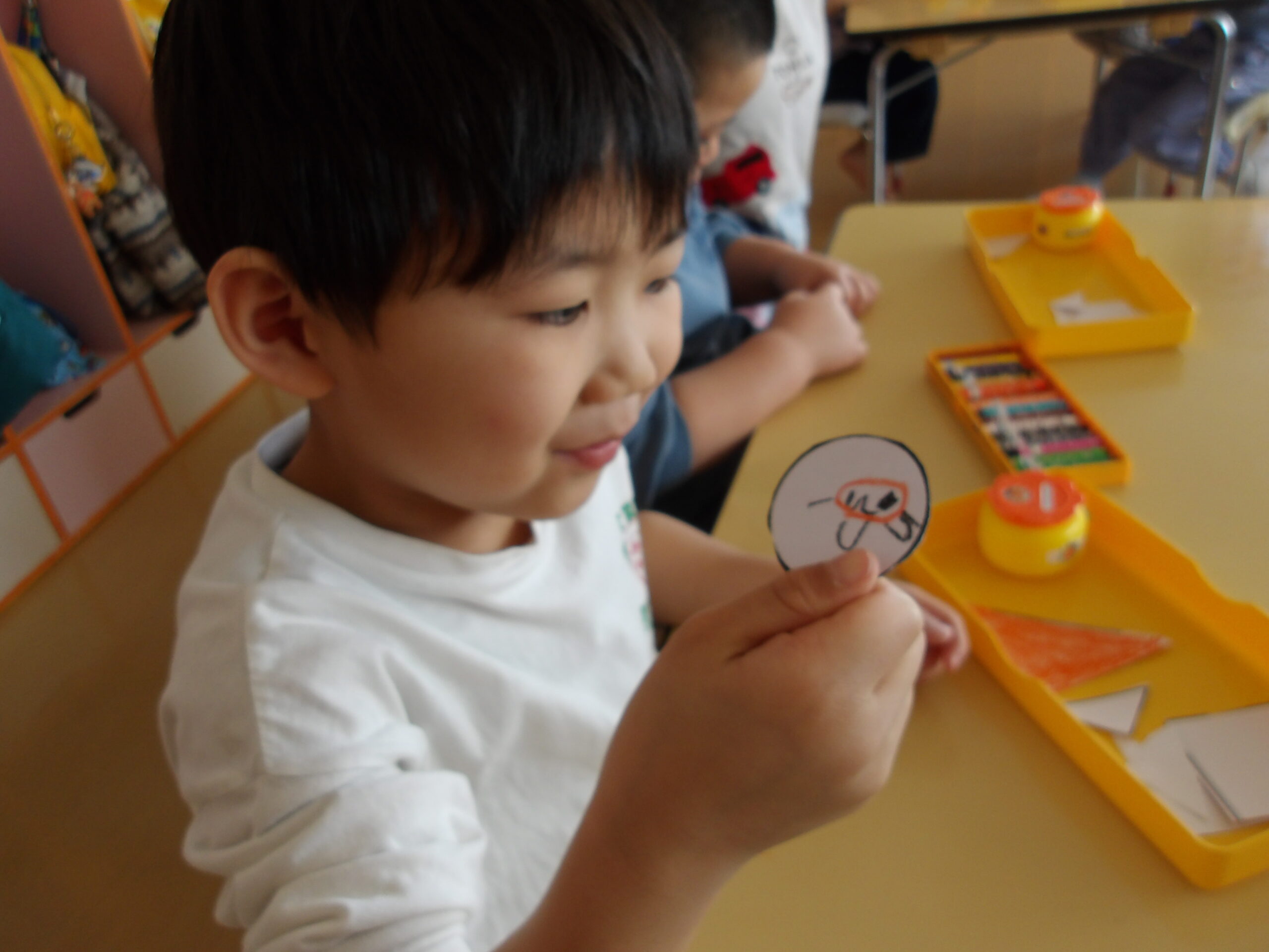 年少組のお友達も、お兄さんお姉さんのを見ながら、自分で考えた場所にそれぞれ飾りや丸折り紙を付けて、完成させて喜んで被っていました。