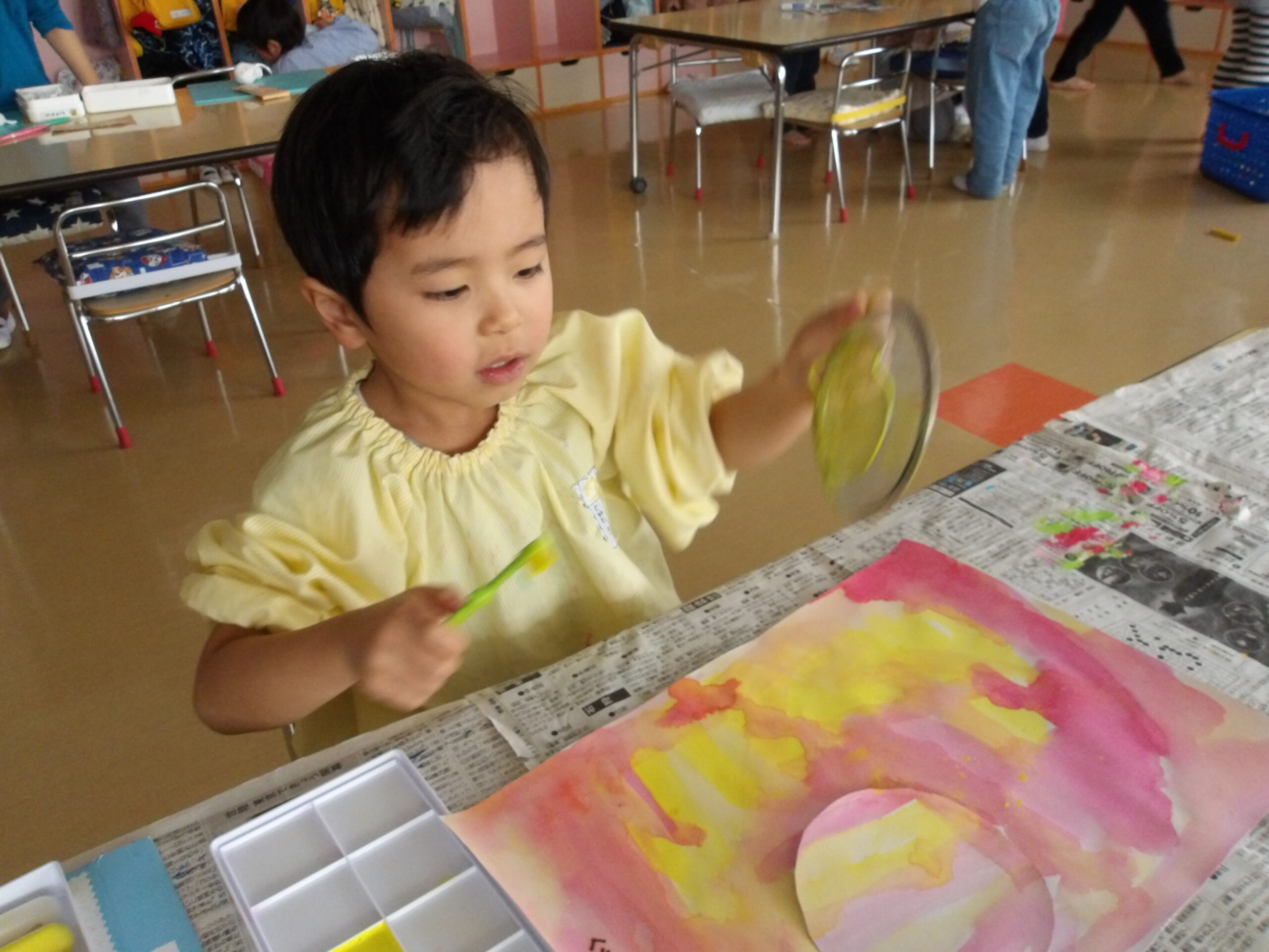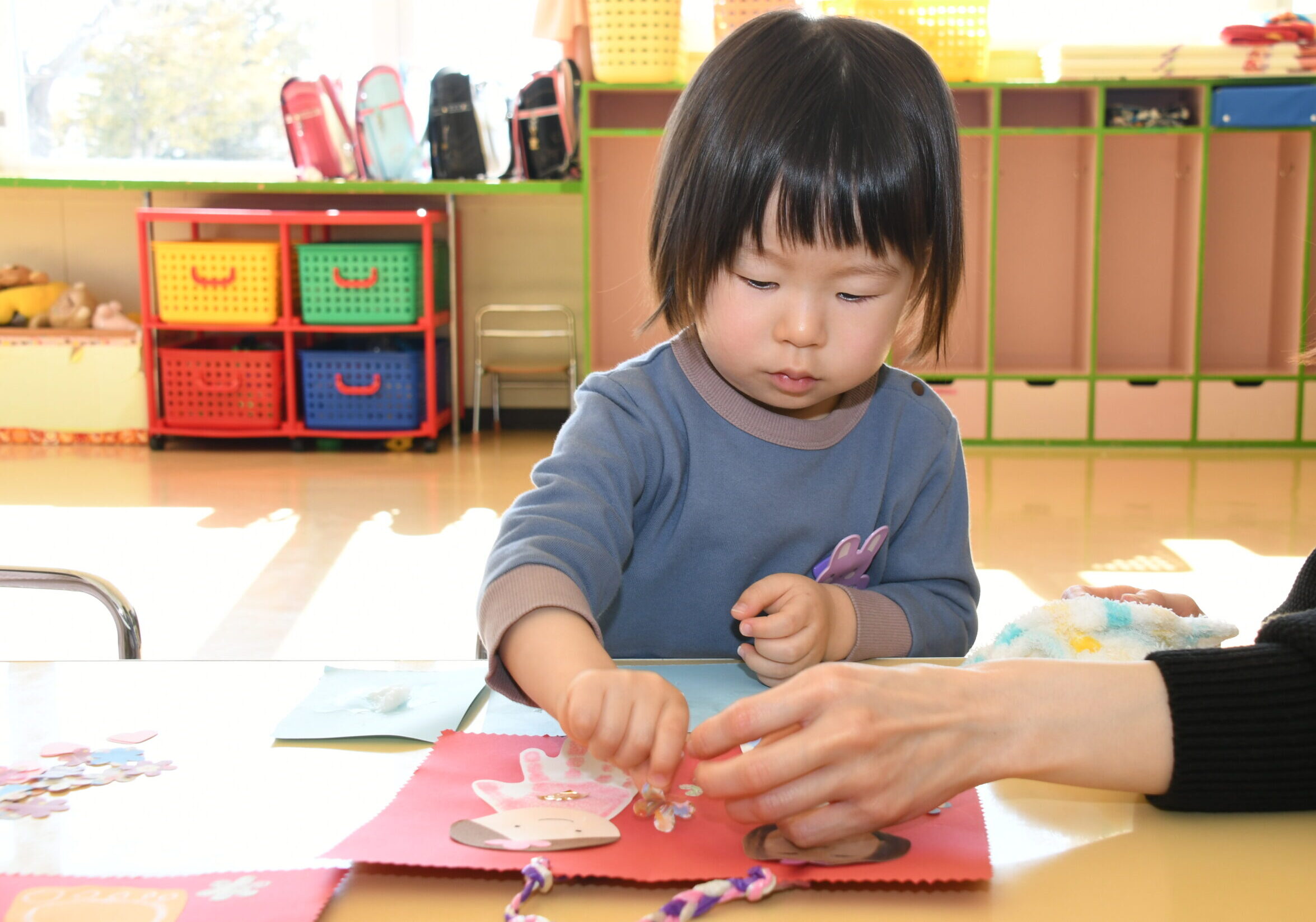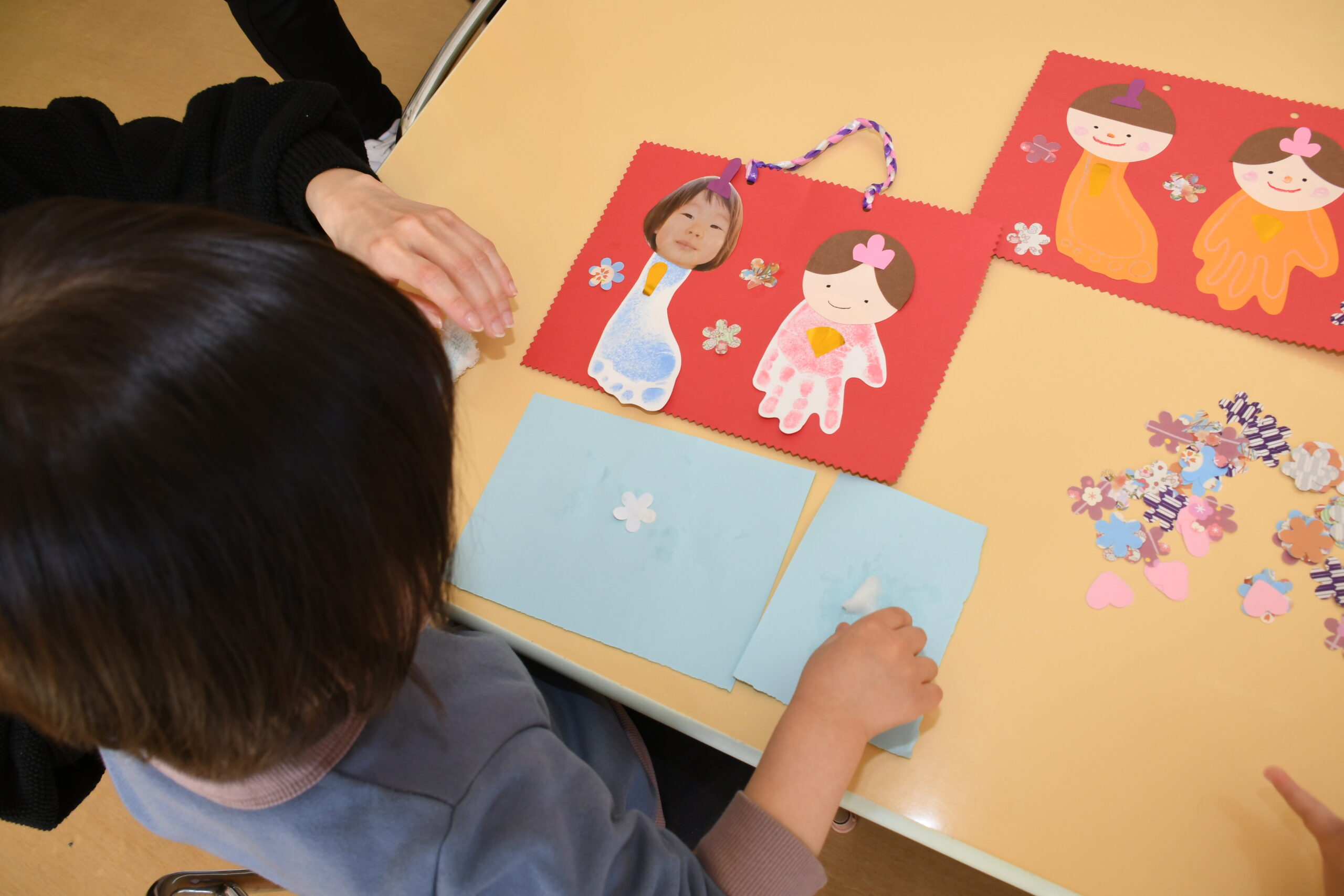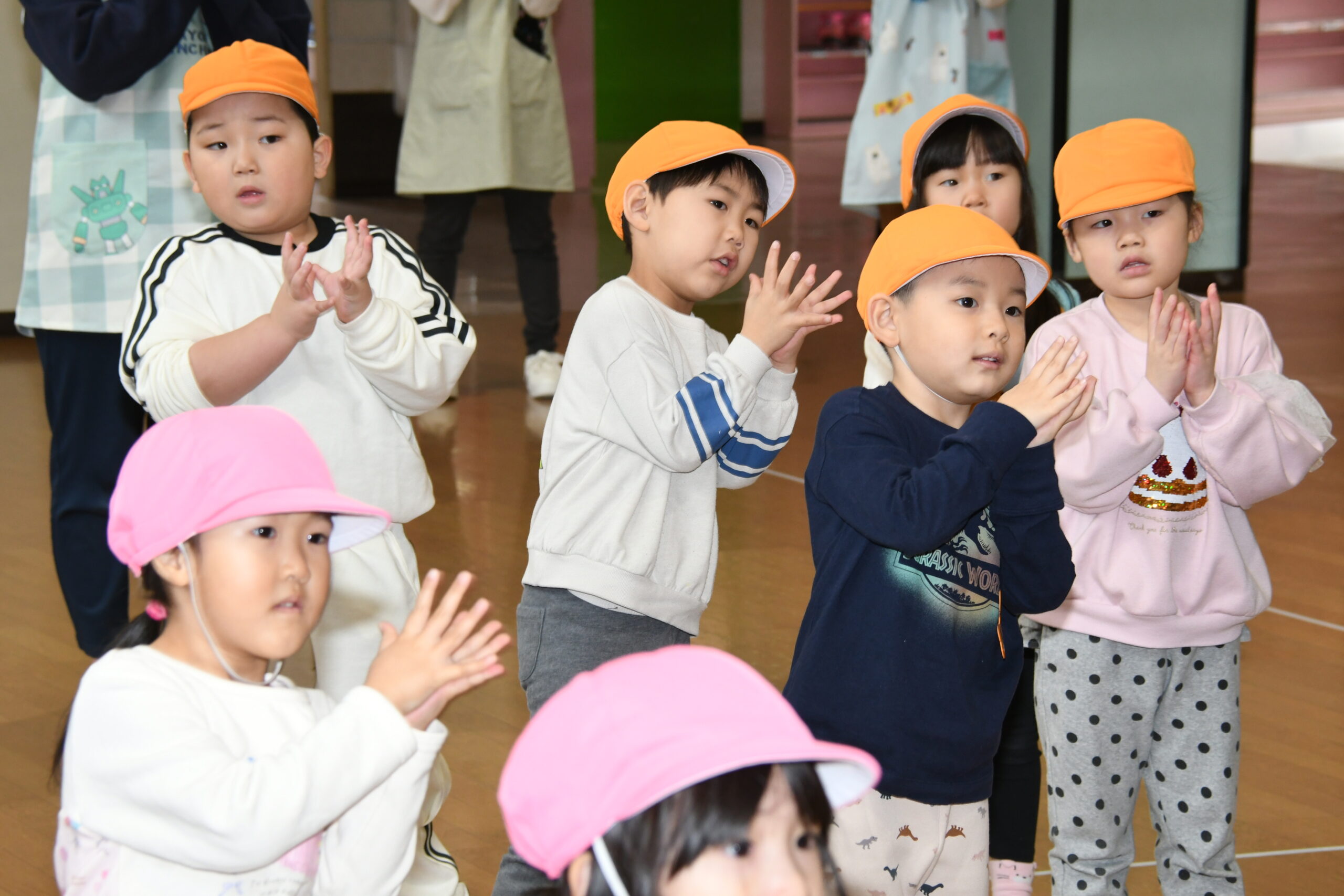 年少組のお友達も、お兄さんお姉さんのを見ながら、自分で考えた場所にそれぞれ飾りや丸折り紙を付けて、完成させて喜んで被っていました。