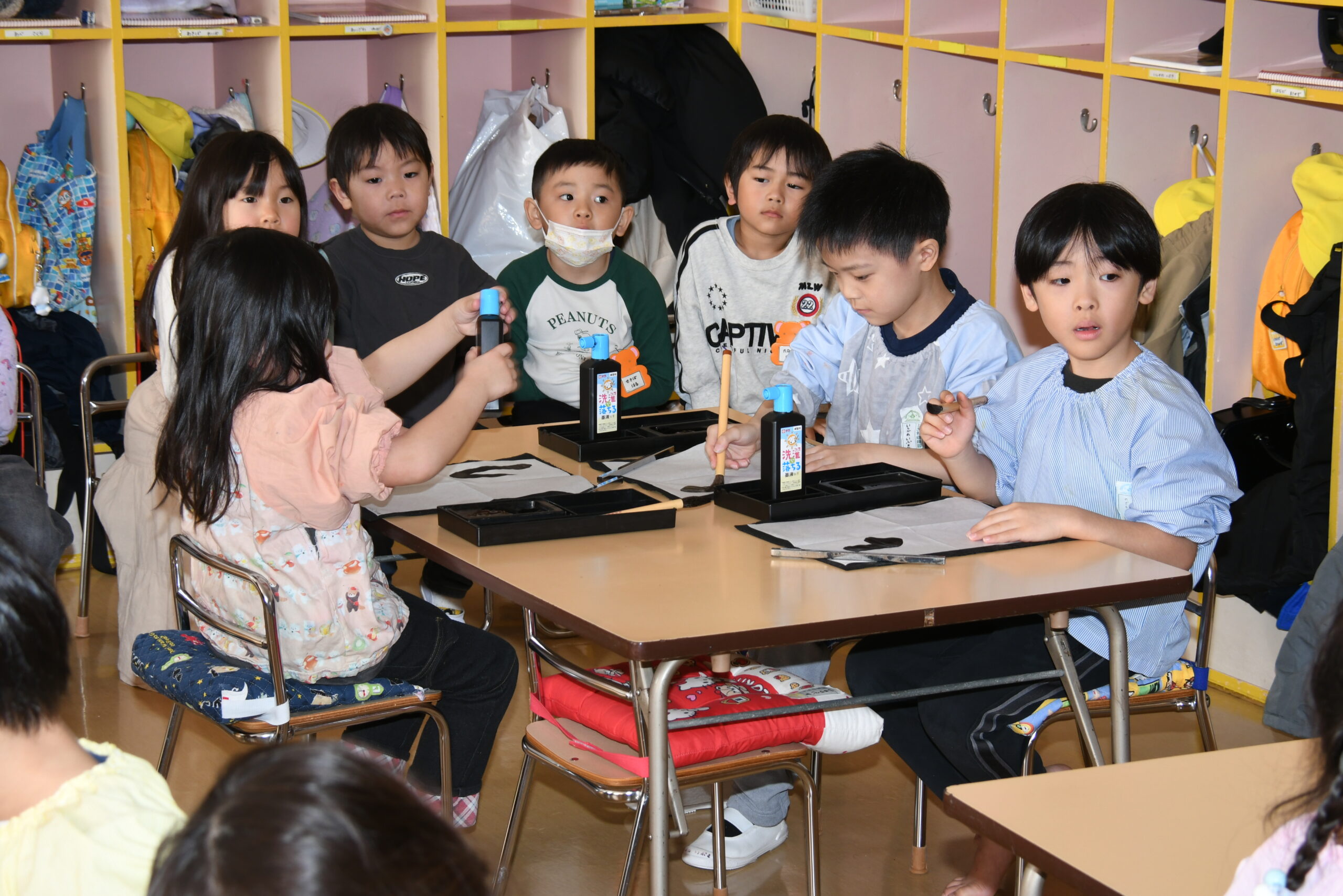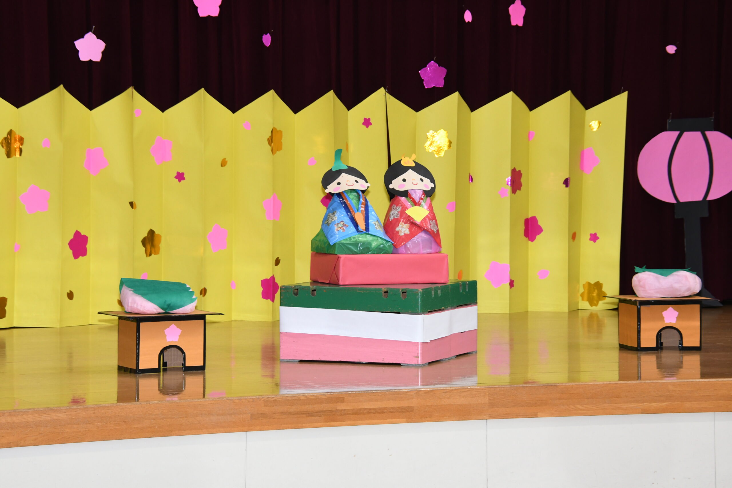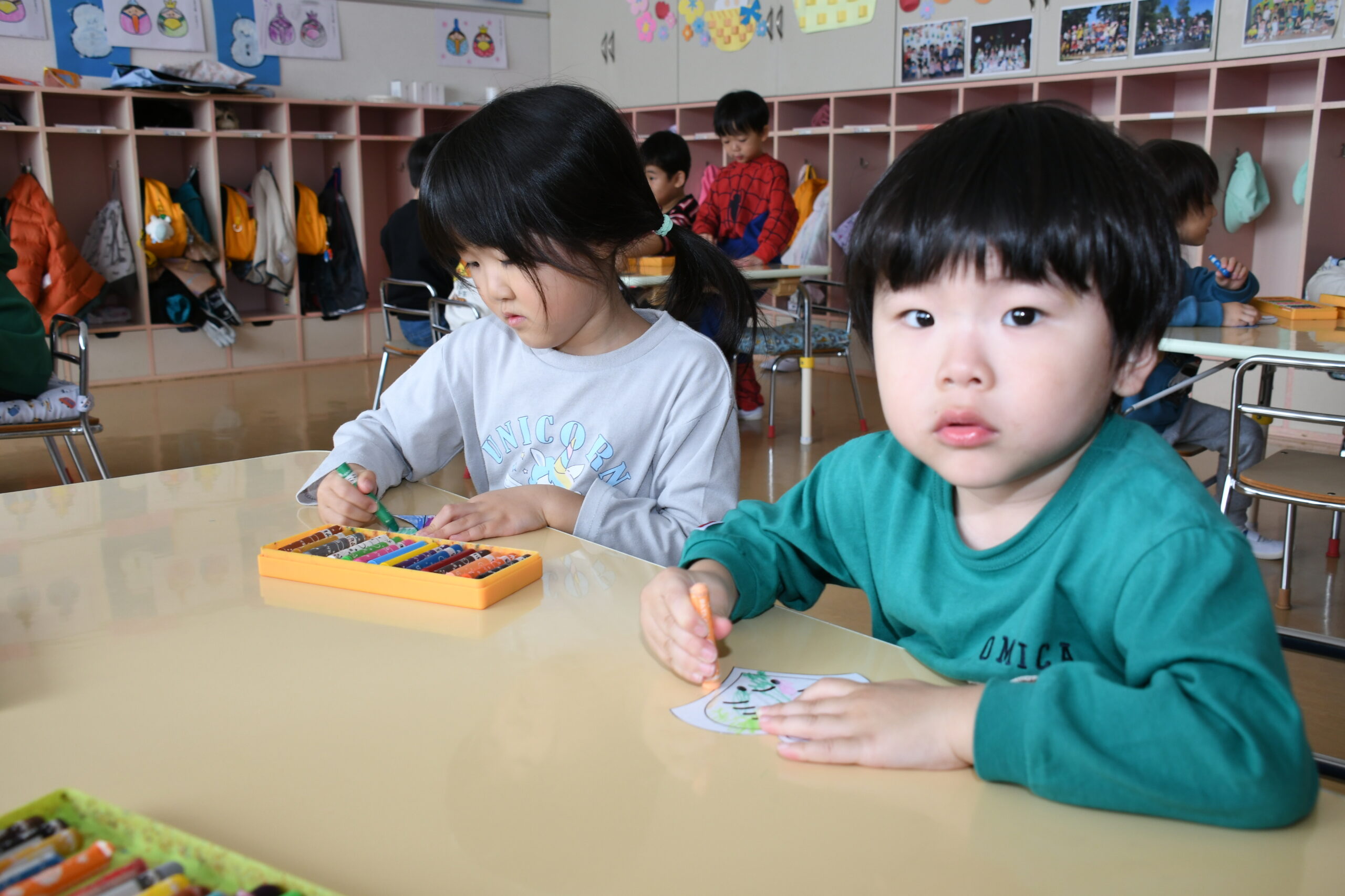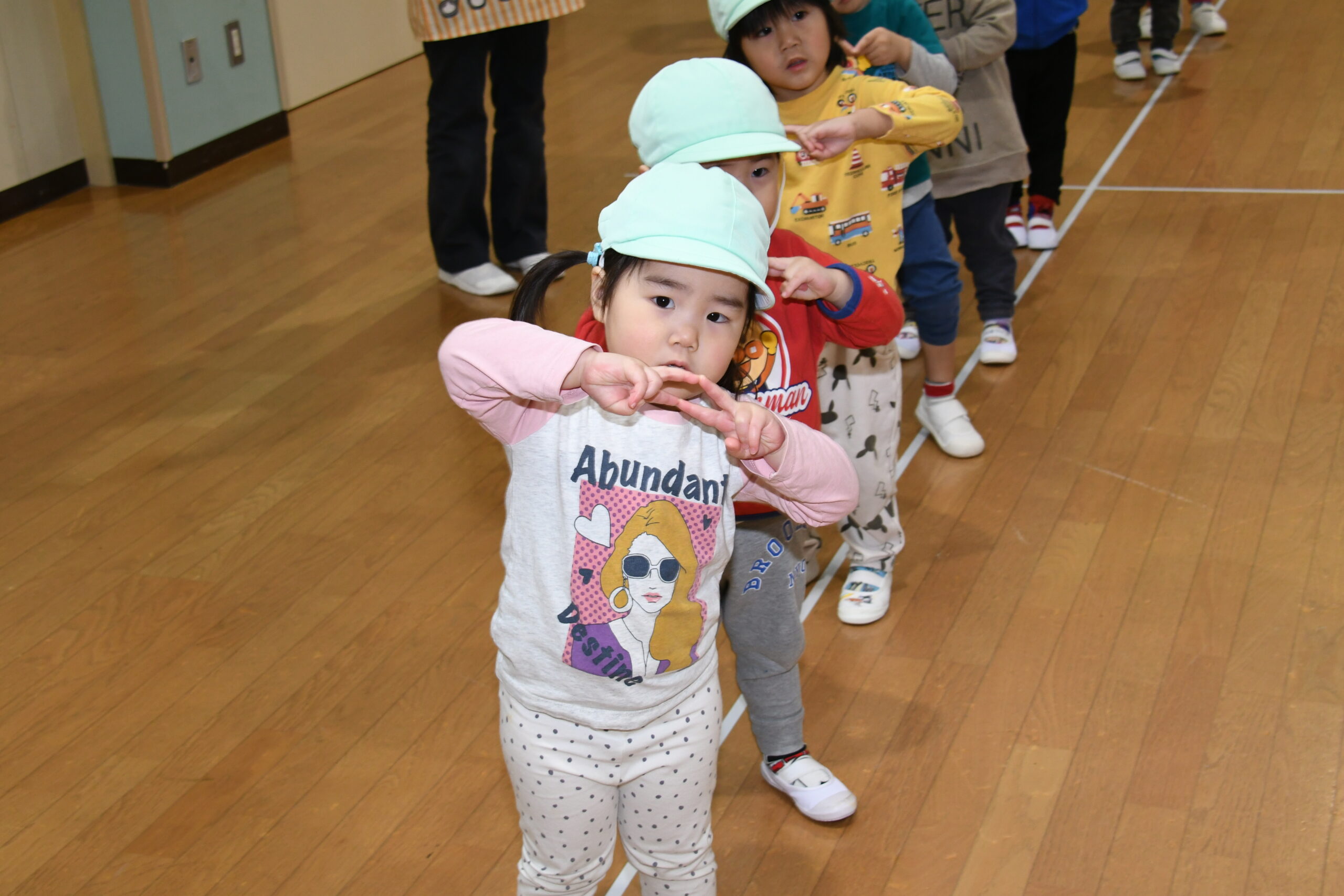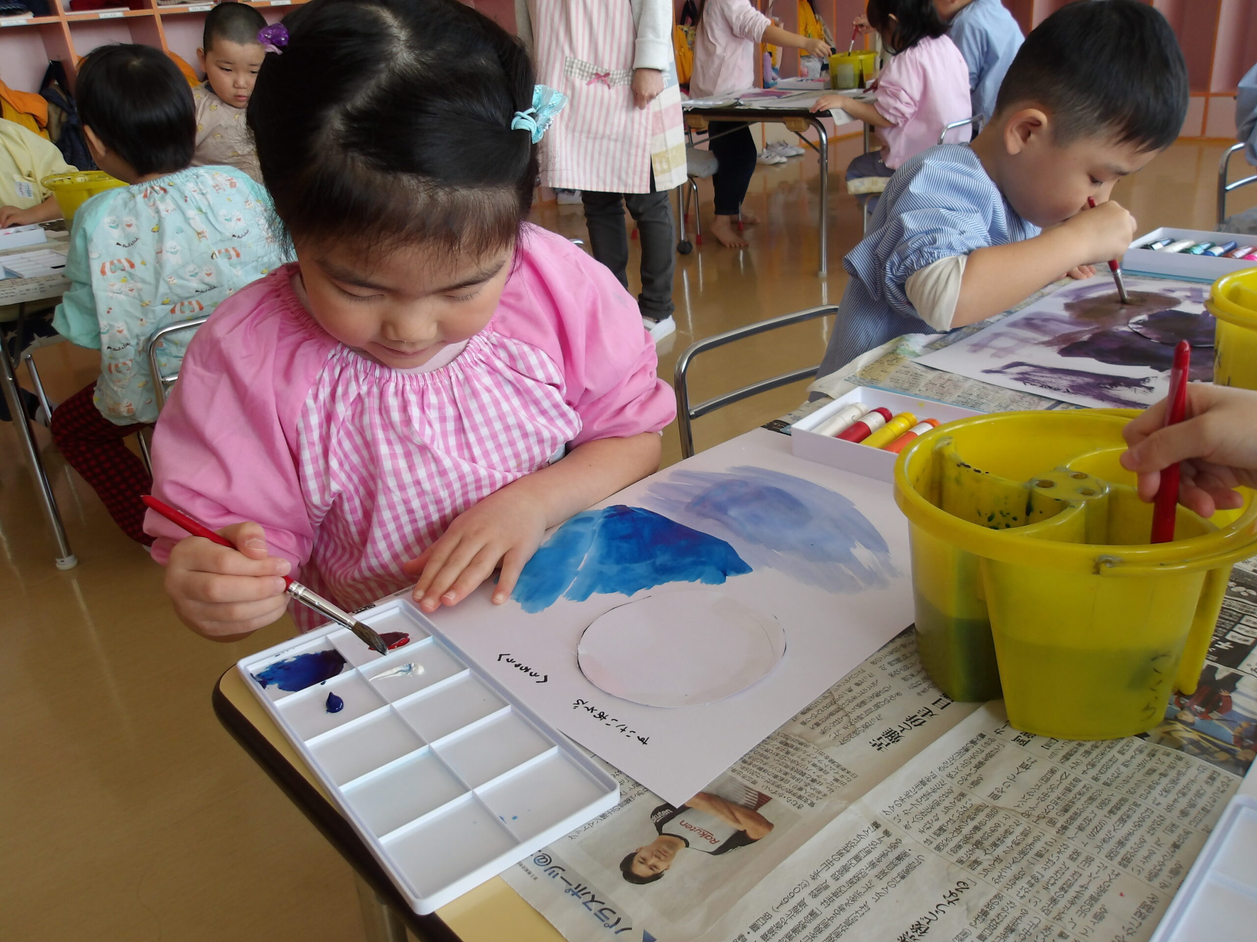 年少組のお友達も、お兄さんお姉さんのを見ながら、自分で考えた場所にそれぞれ飾りや丸折り紙を付けて、完成させて喜んで被っていました。
