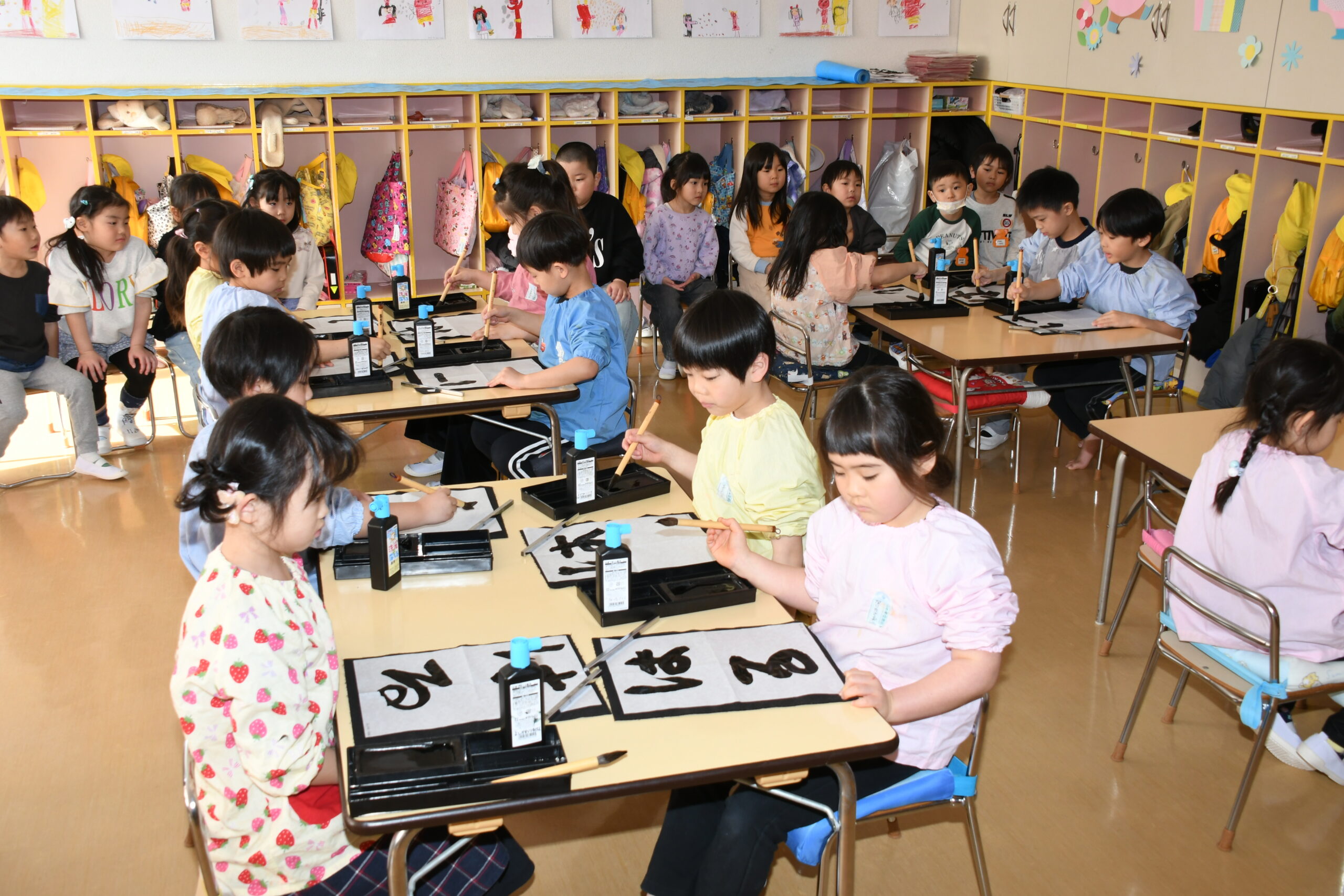 黒板に貼っているお手本を見て、止める、はらう、はねる等を意識して筆を動かして取り組みました。