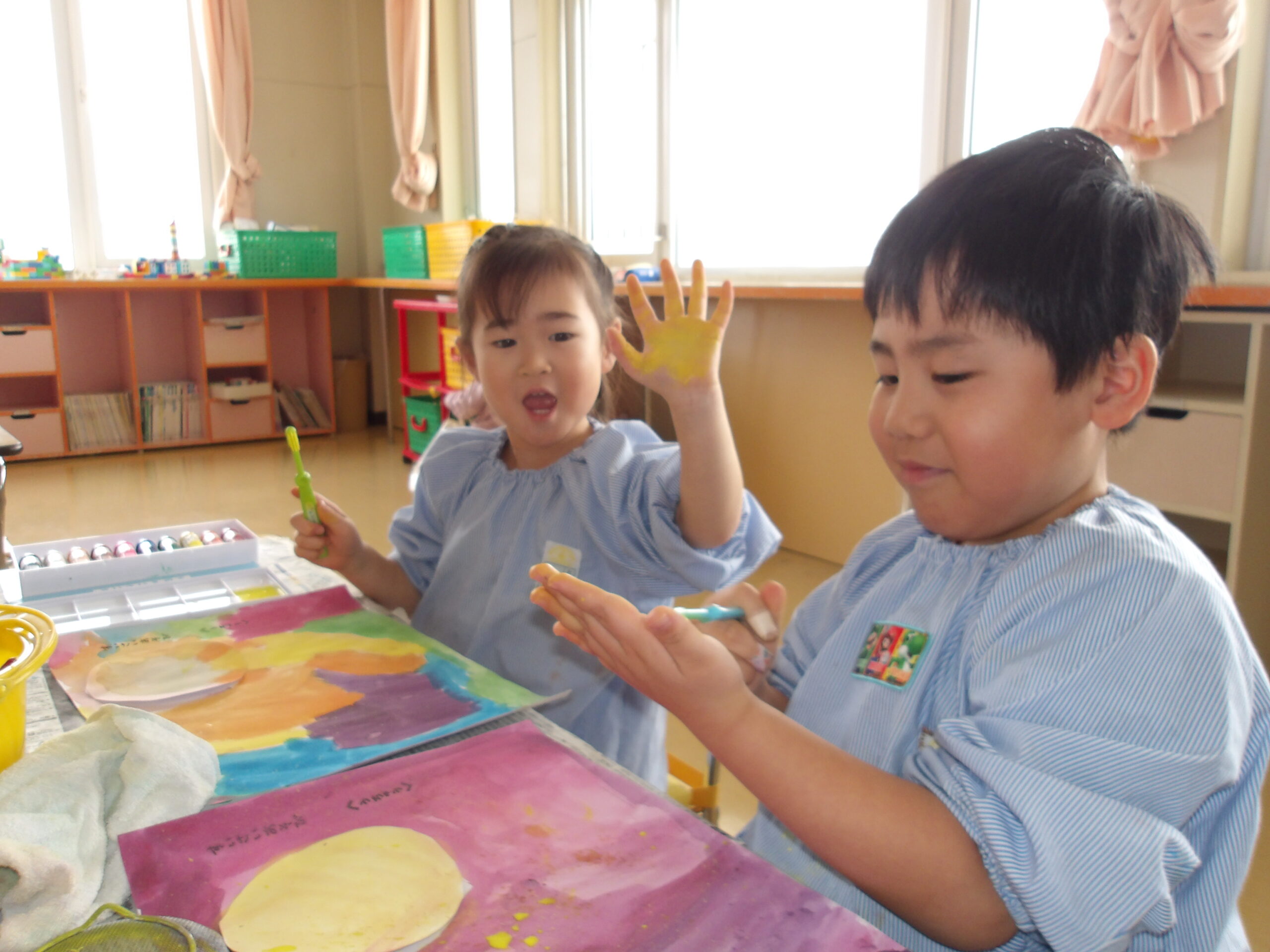 出来上がったスライムを丸めて『おまんじゅう』や『お肉』等食べ物に見立てたり、机に広げてキャラクターやハートマークを作ったり、とても集中して遊ぶことが出来ました。