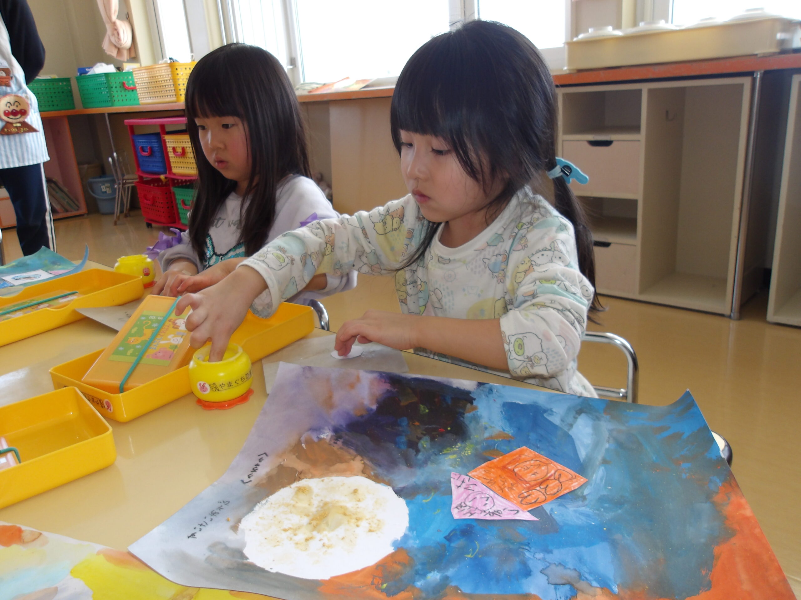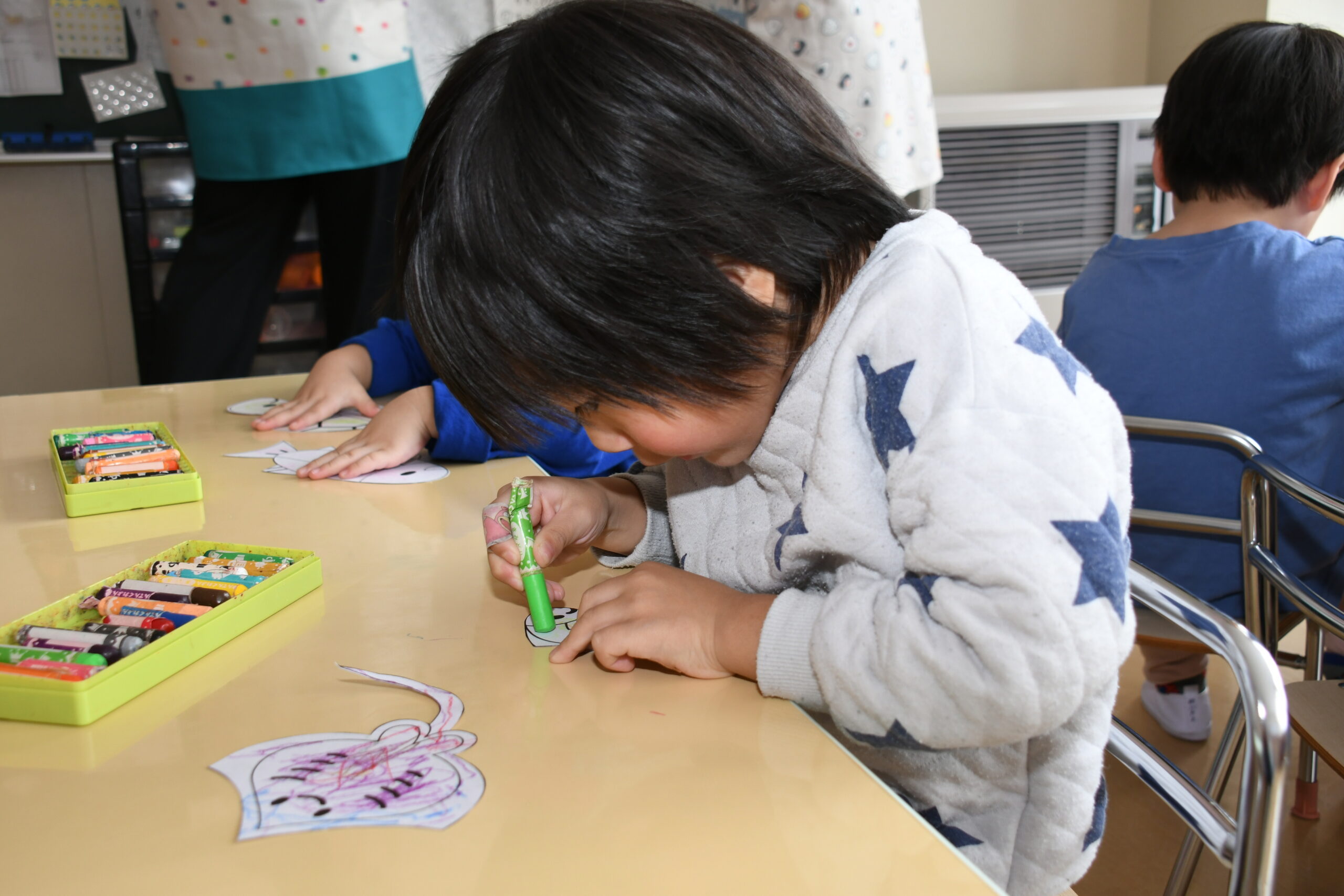 年長組は、靴下、ジンジャーマン、キャンディーの色を塗り、星もハサミで上手にきり取りました。