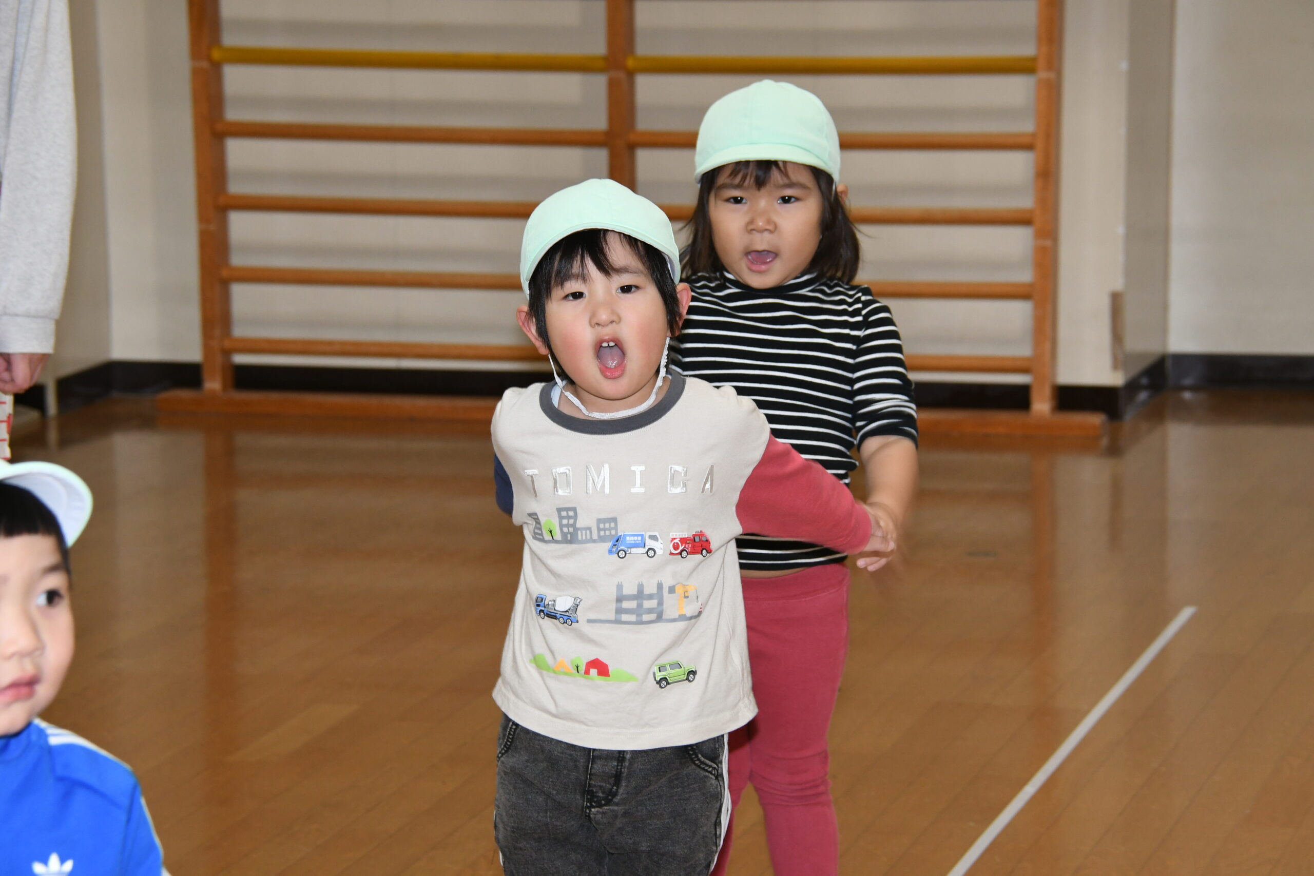二人3人で一緒に手を繋いだお友達とまずは、マットのお山上り -
