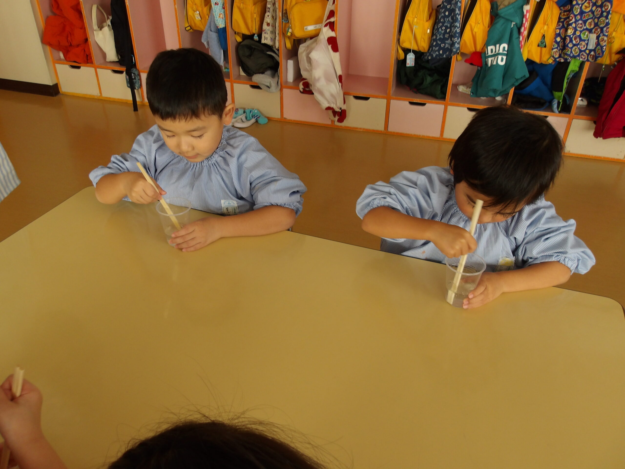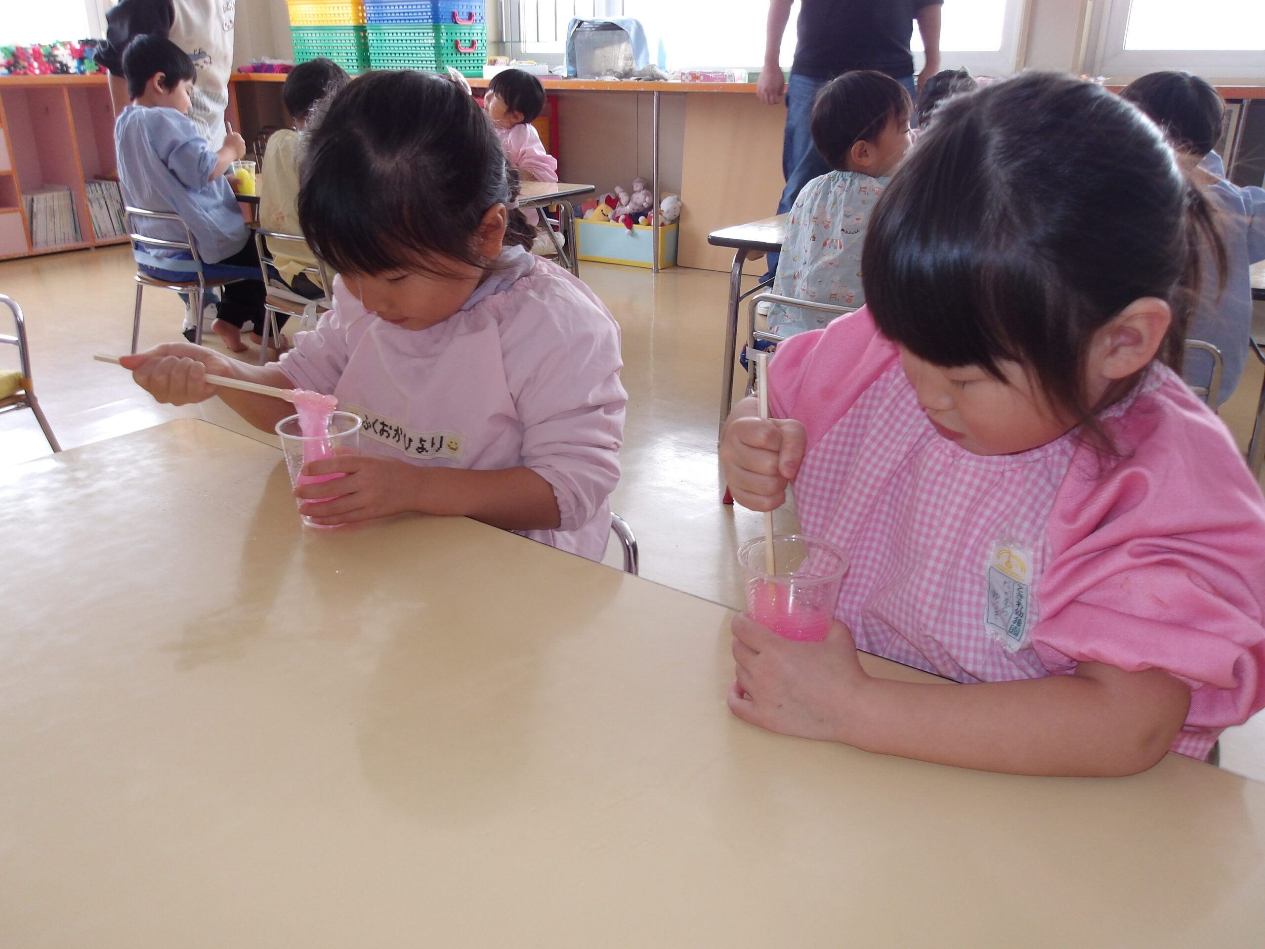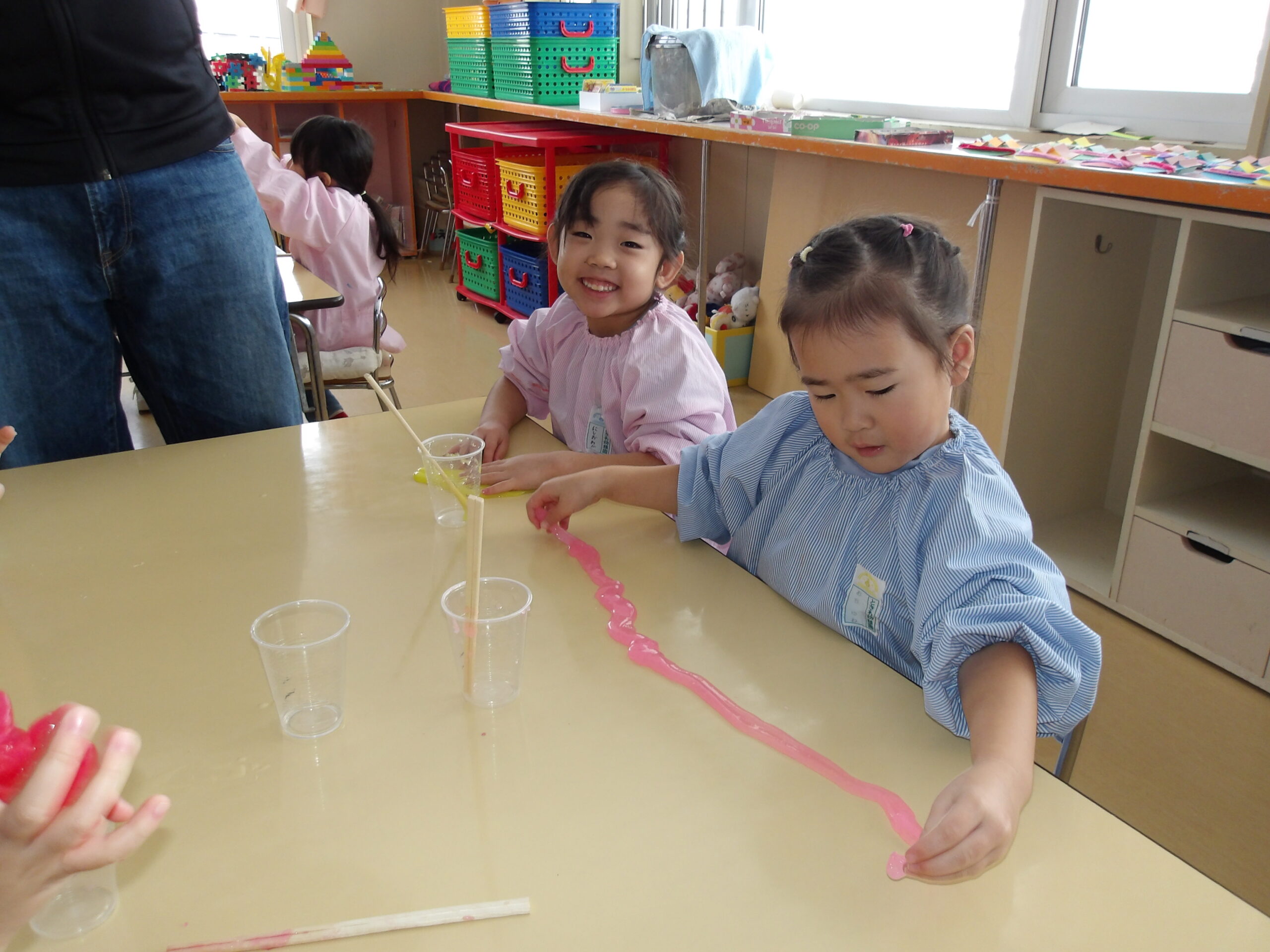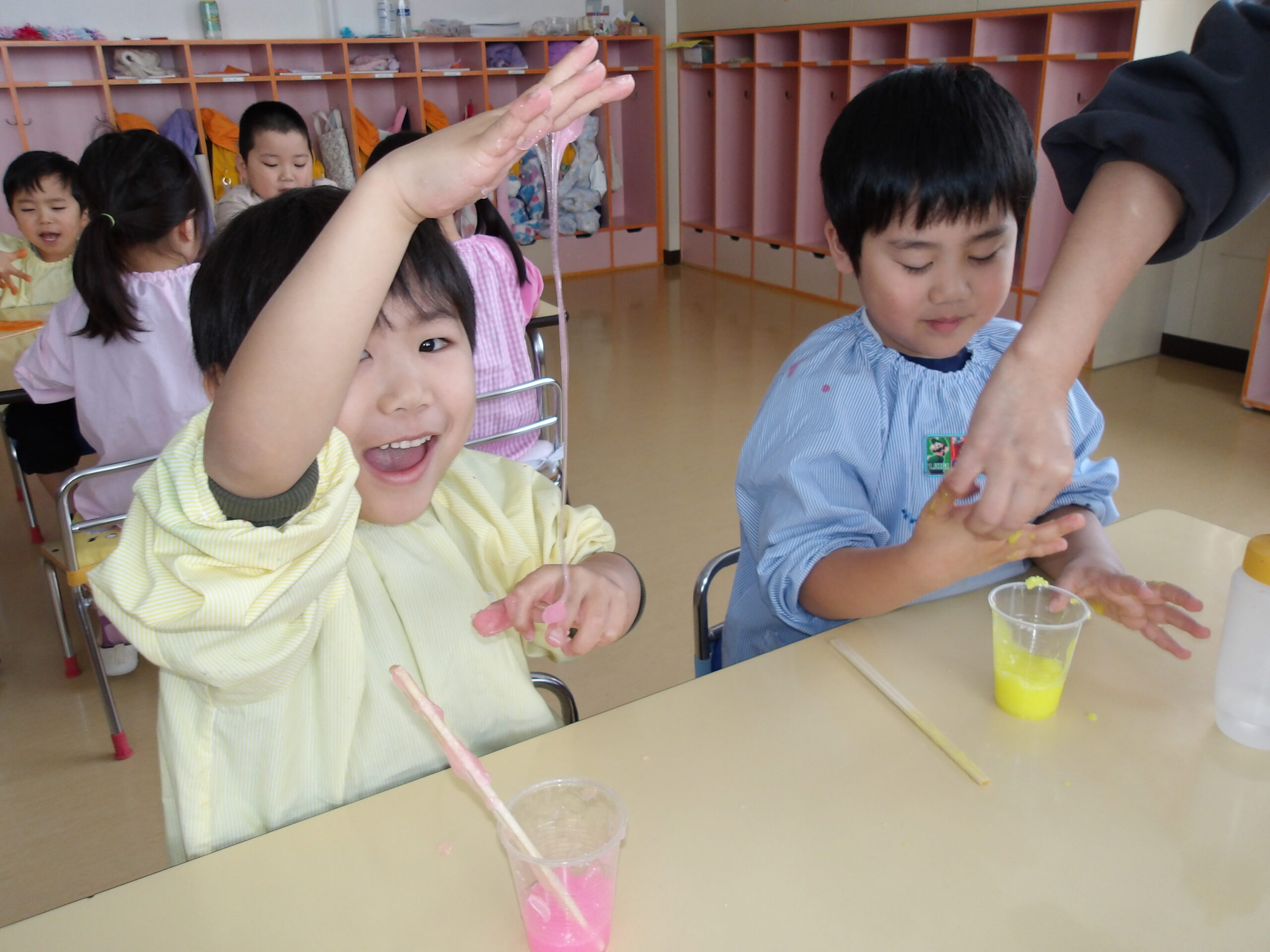 自分たちで材料を混ぜ、スライムを作って遊びました。