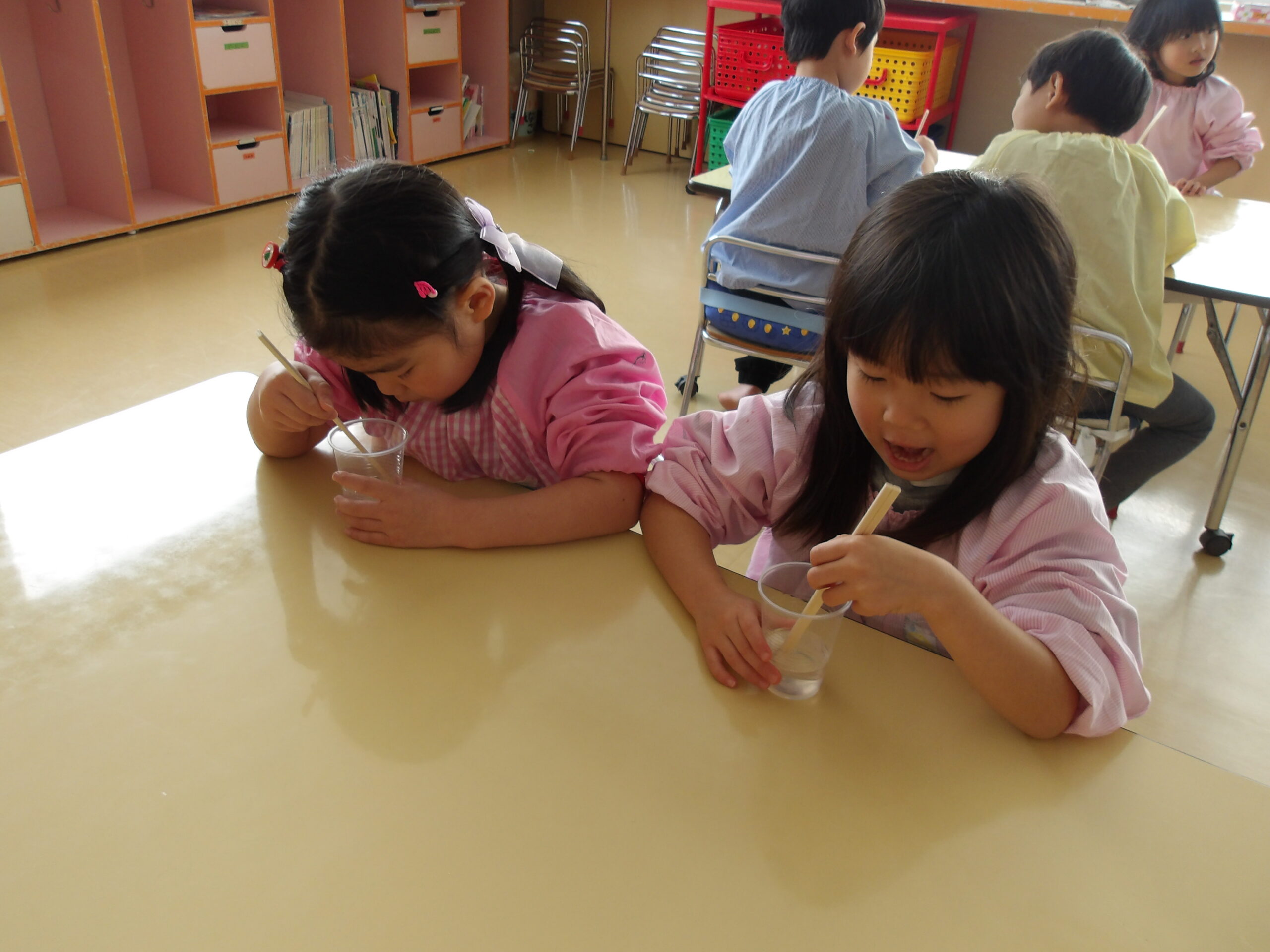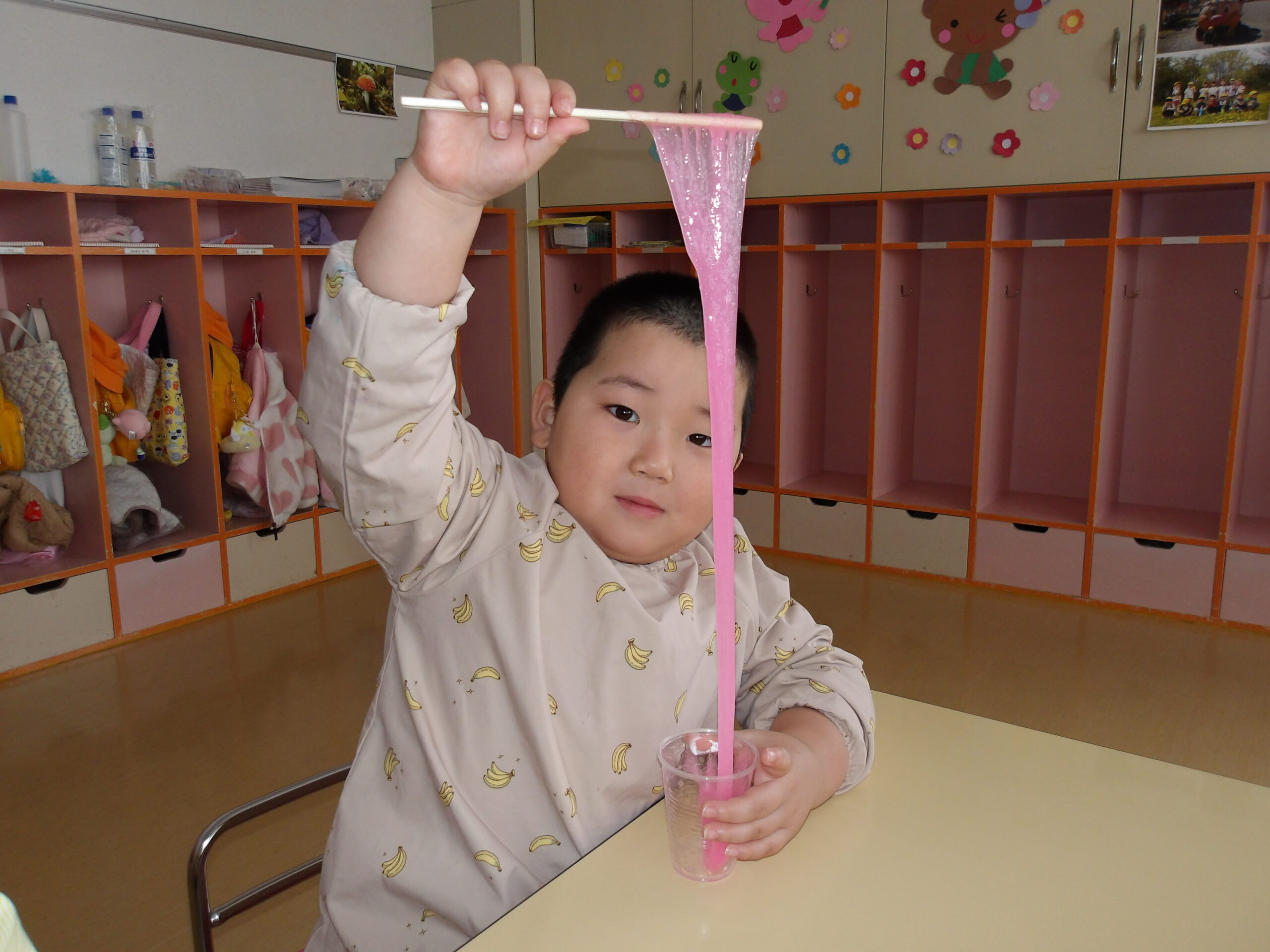 以前から「スライムで遊びたい!」と楽しみにしていたこともあり、朝から「今日はスライム作るんだよね!」とウキウキワクワクのお友達。