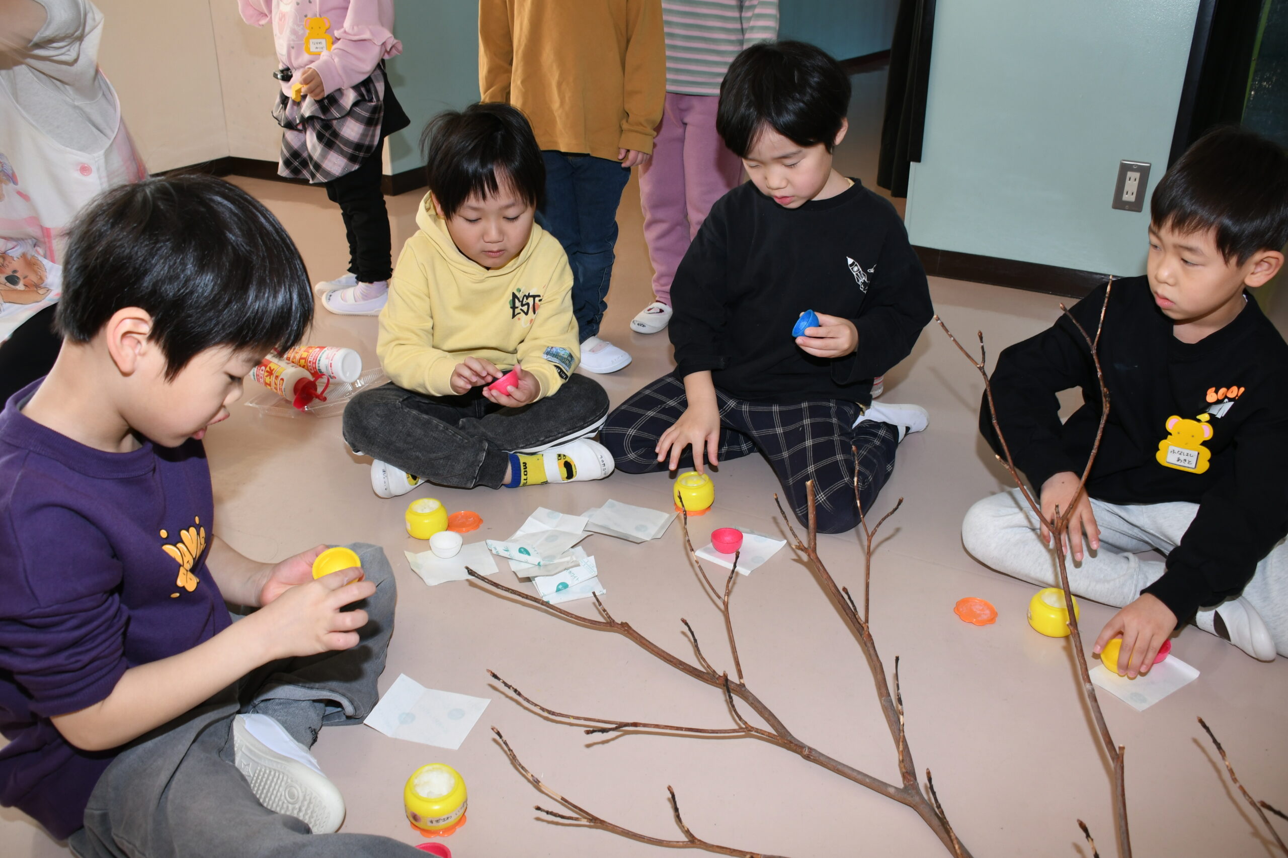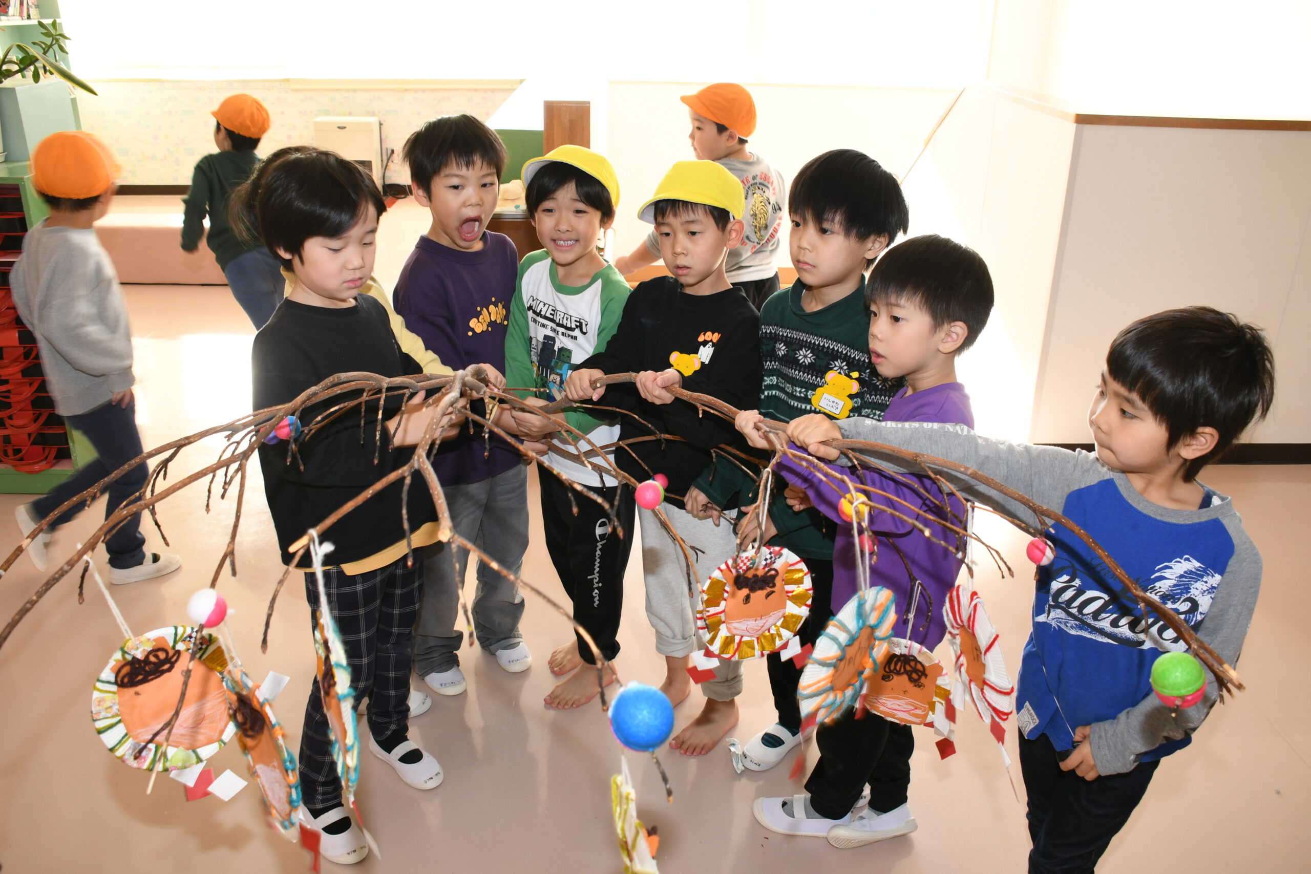ほし組は、「たい」年齢ごとに作った作品をみずきに飾りつけしました。