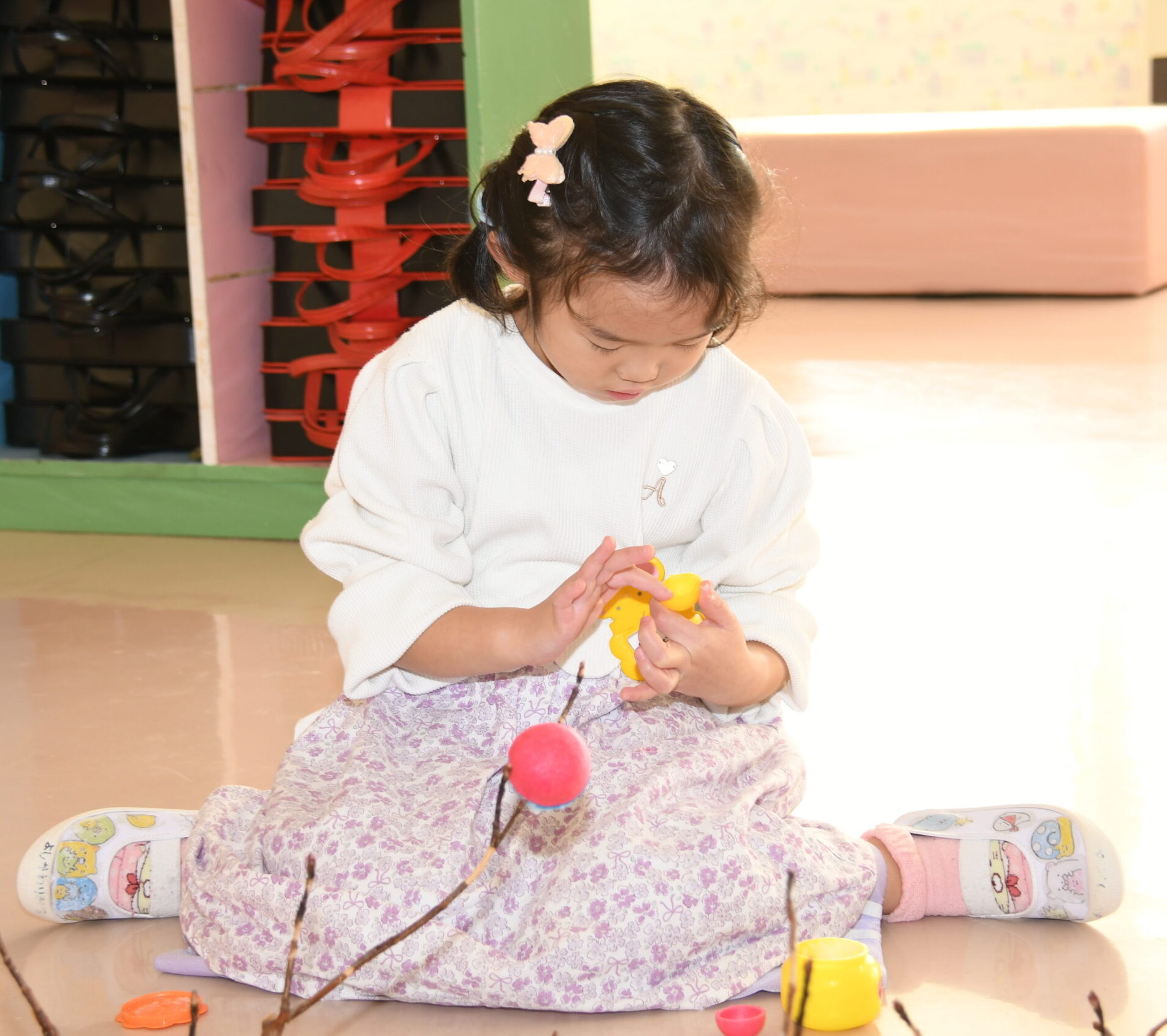 出来上がったスライムを丸めて『おまんじゅう』や『お肉』等食べ物に見立てたり、机に広げてキャラクターやハートマークを作ったり、とても集中して遊ぶことが出来ました。