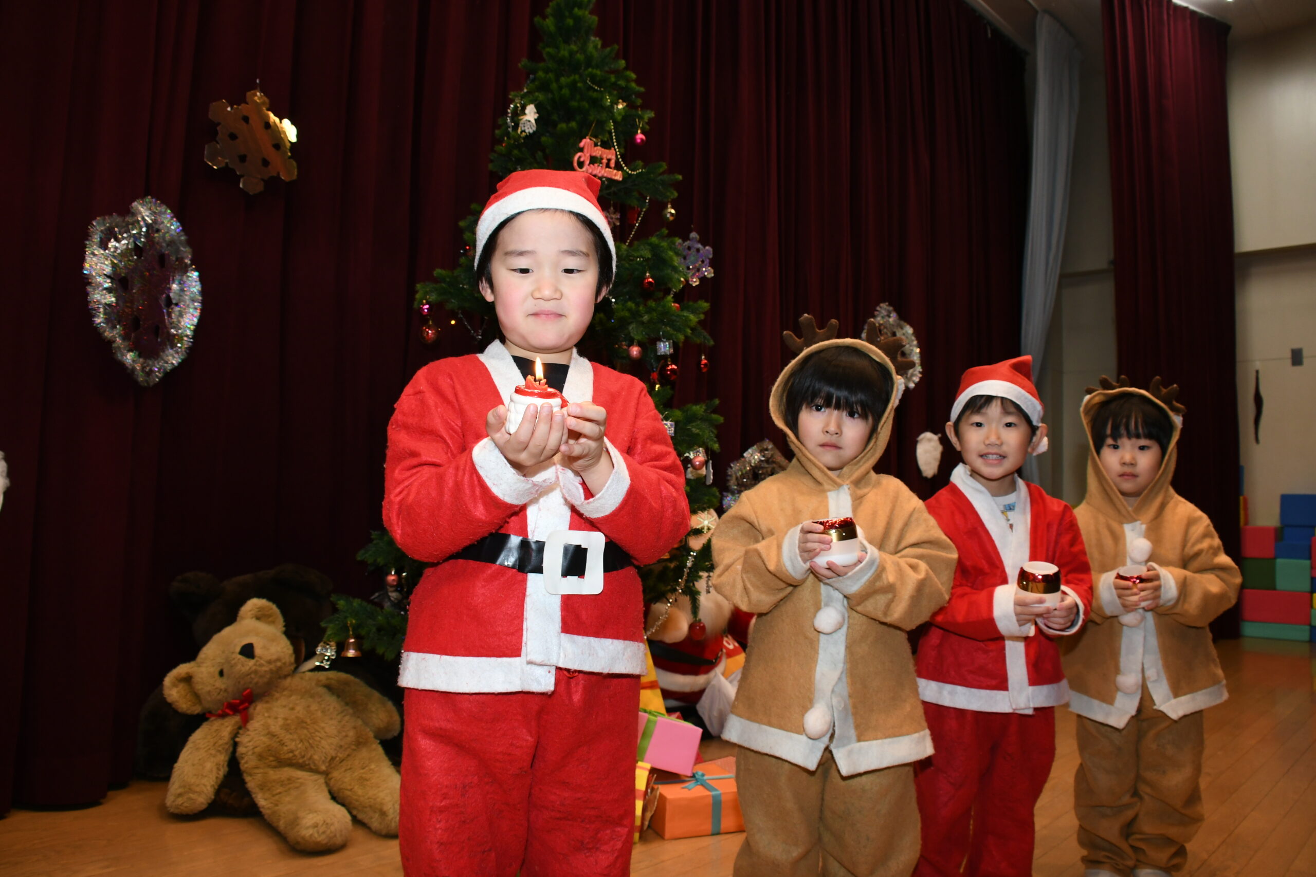 「メリークリスマス」の掛け声で幕が開くと、ステージの上にお当番さんがサンタクロースとトナカイに変身しキャンドルサービスで、クリスマス会がスタート!