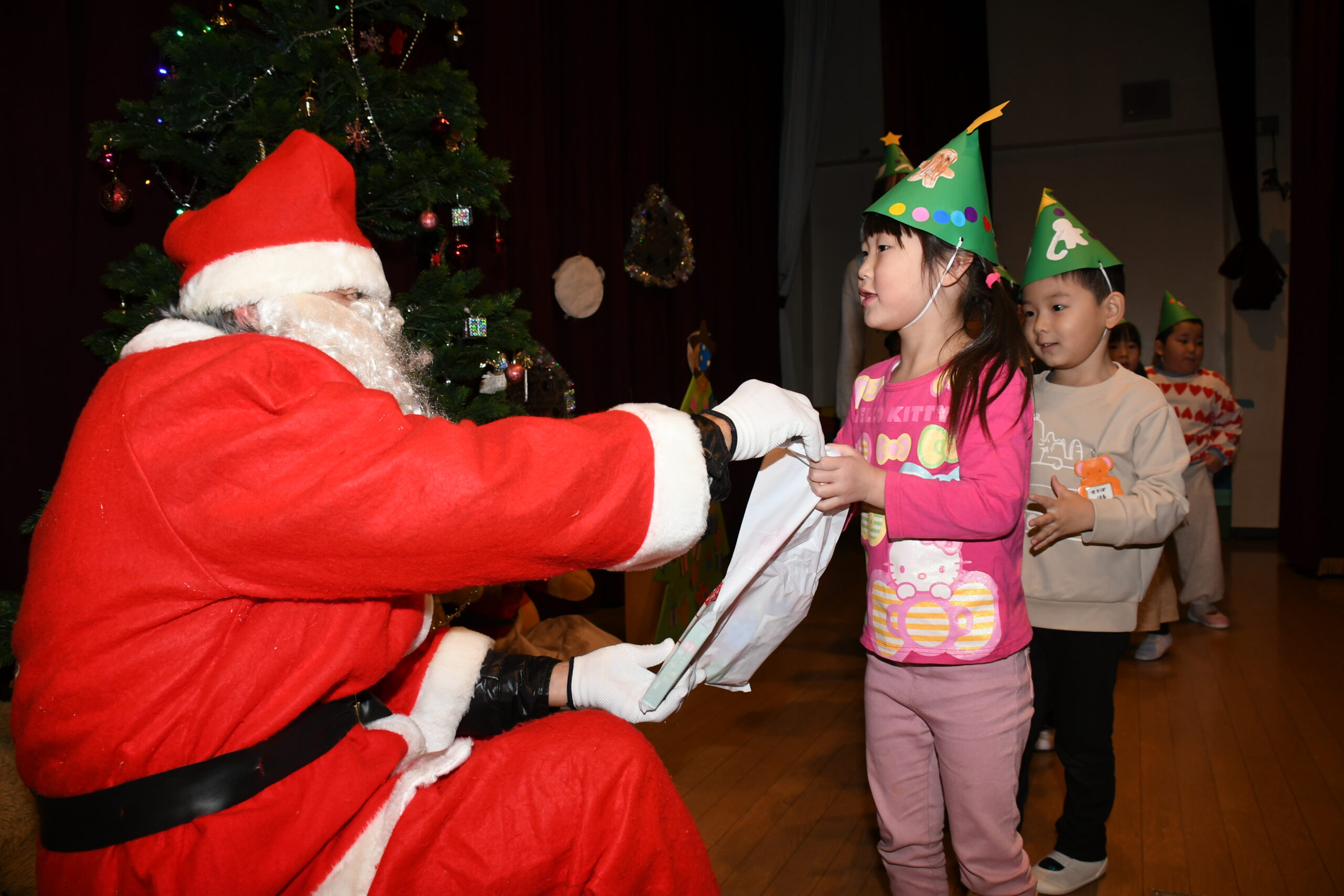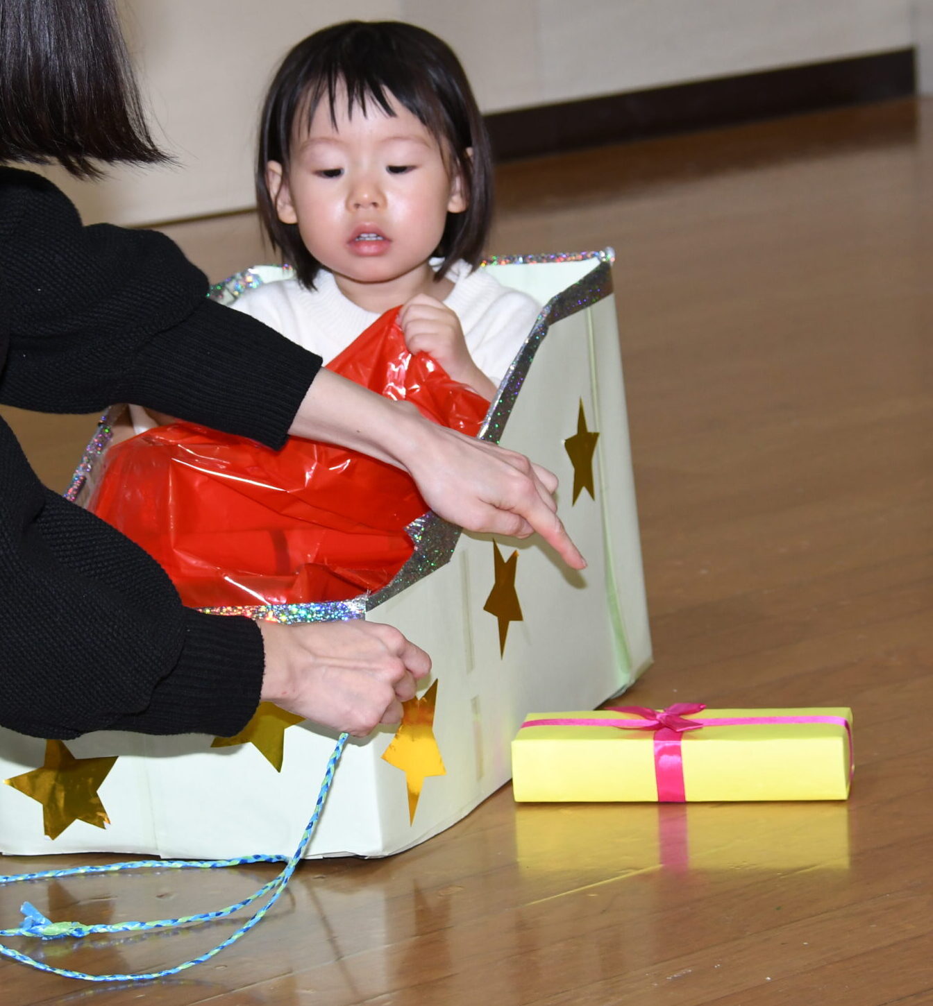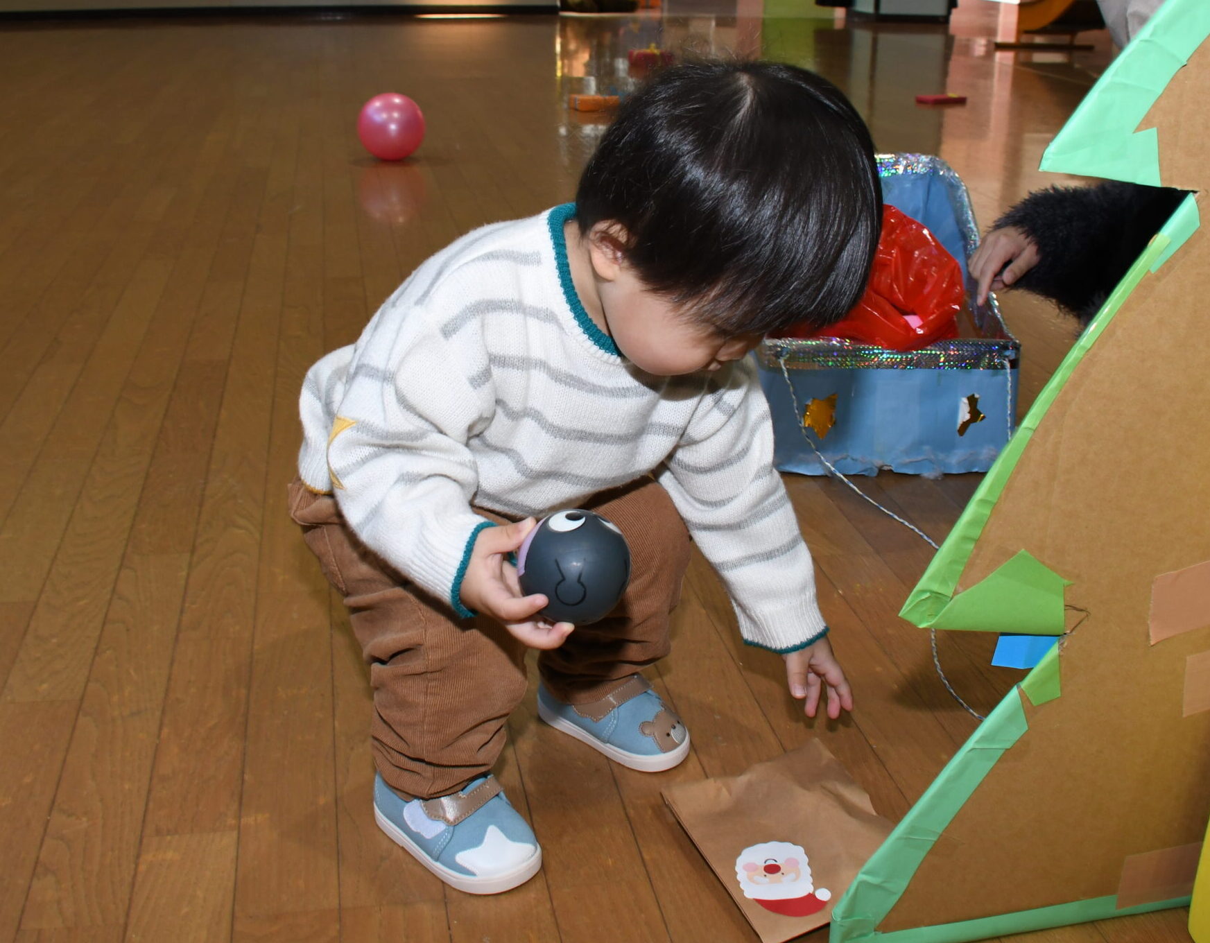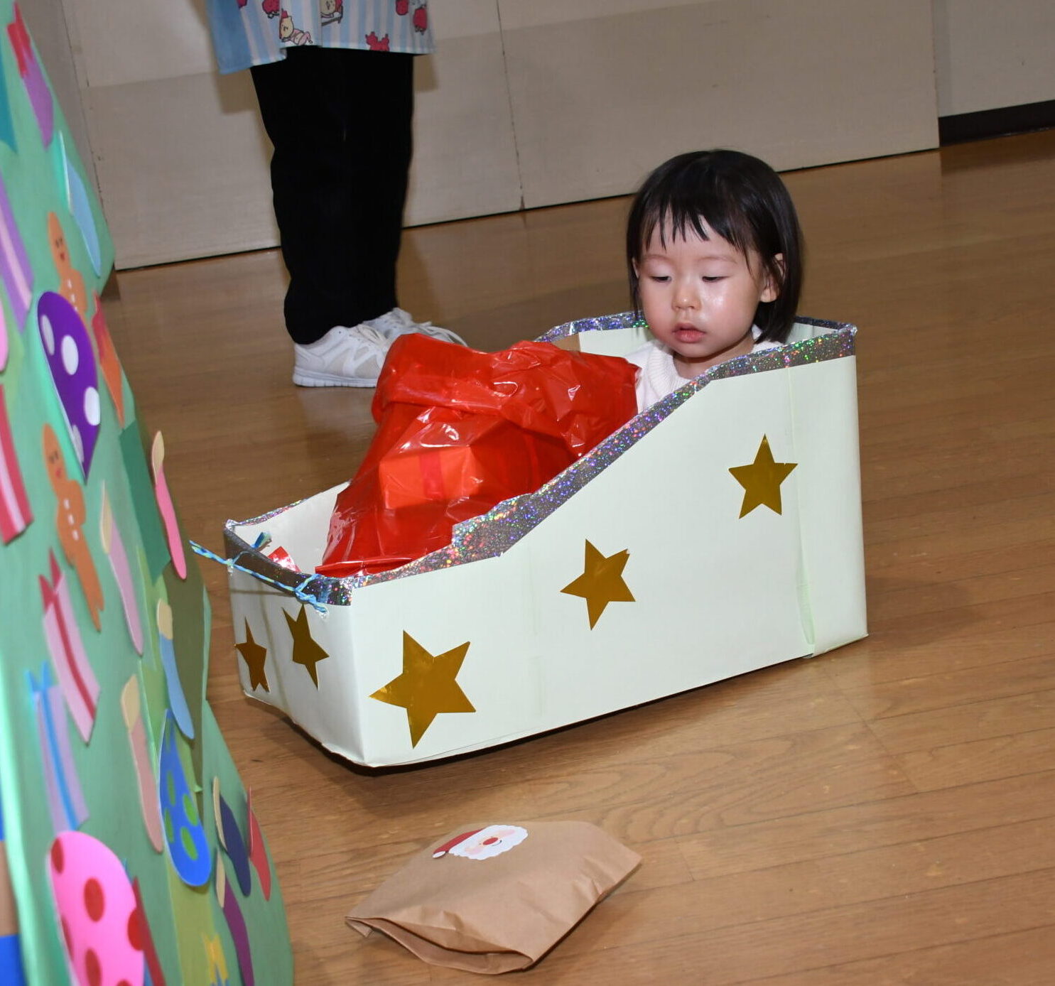 1歳のお友達 しっかりサンタさんを見つめてありがとうと頭を下げてお辞儀ができていました -