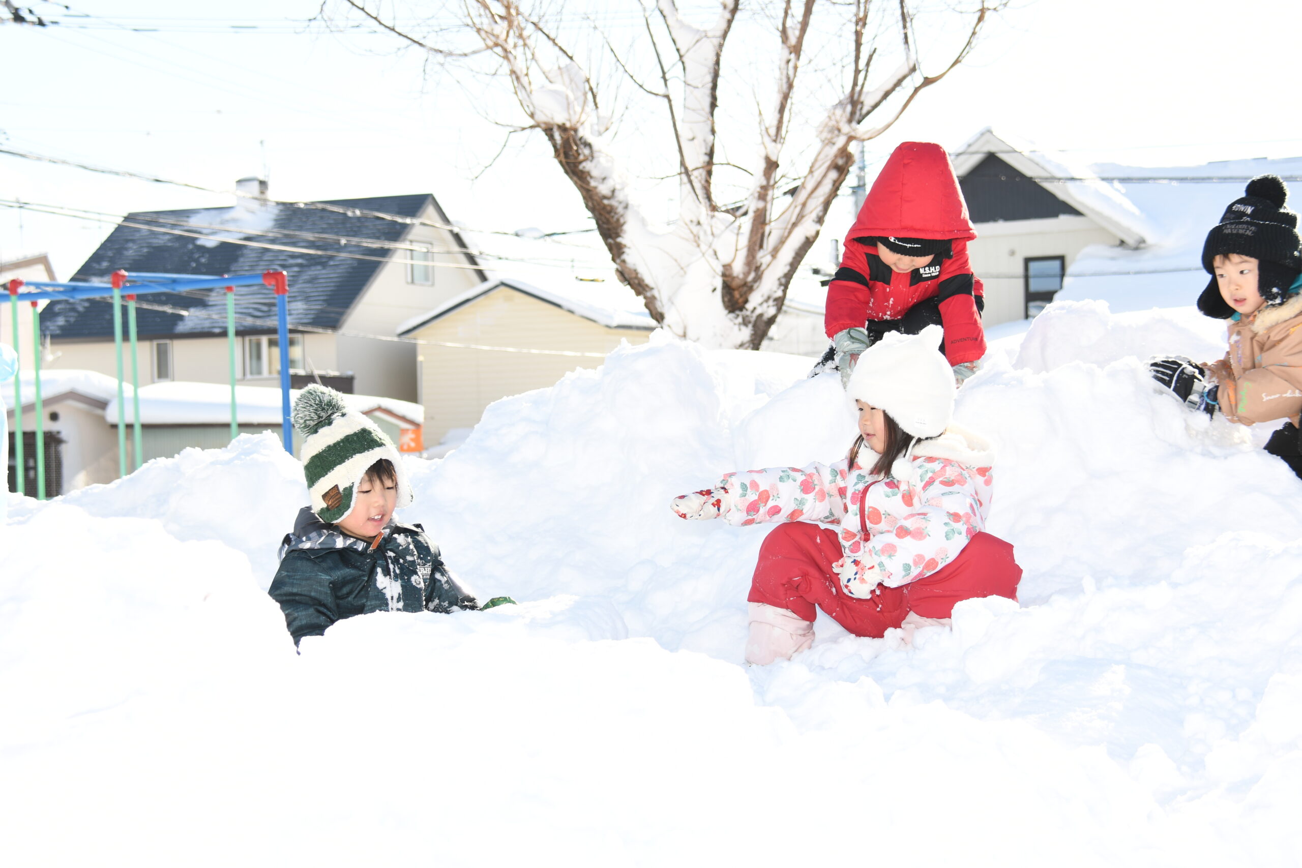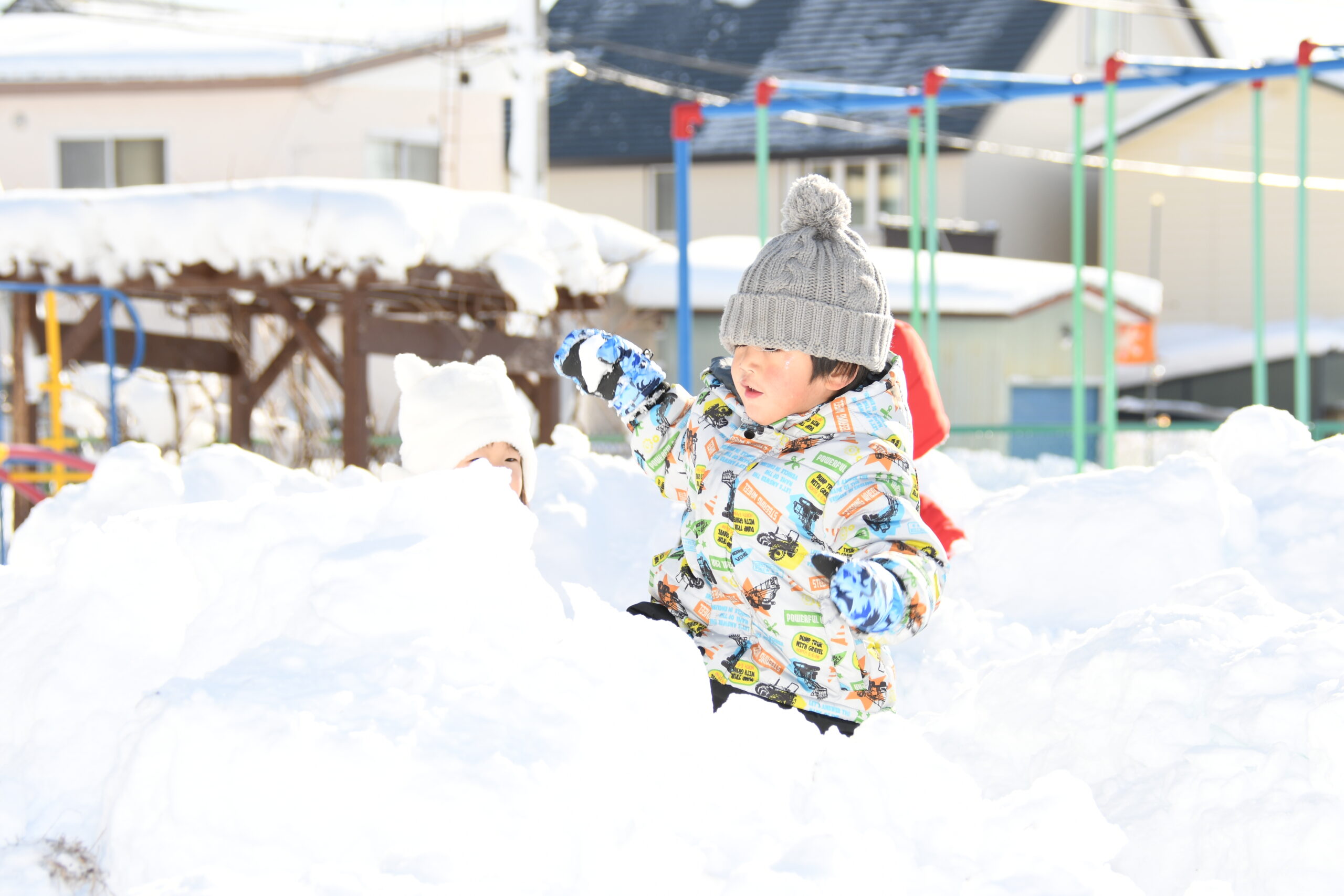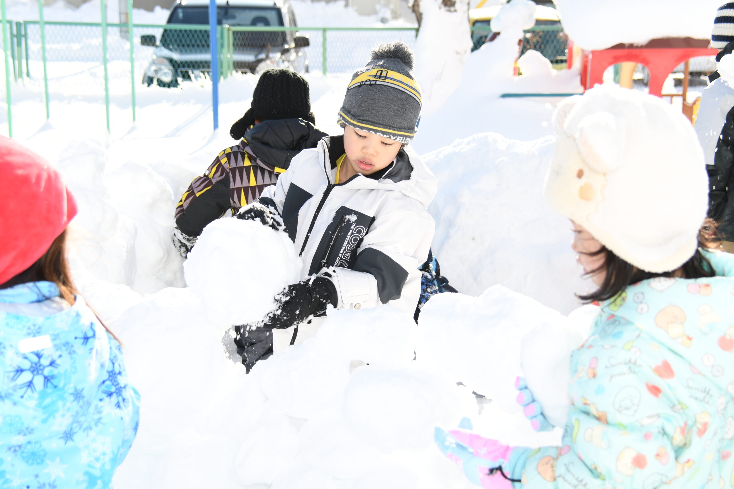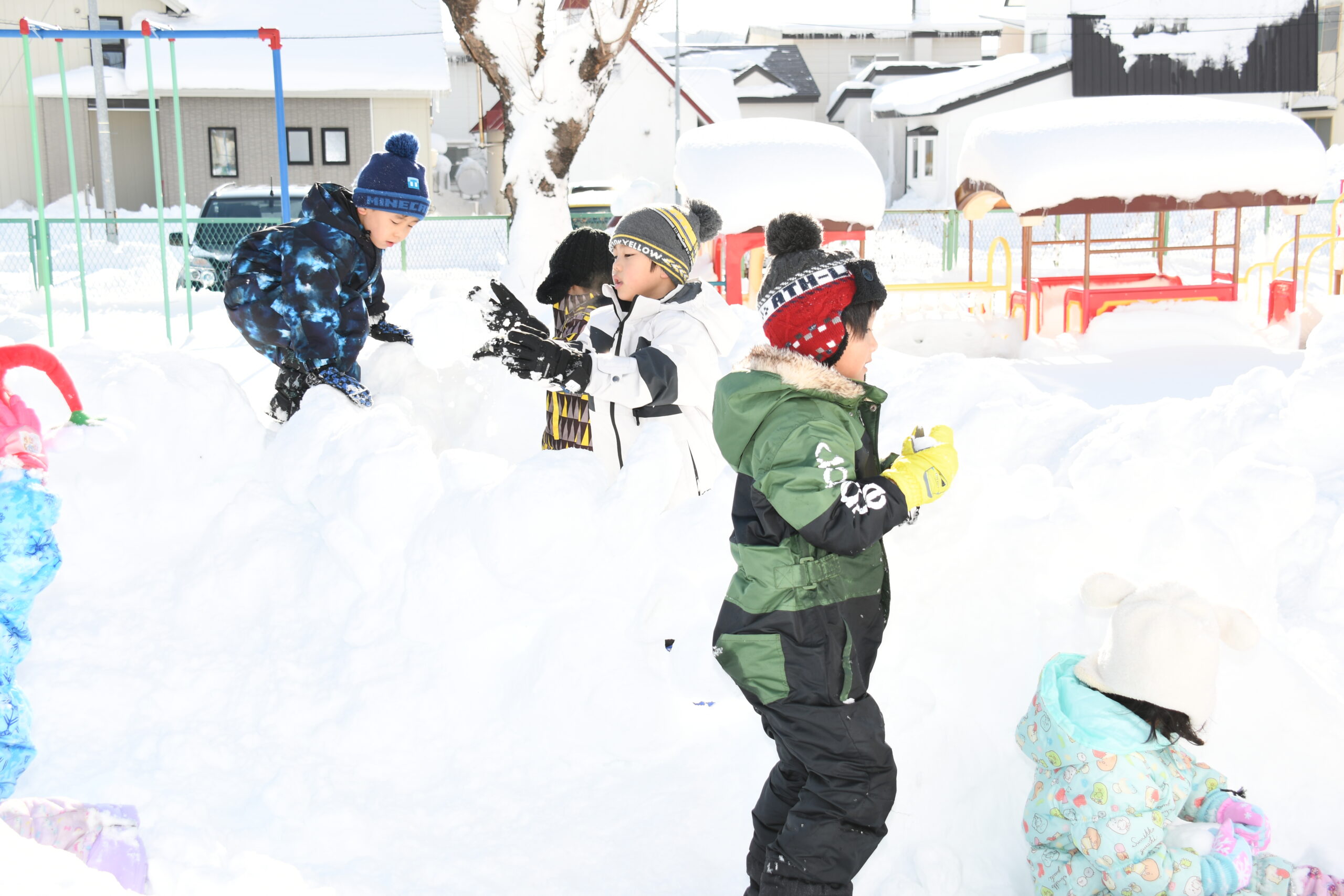 時折深く積もった雪に「足が抜けなくなっちゃった~」と困ったように話しながらも、雪だるま作り、かまくら作り、トンネル作り、雪合戦…ずっと待ちわびていた雪とのふれあいに笑顔と楽し気な声が晴天の下に響いていました。