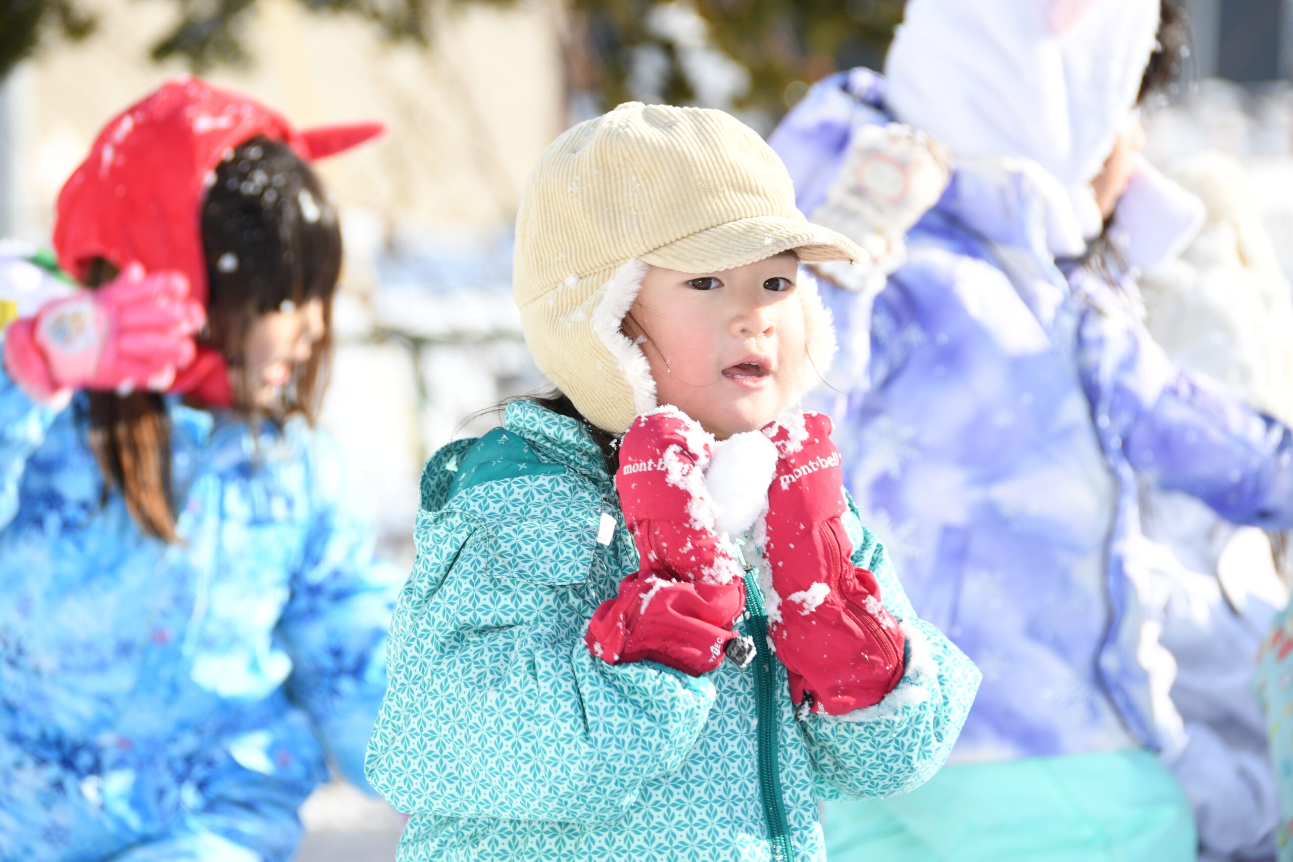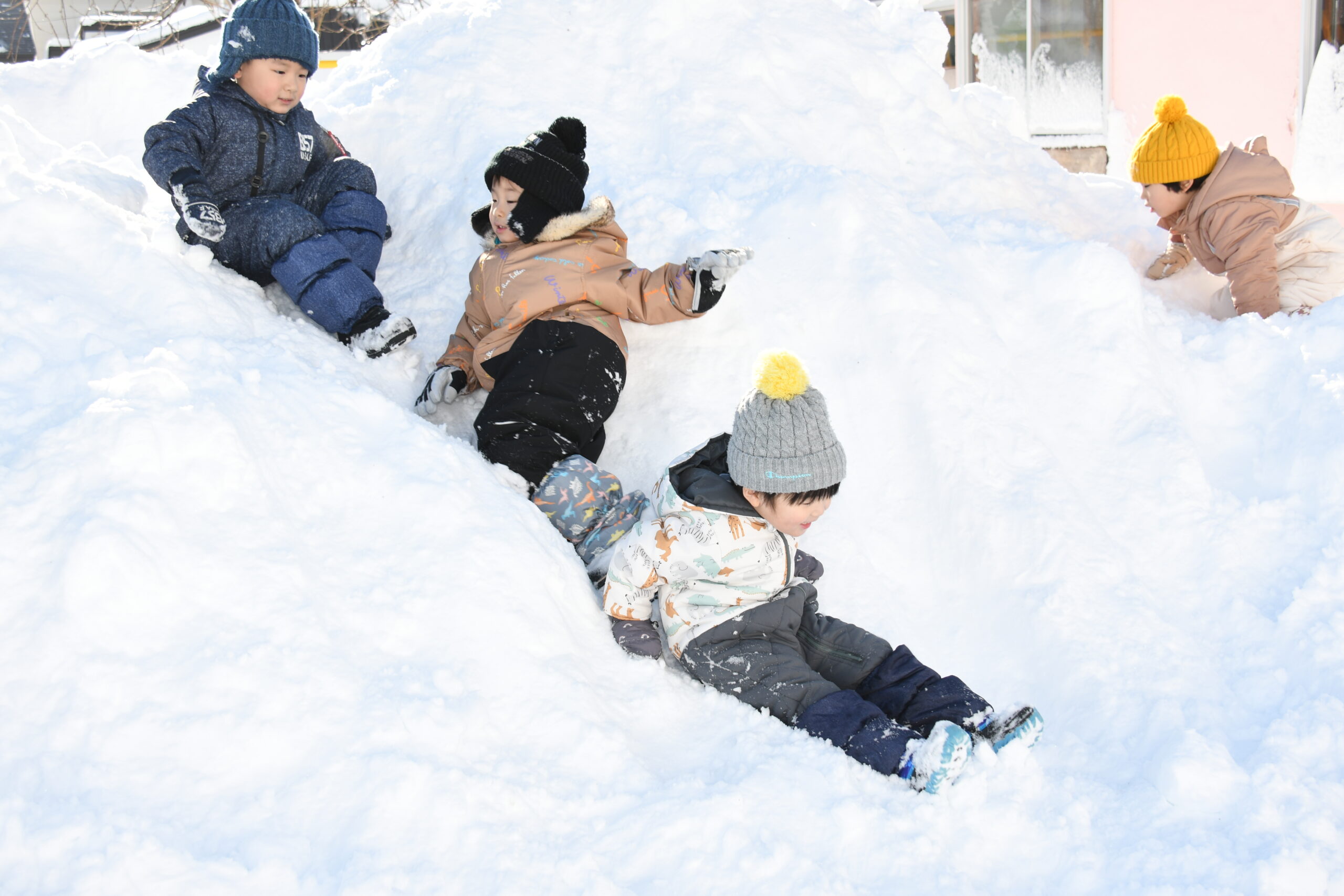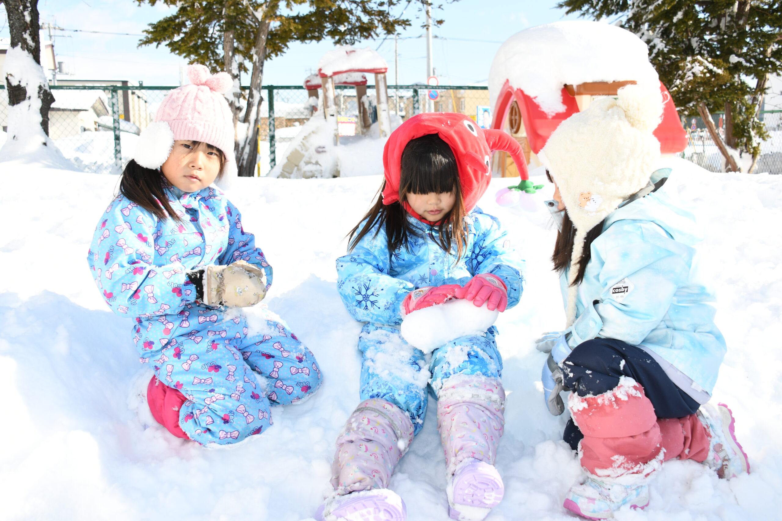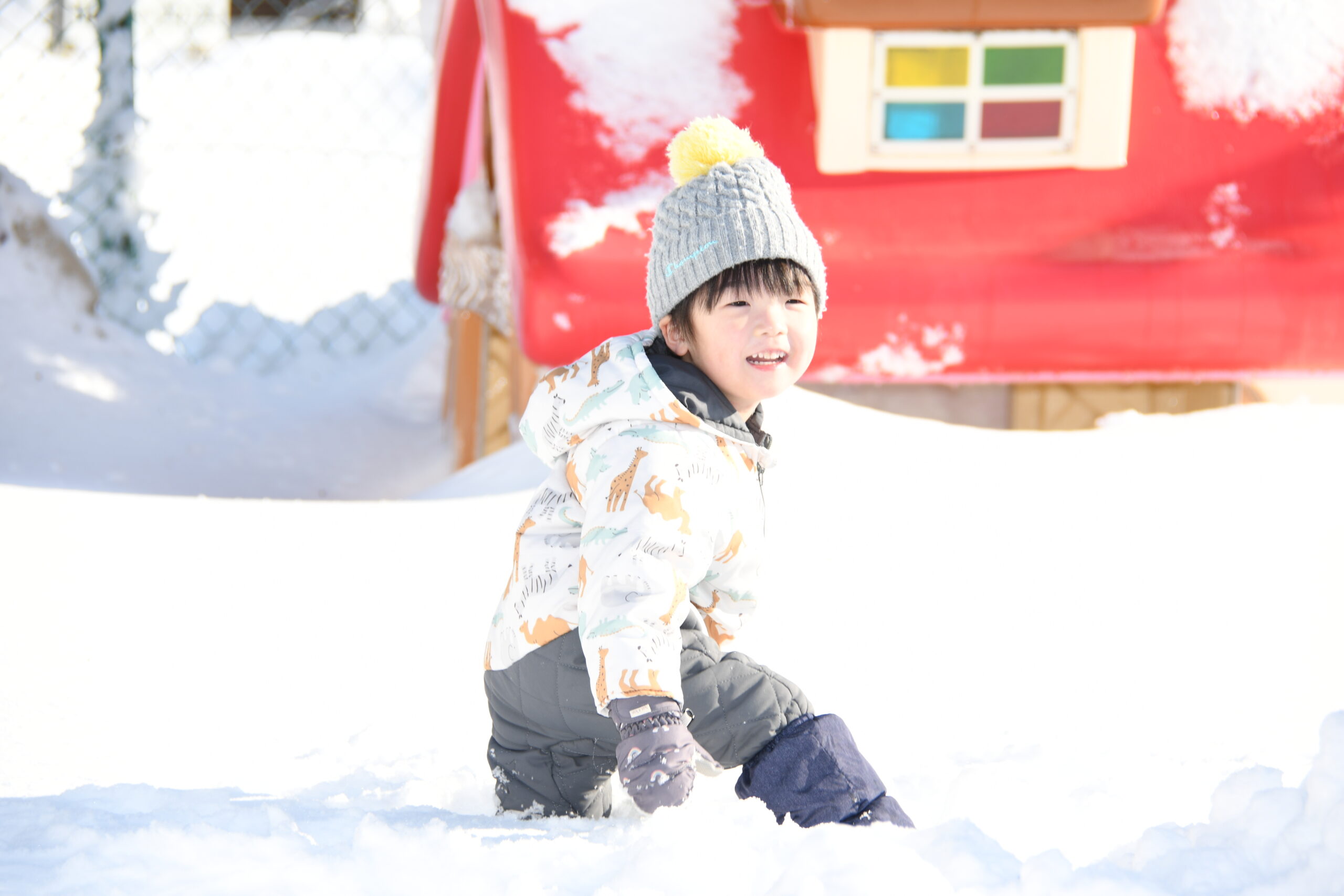 時折深く積もった雪に「足が抜けなくなっちゃった~」と困ったように話しながらも、雪だるま作り、かまくら作り、トンネル作り、雪合戦…ずっと待ちわびていた雪とのふれあいに笑顔と楽し気な声が晴天の下に響いていました。