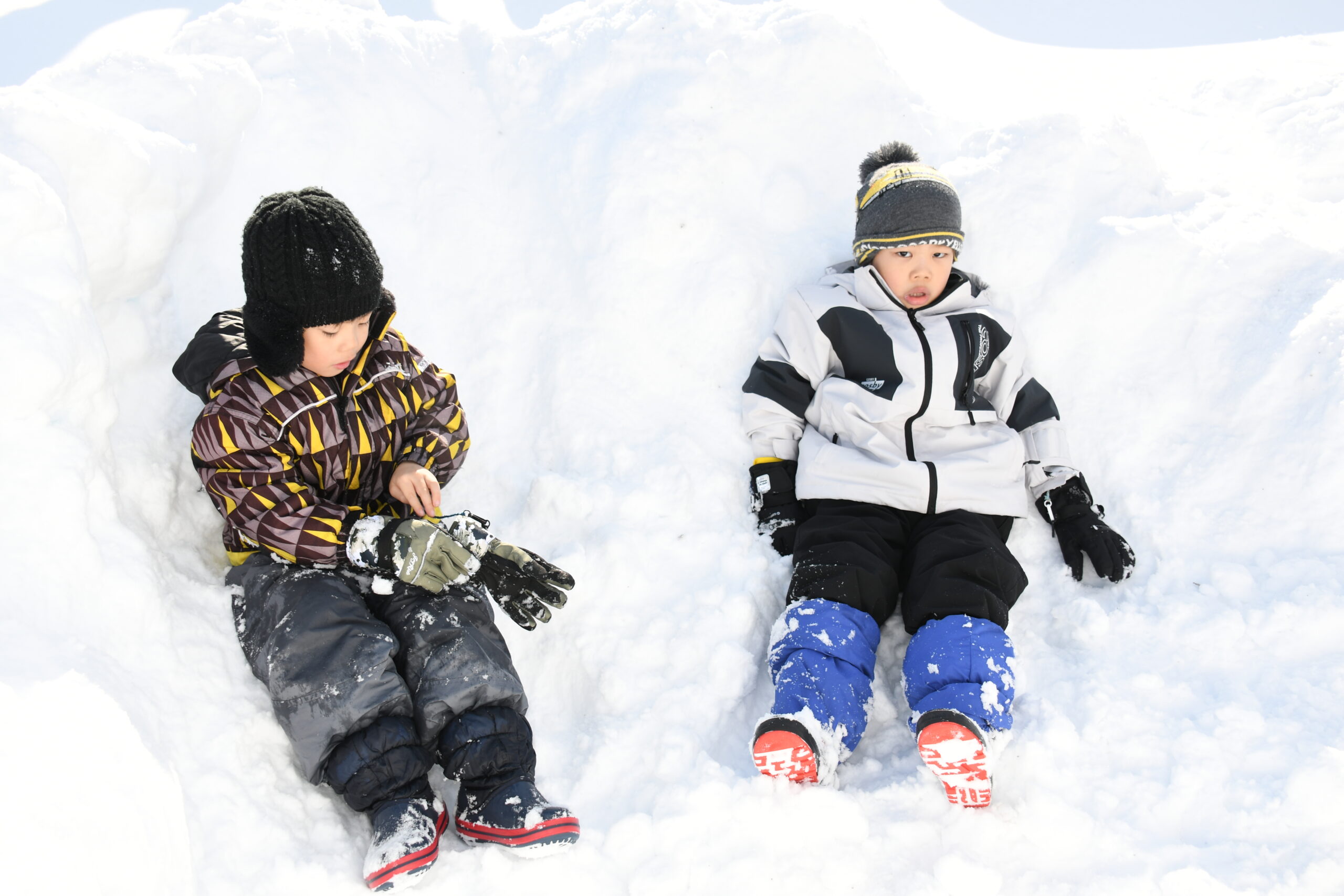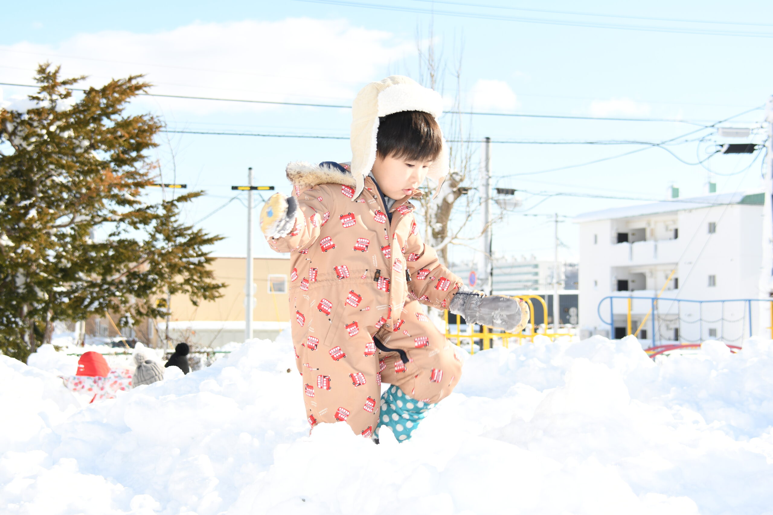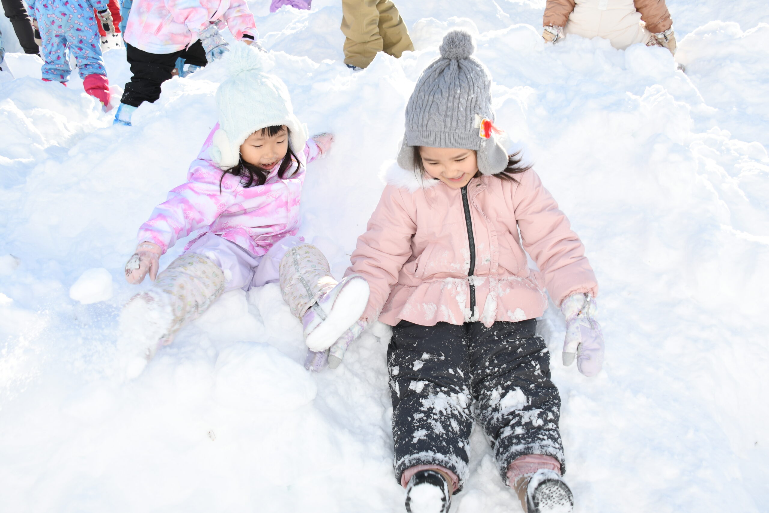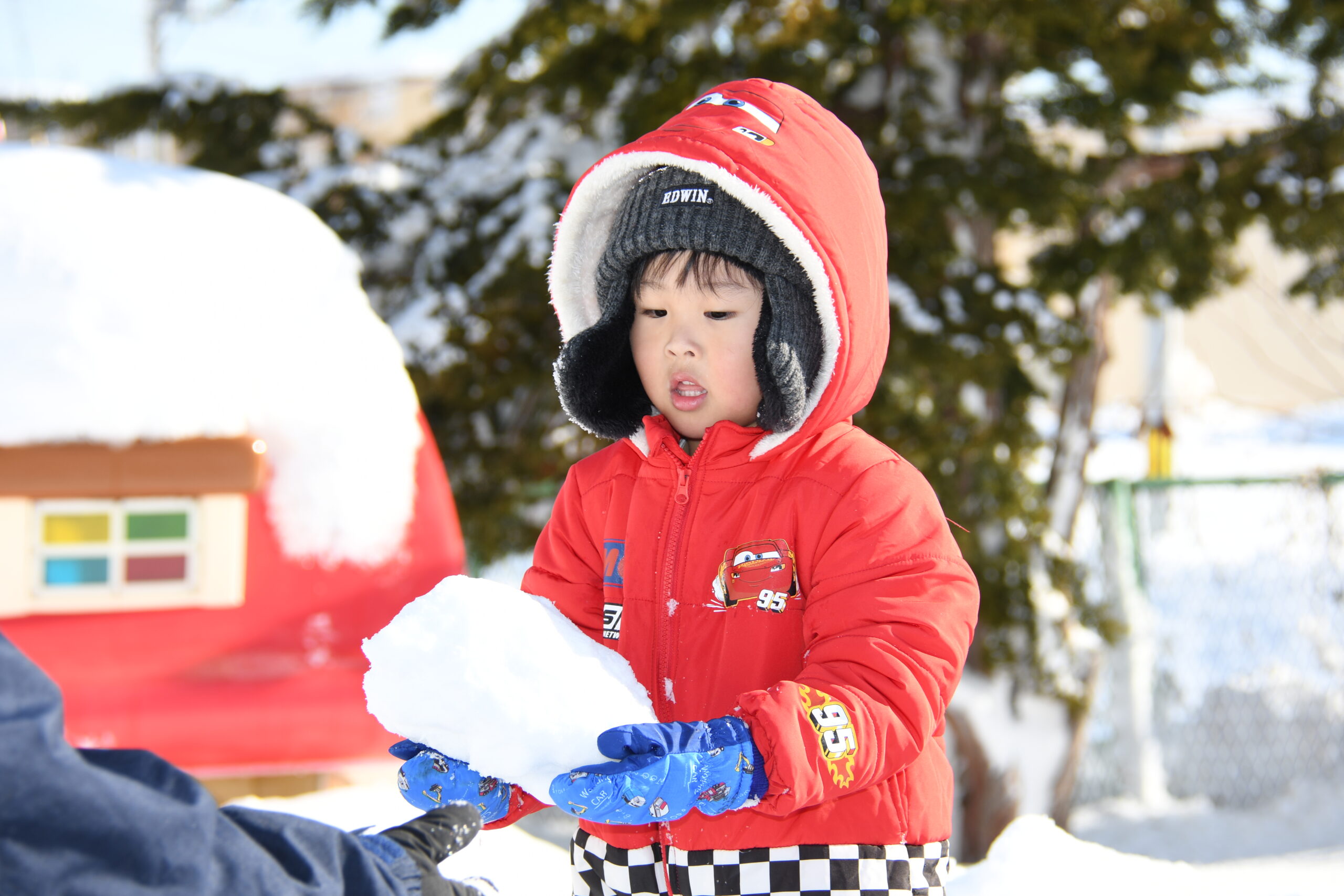 時折深く積もった雪に「足が抜けなくなっちゃった~」と困ったように話しながらも、雪だるま作り、かまくら作り、トンネル作り、雪合戦…ずっと待ちわびていた雪とのふれあいに笑顔と楽し気な声が晴天の下に響いていました。