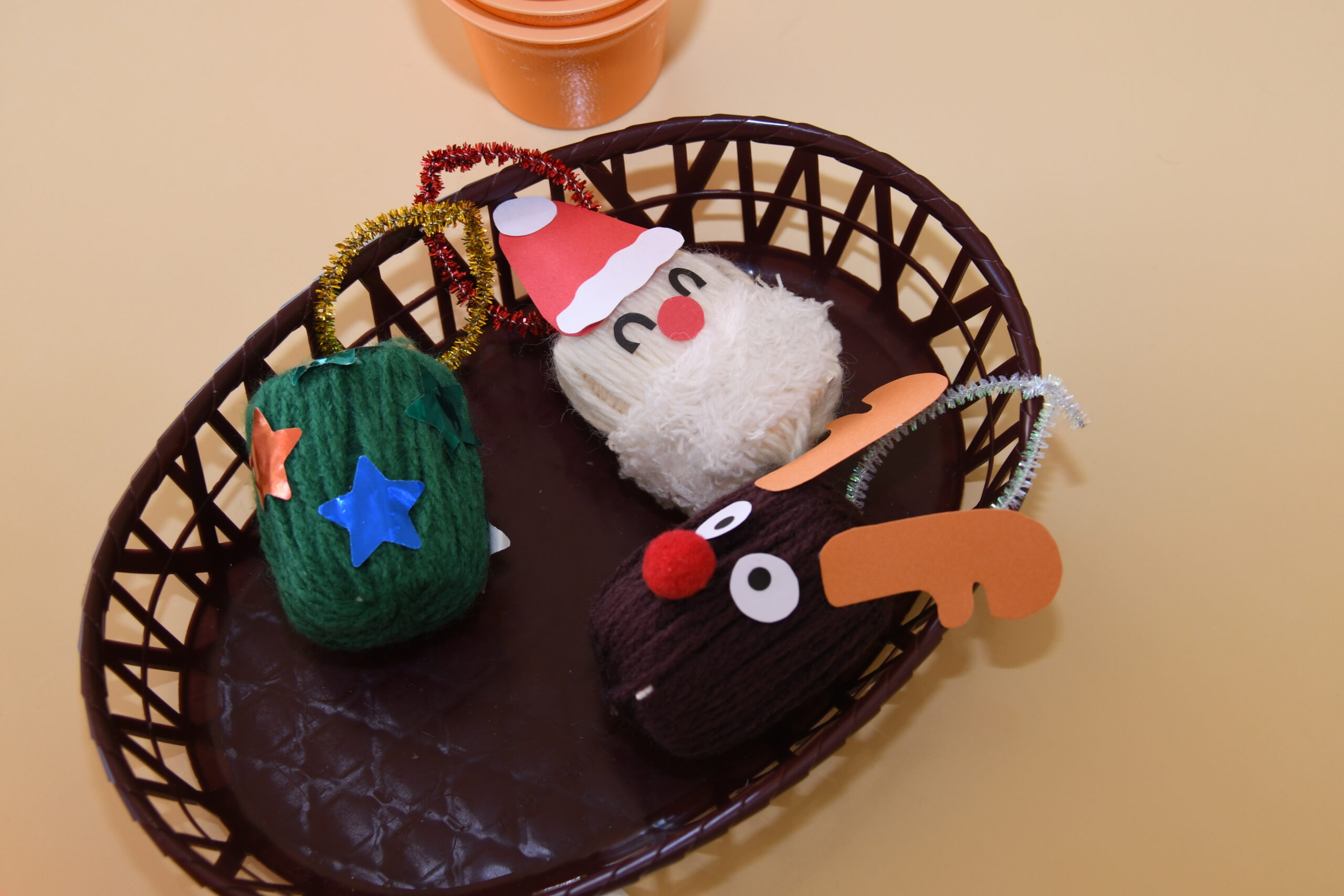 毛糸の巻いてあるところに目を付けてサンタクロースやトナカイ等のオーナメント作りをしました。