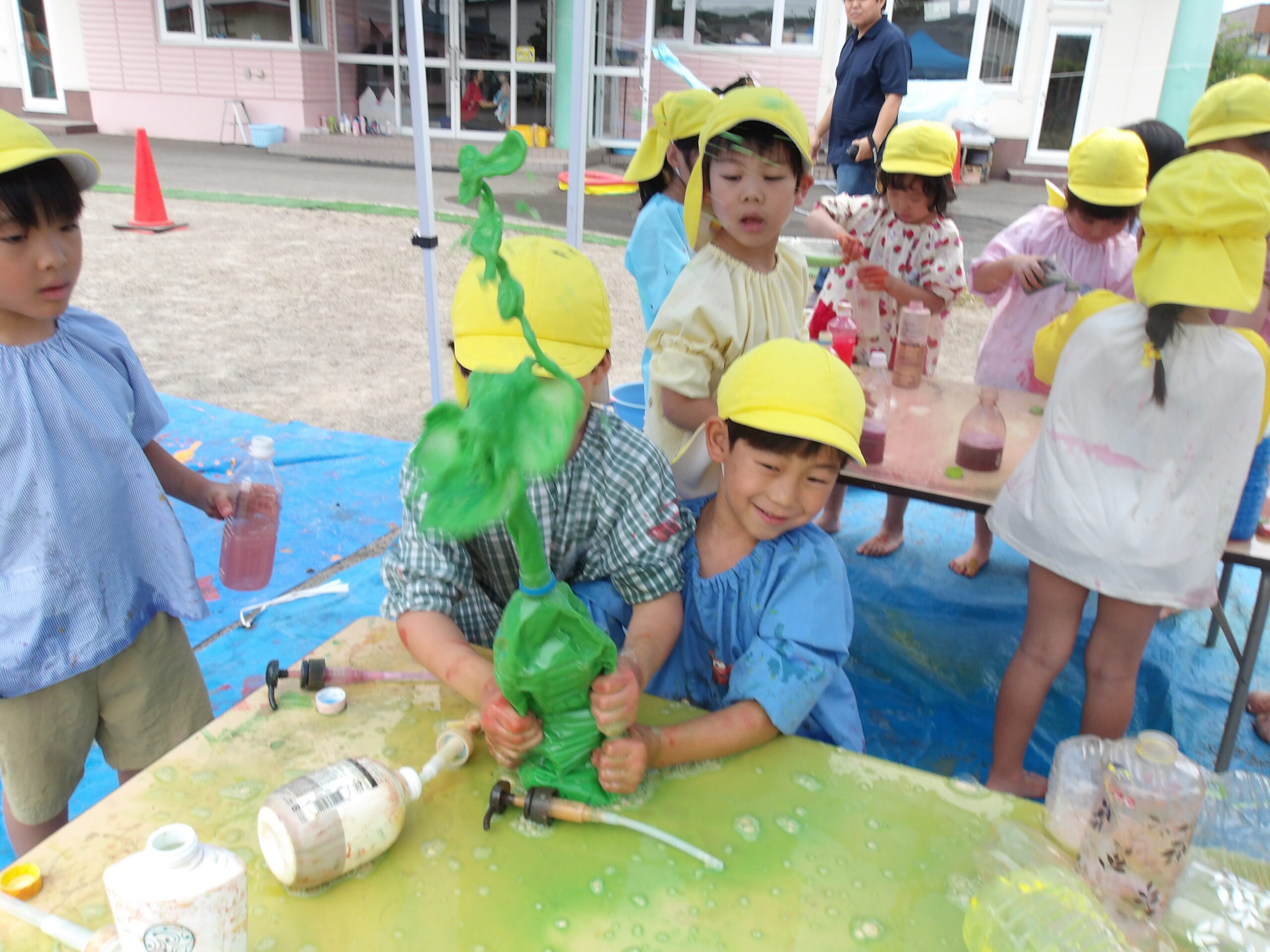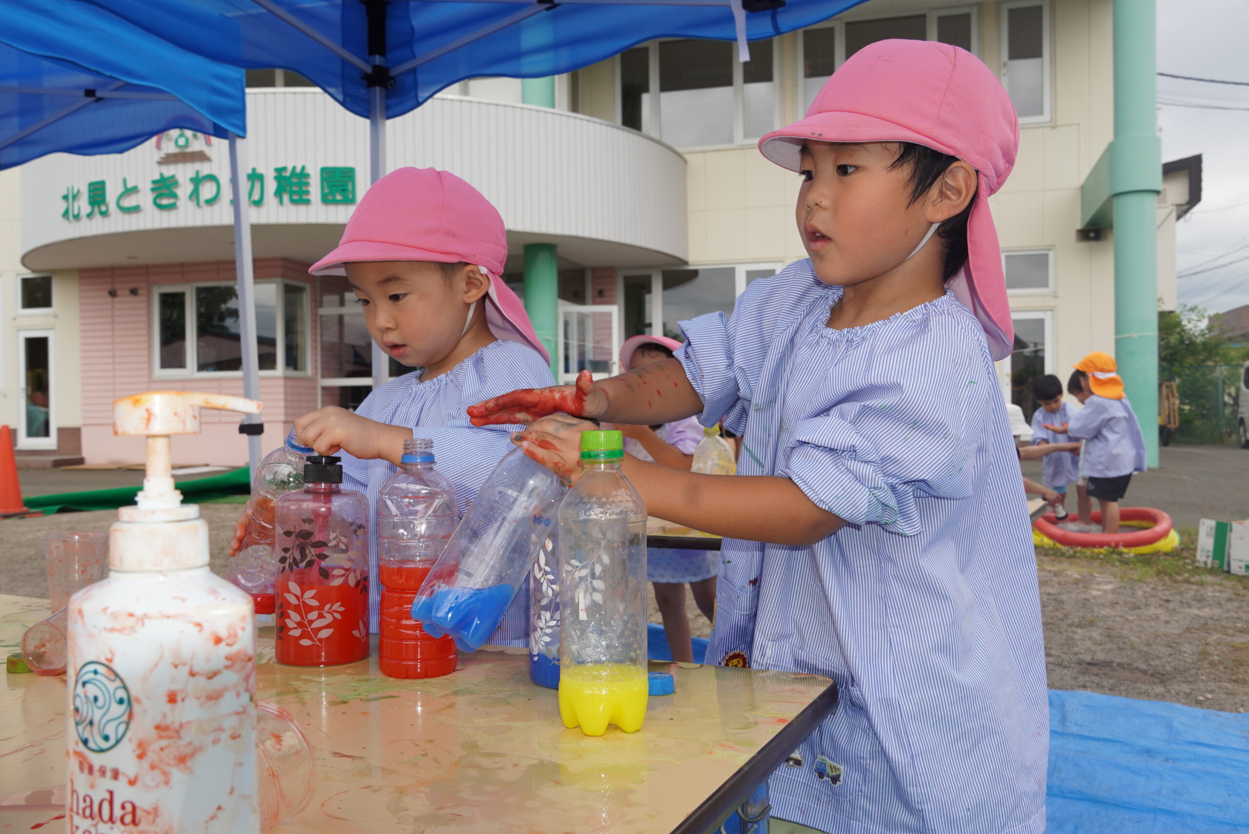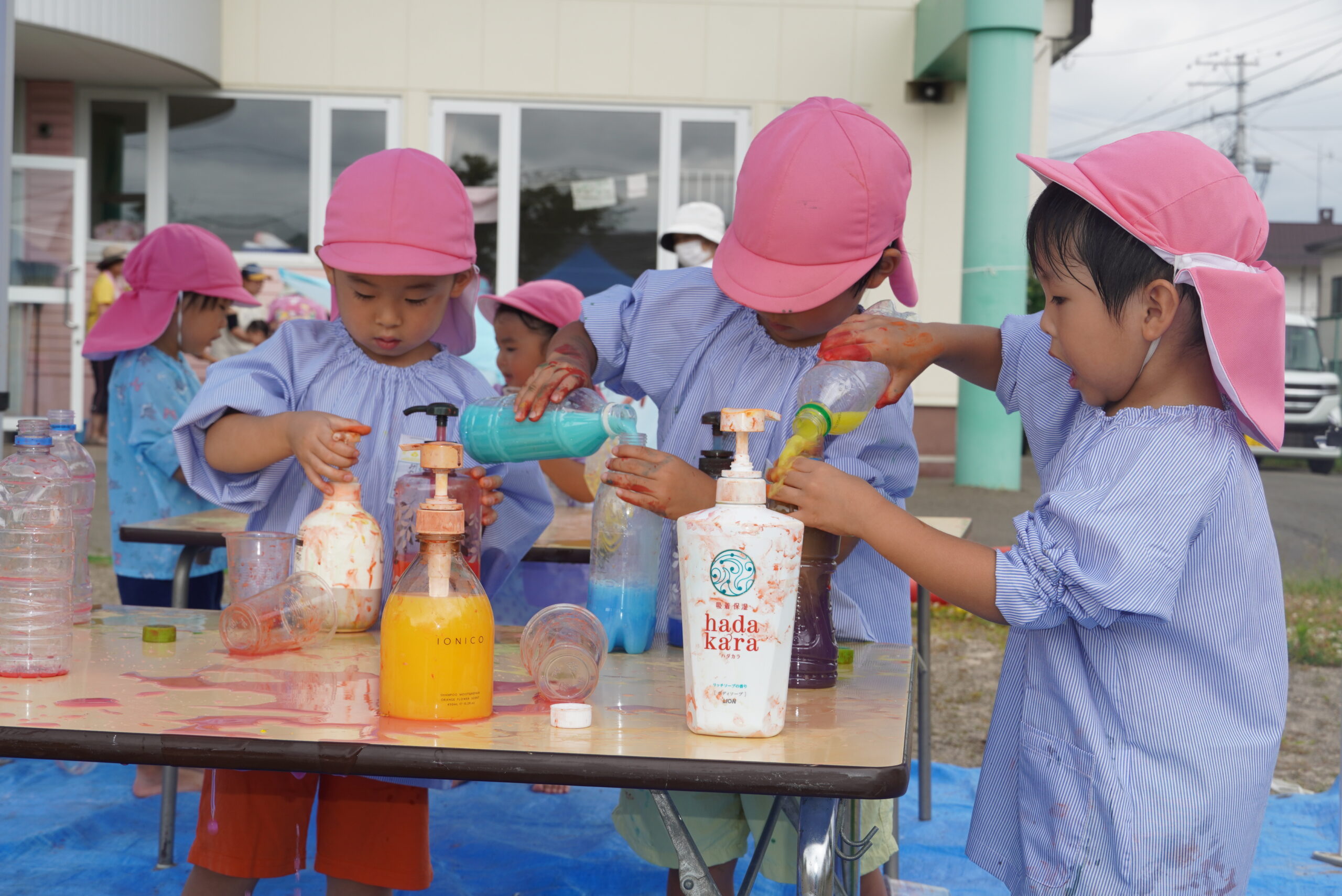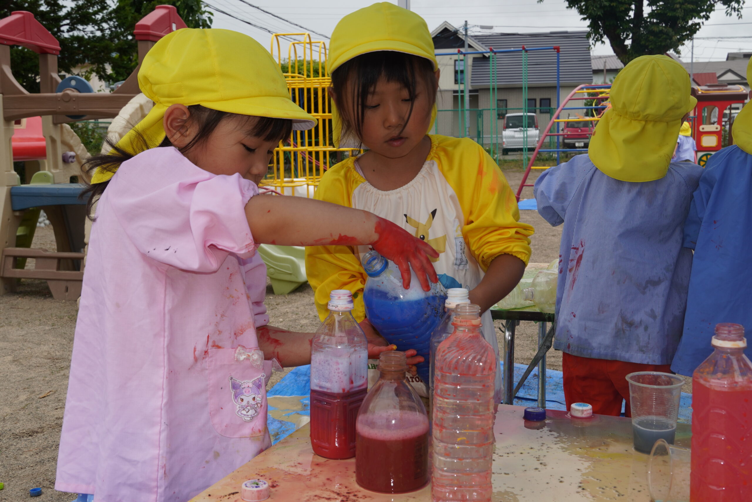 年長ぐみは、色水遊びがダイナミック。プラコップよりペットボトルで混色の後「ロケット噴射」と言いながら」水を噴き上げて楽しんでいました。