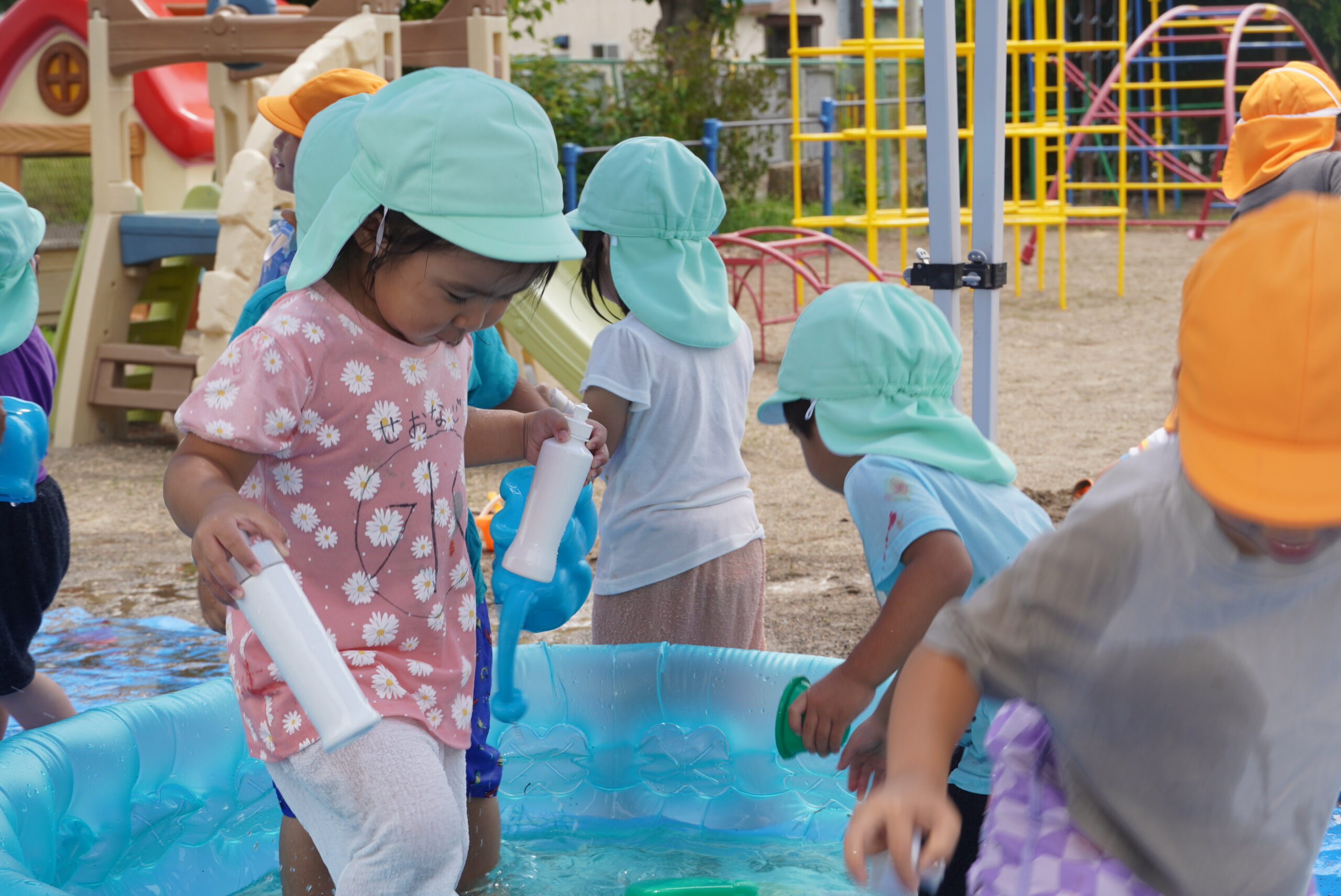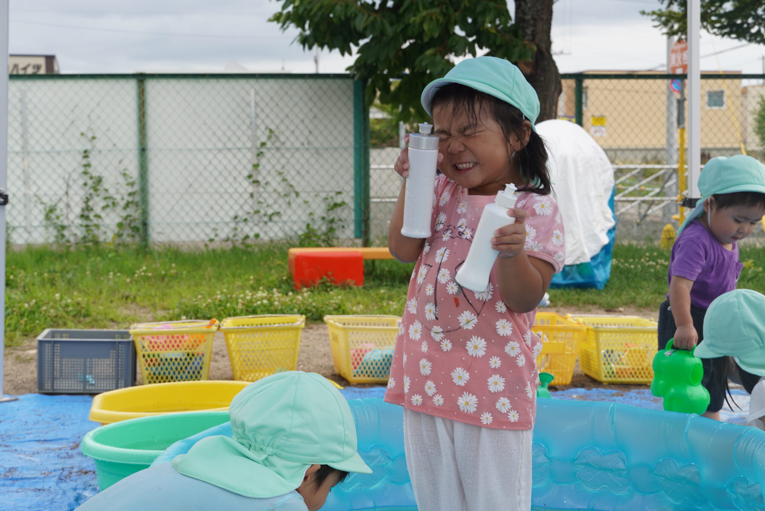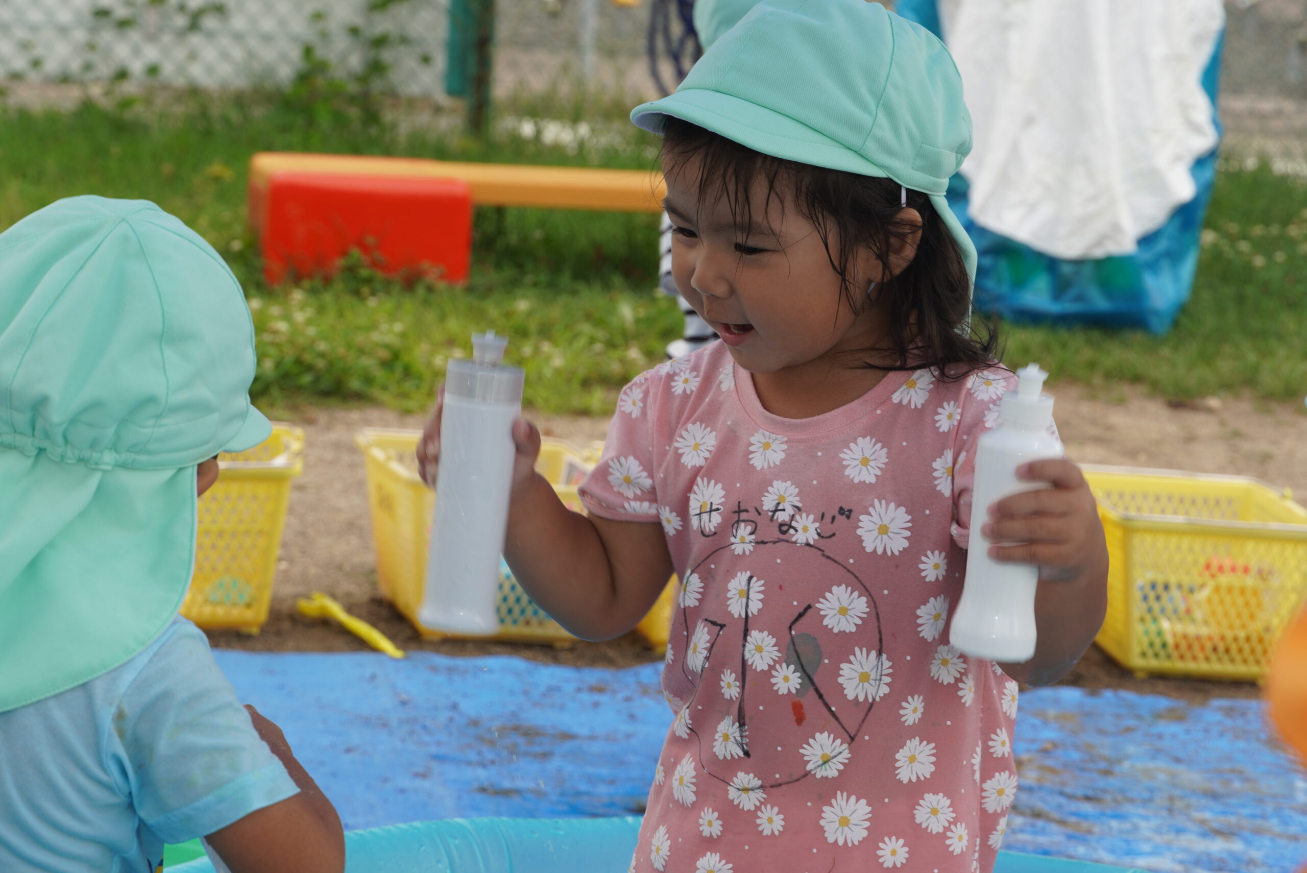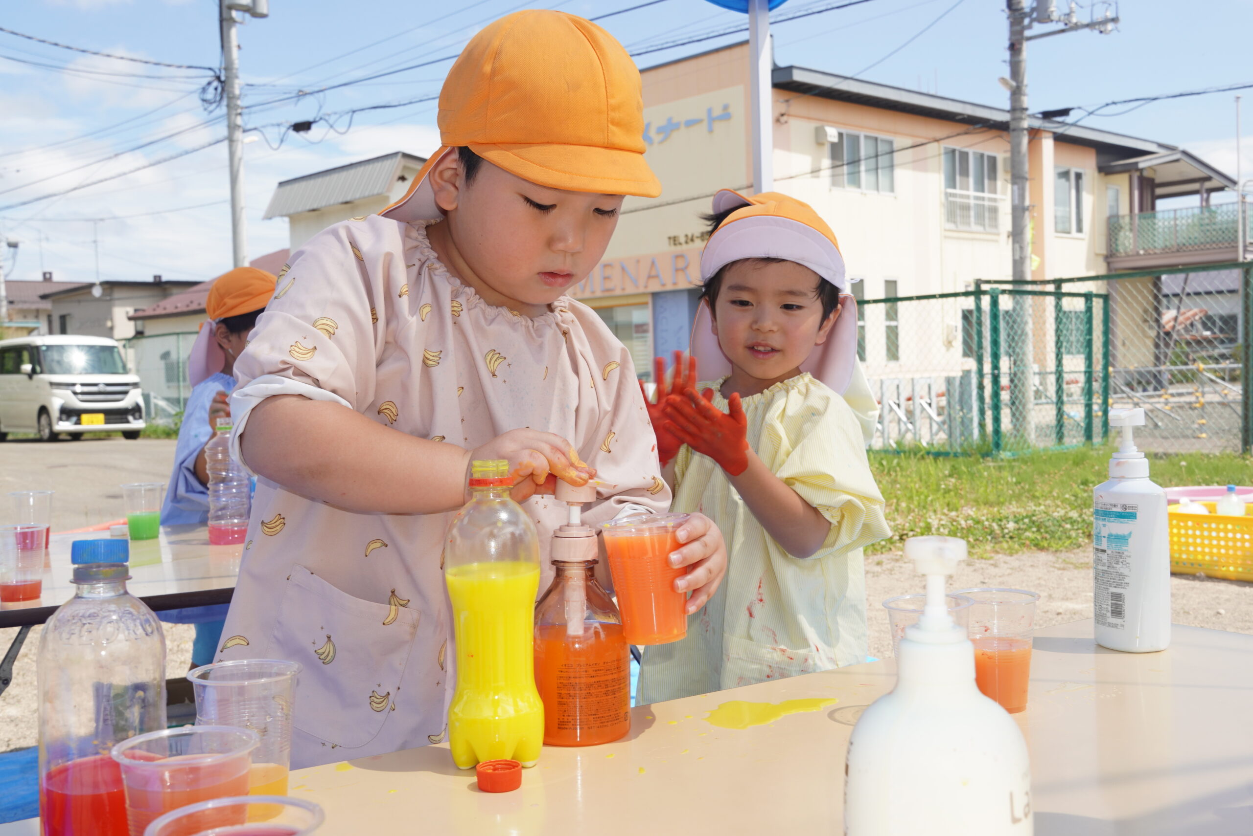 年長ぐみは、色水遊びがダイナミック。プラコップよりペットボトルで混色の後「ロケット噴射」と言いながら」水を噴き上げて楽しんでいました。
