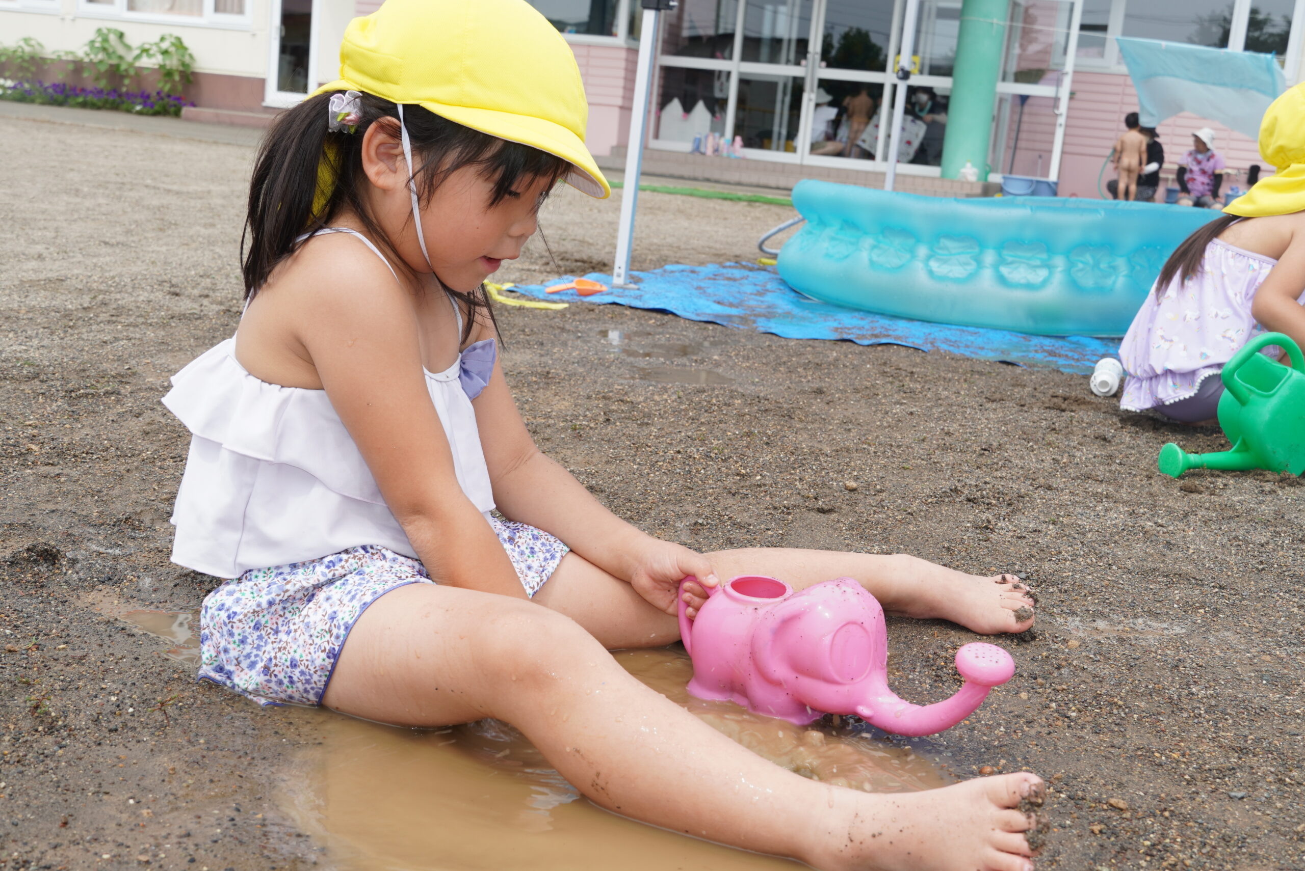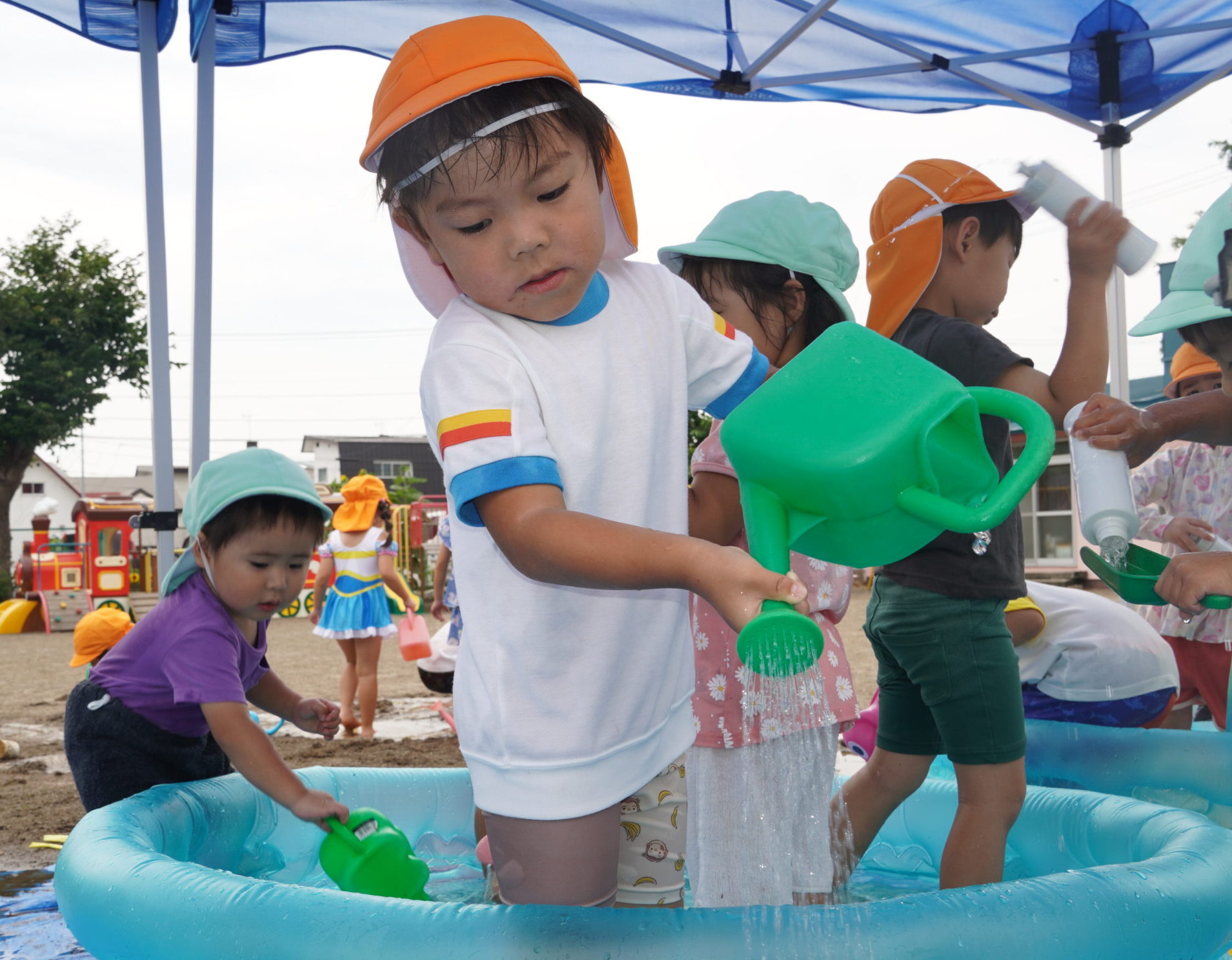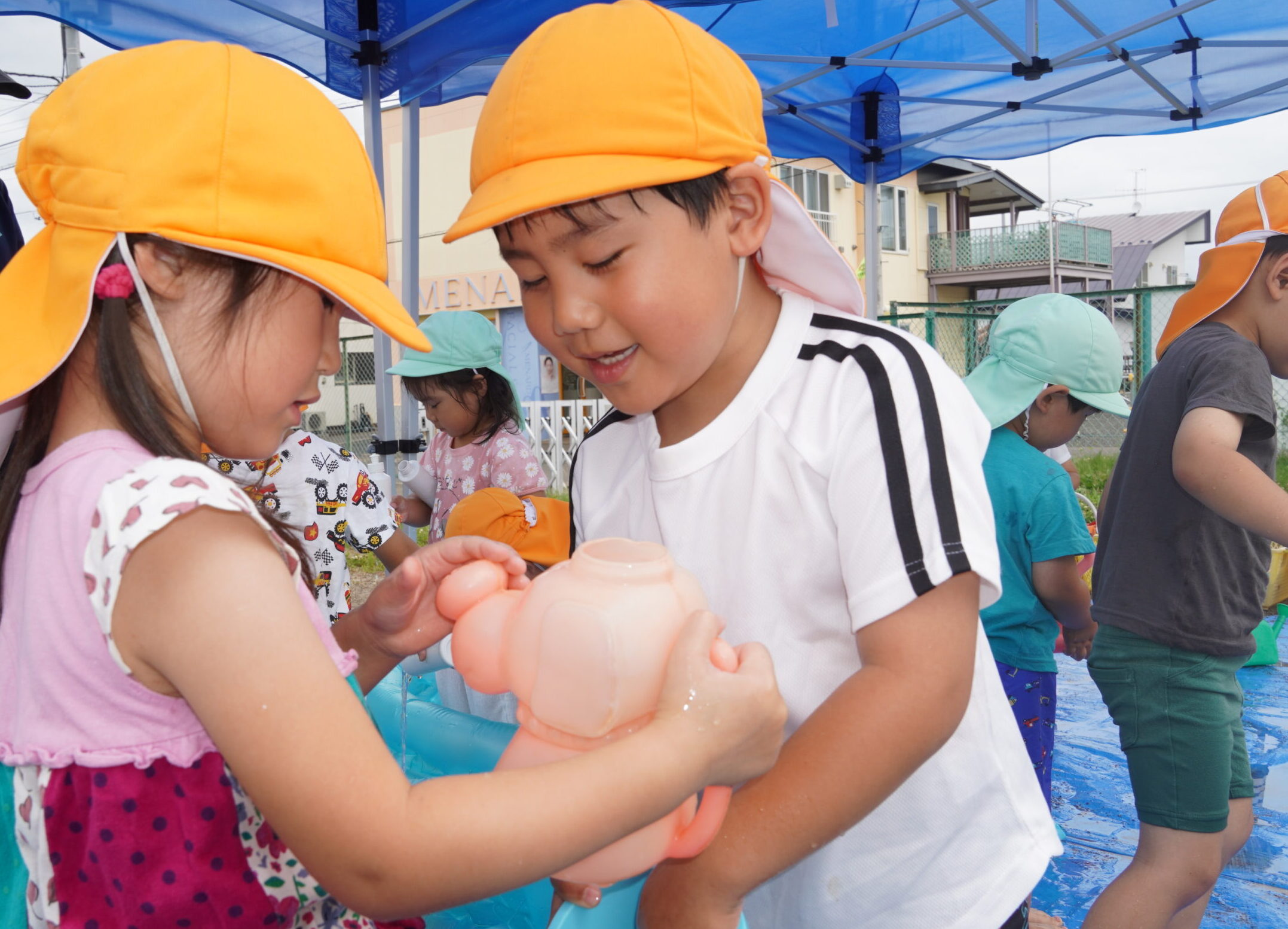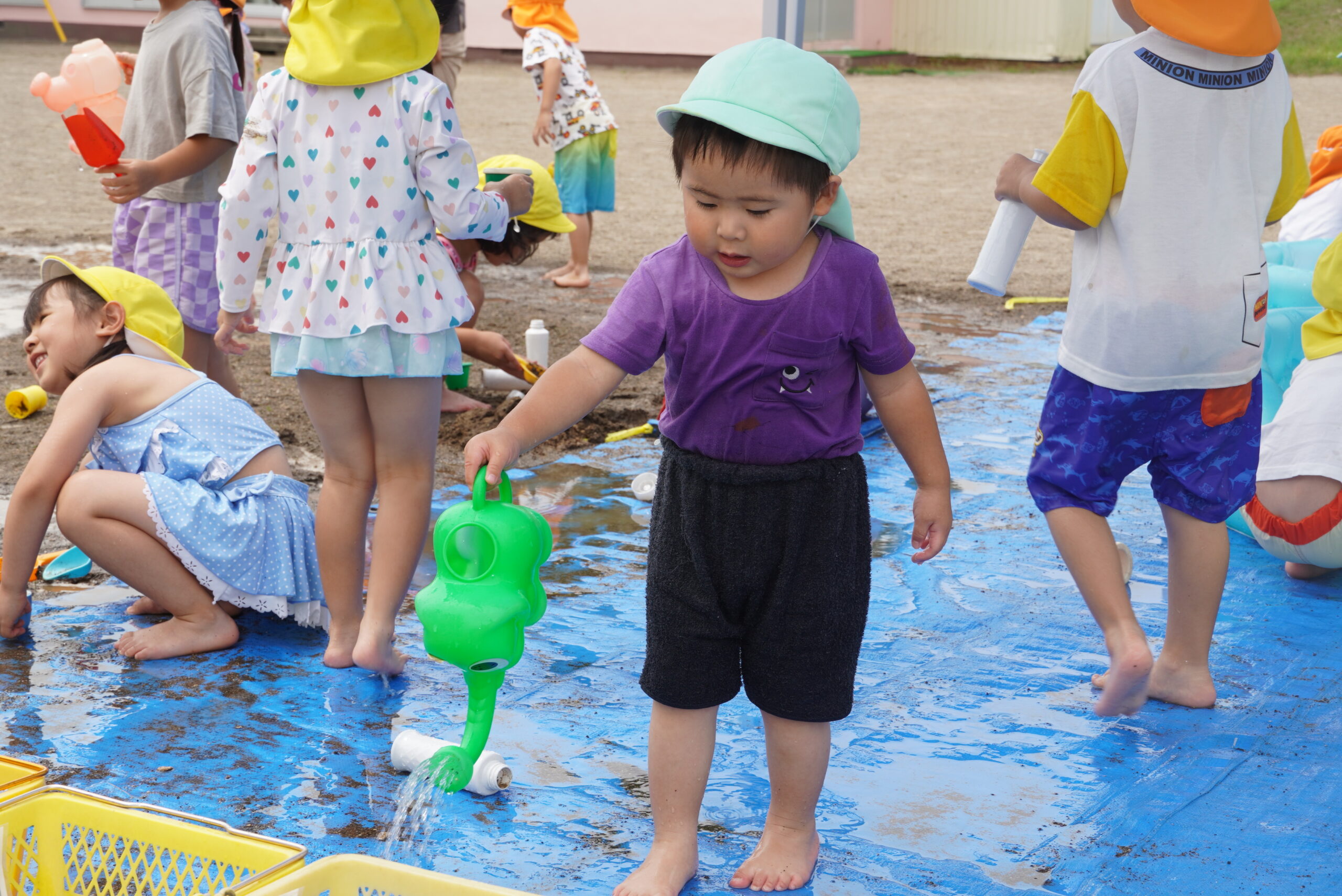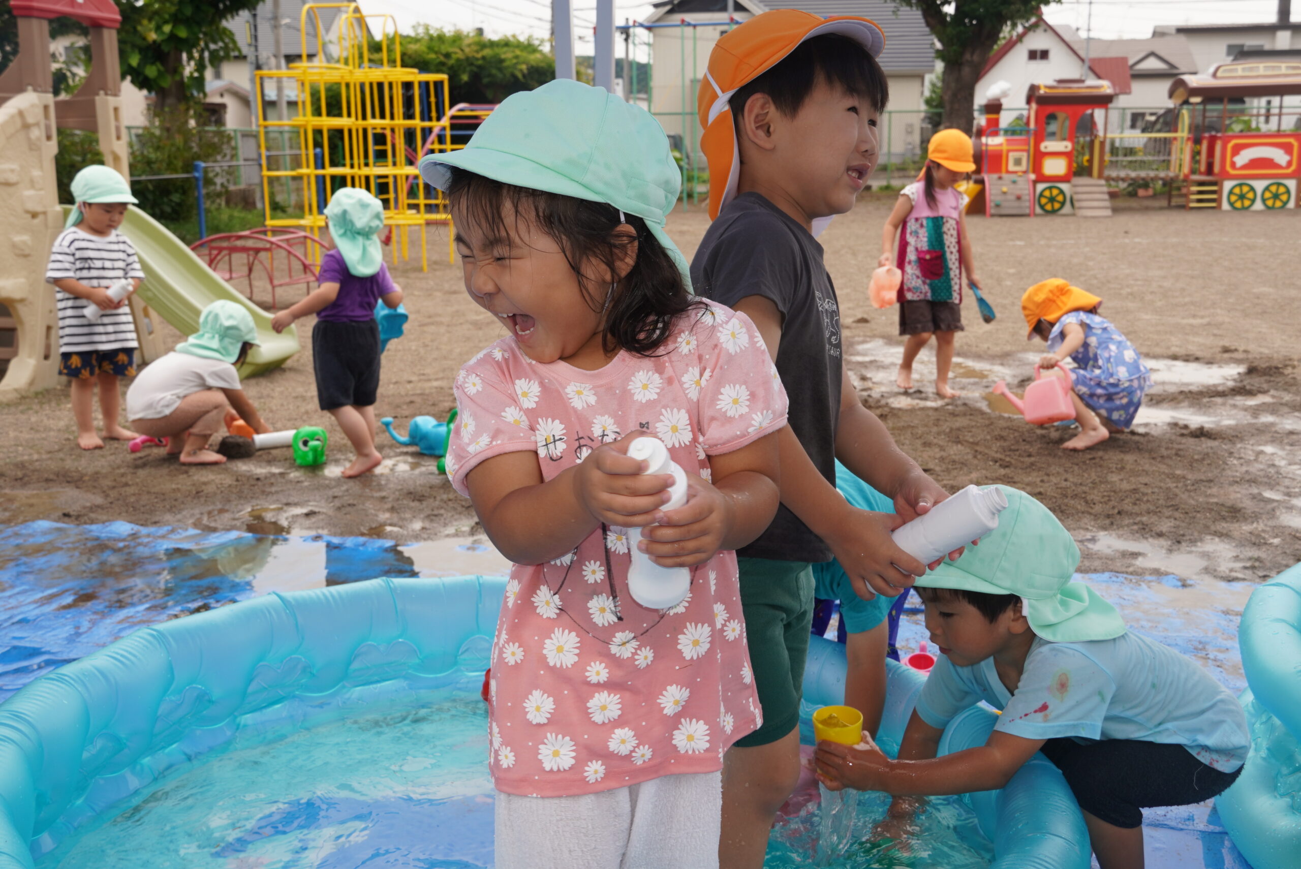 年長ぐみは、色水遊びがダイナミック。プラコップよりペットボトルで混色の後「ロケット噴射」と言いながら」水を噴き上げて楽しんでいました。