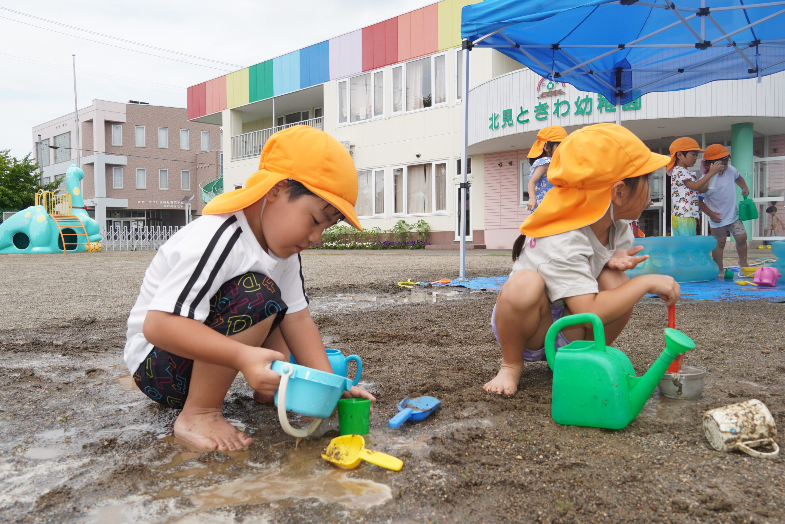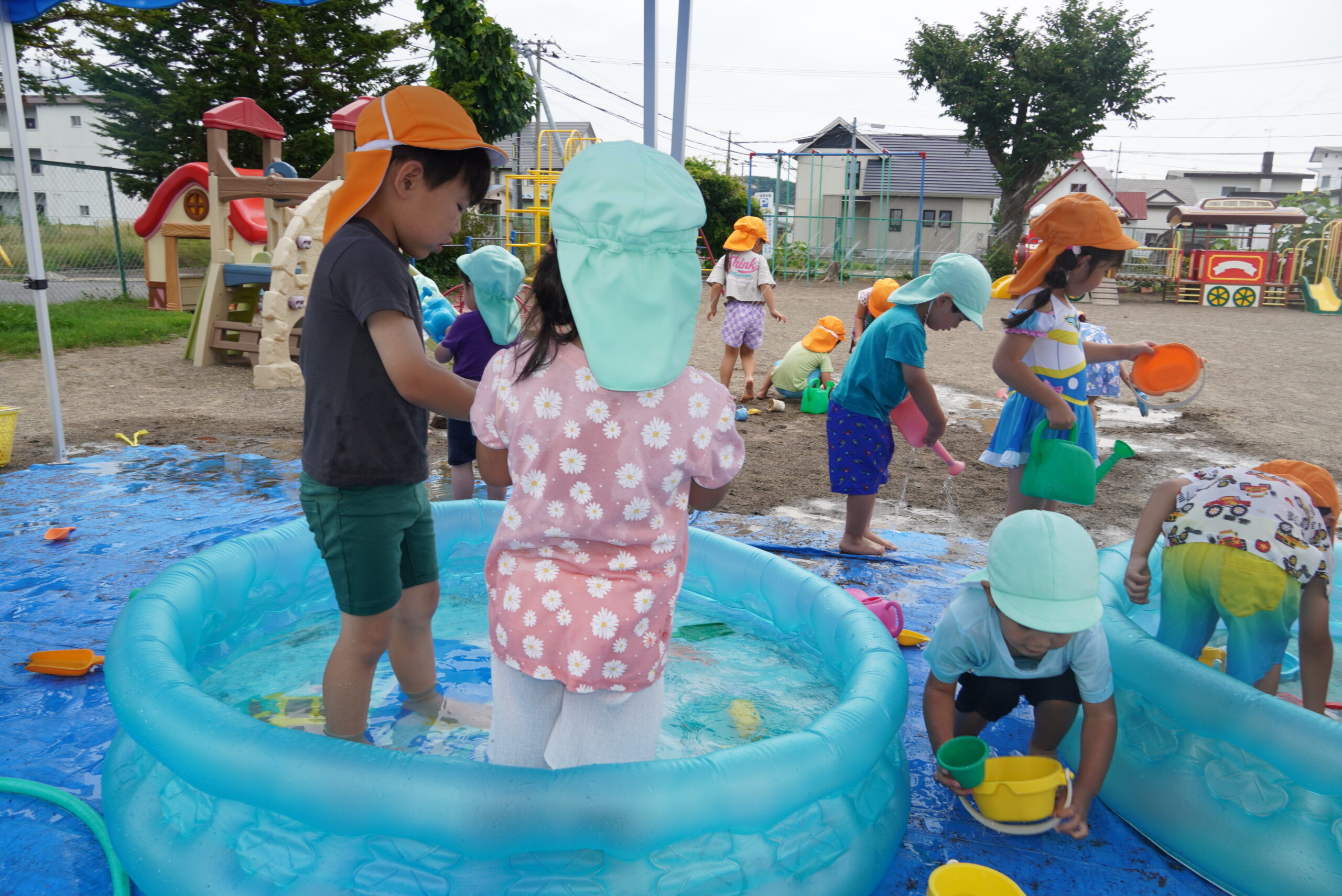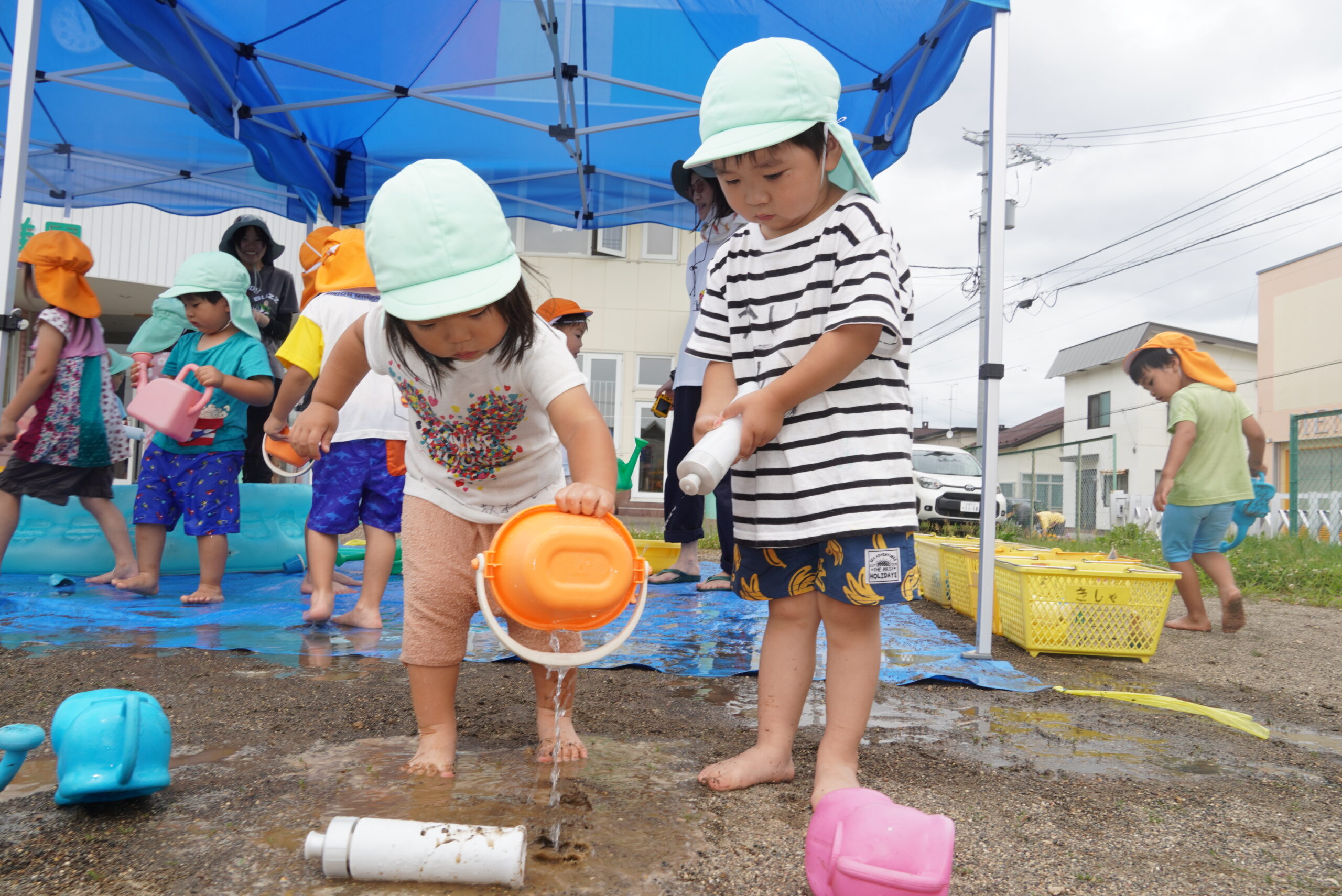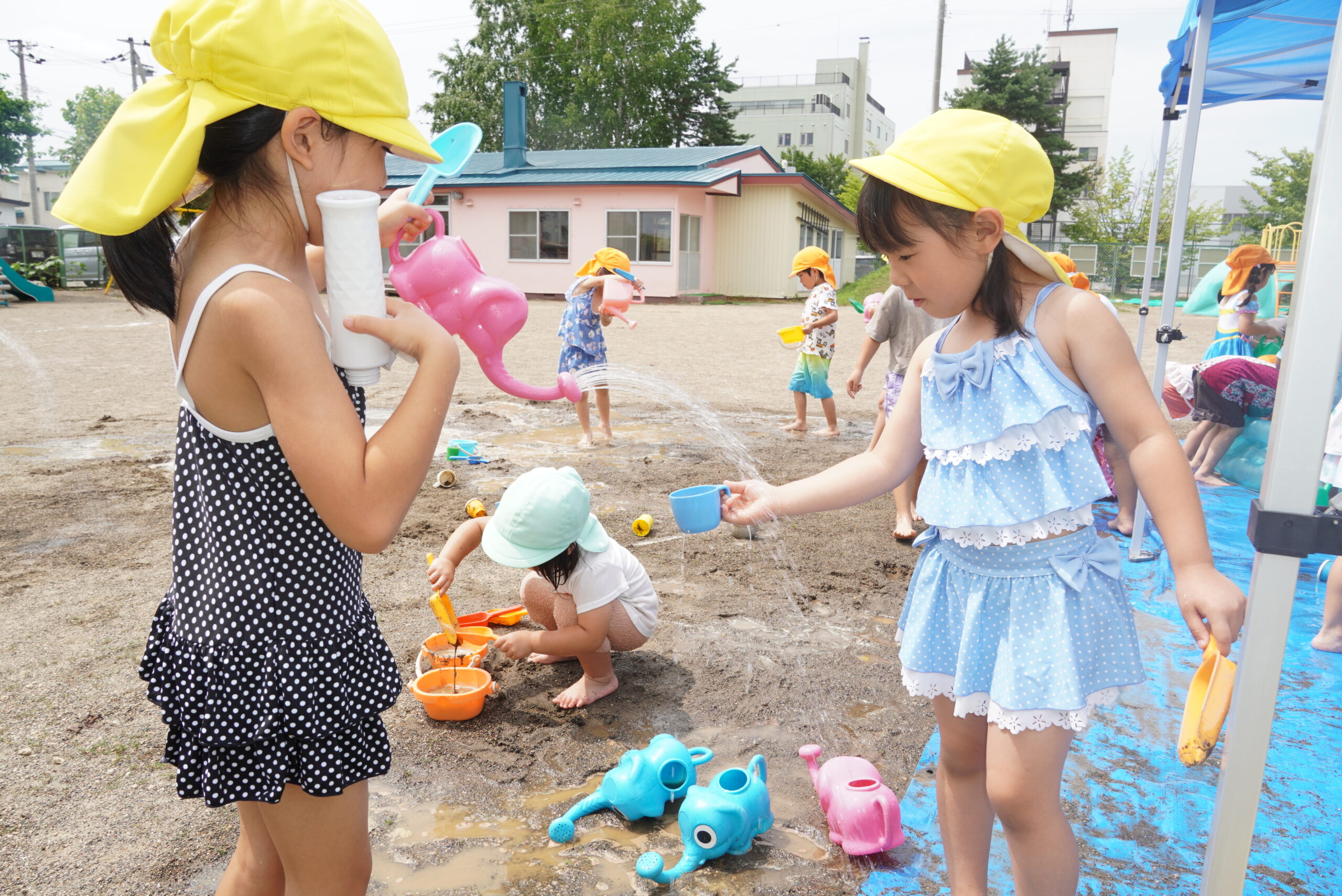 年長ぐみは、色水遊びがダイナミック。プラコップよりペットボトルで混色の後「ロケット噴射」と言いながら」水を噴き上げて楽しんでいました。