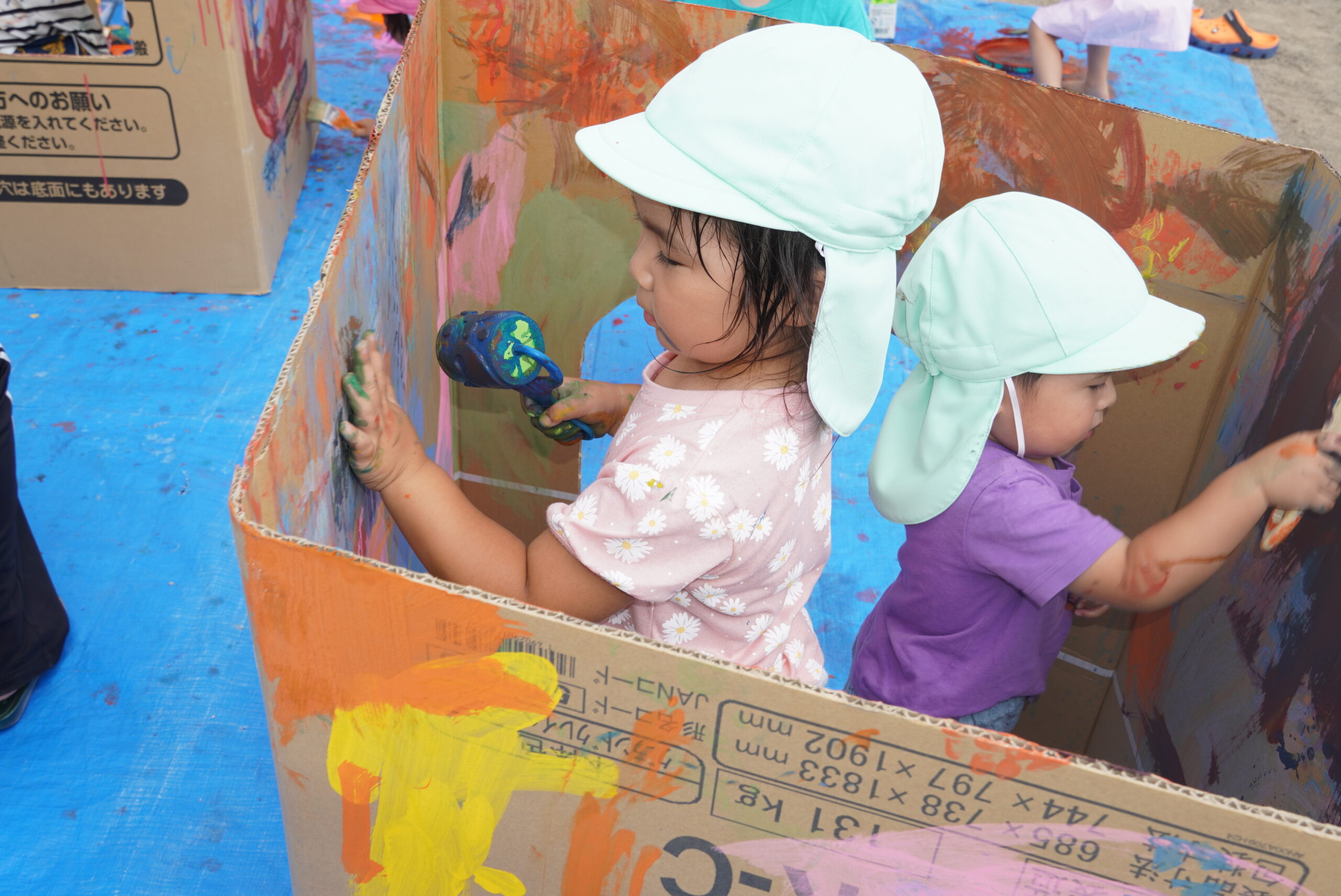 お家色塗りコーナーは、お家の中にも入れるので内側からも色を塗って顔や体にも絵の具を付けながら夢中で塗っていました。