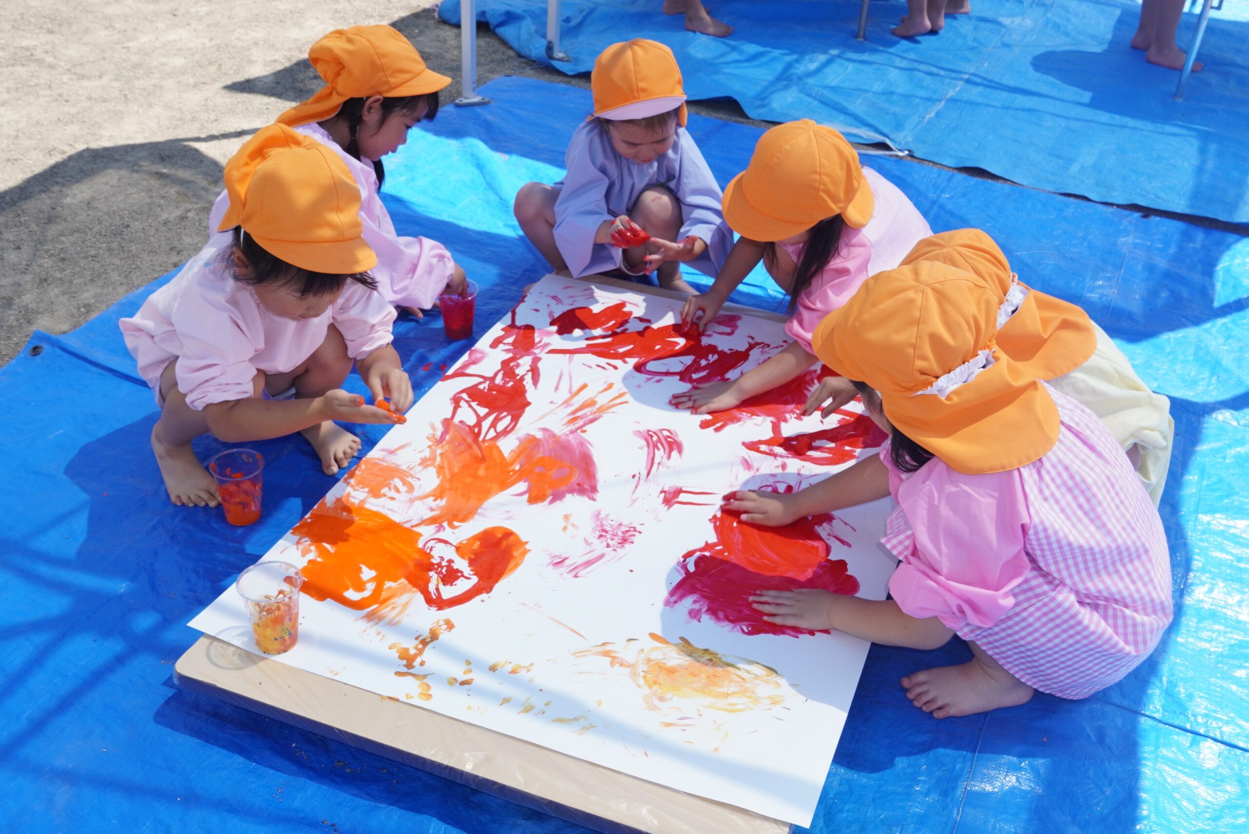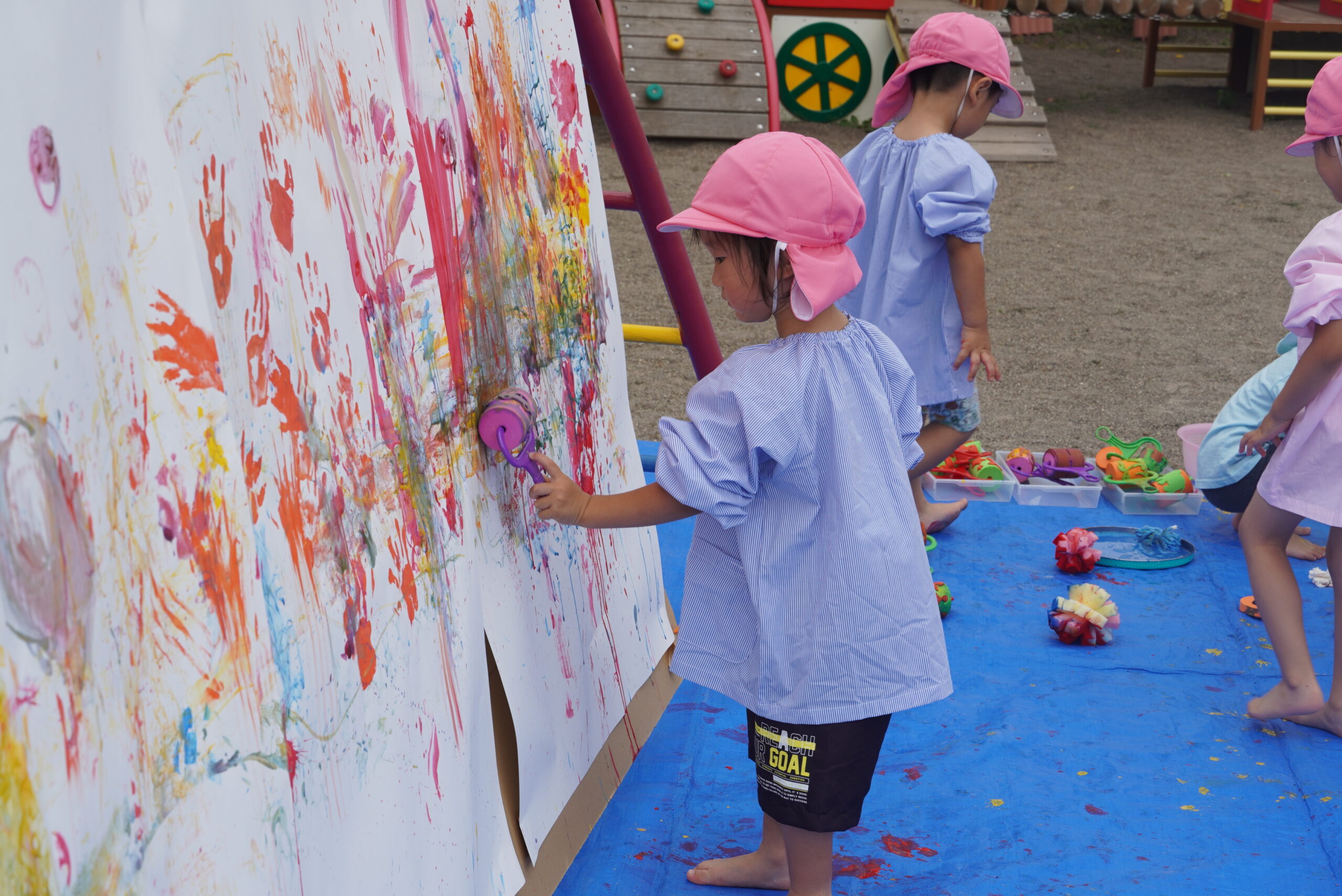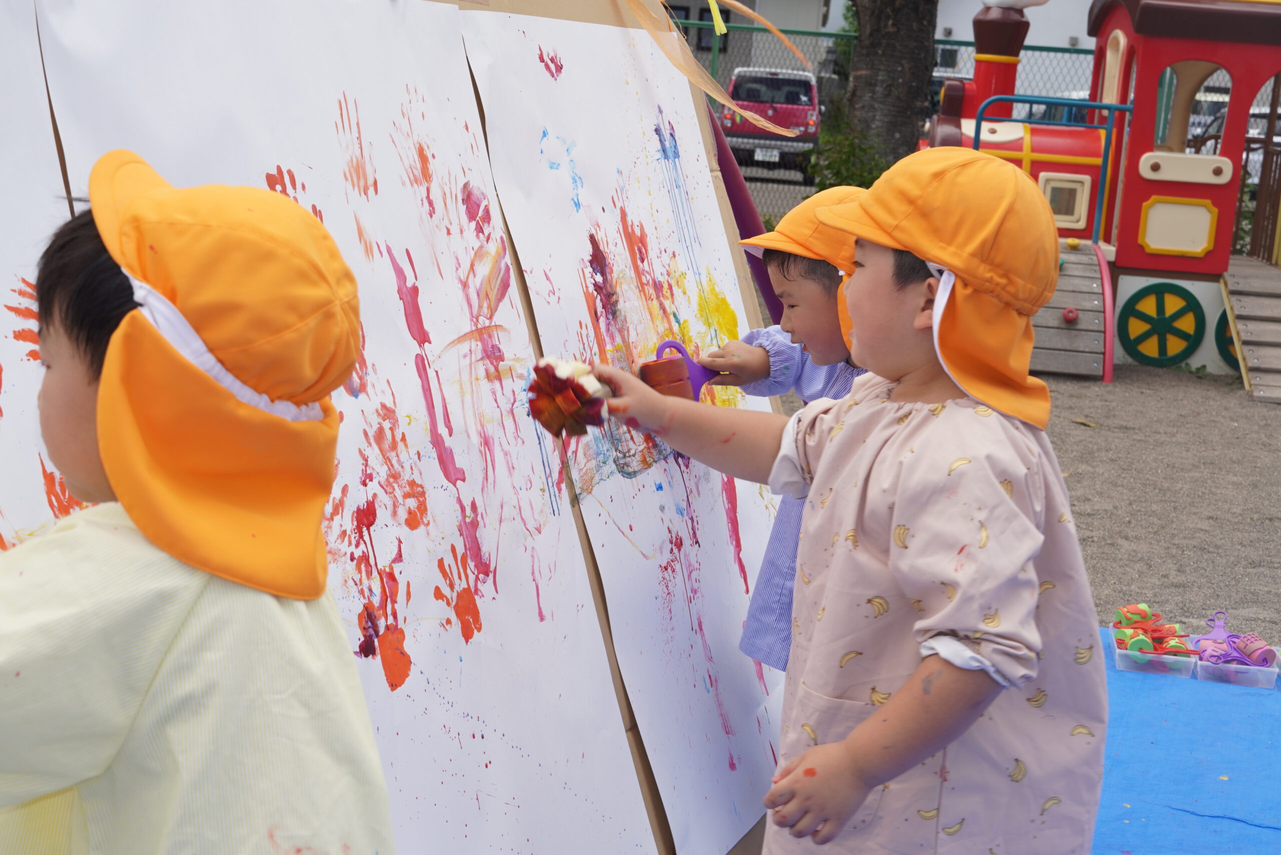 異年齢の交流をしながら、園庭でダイナミックに絵の具遊びを楽しむことが出来ました。