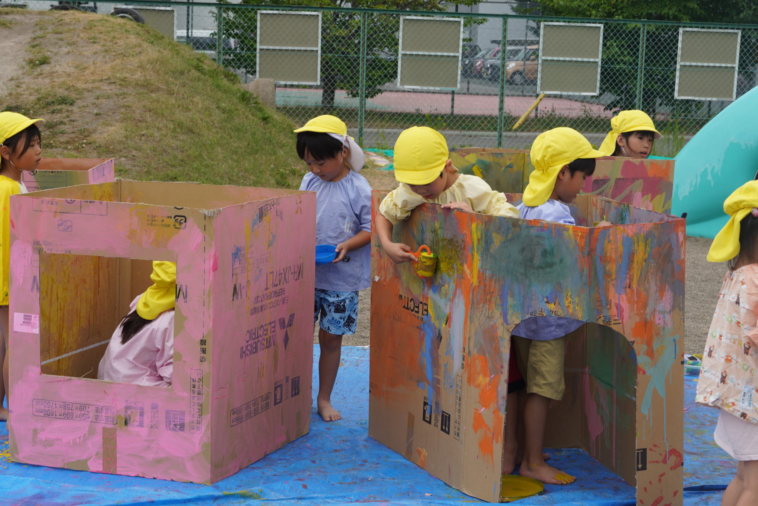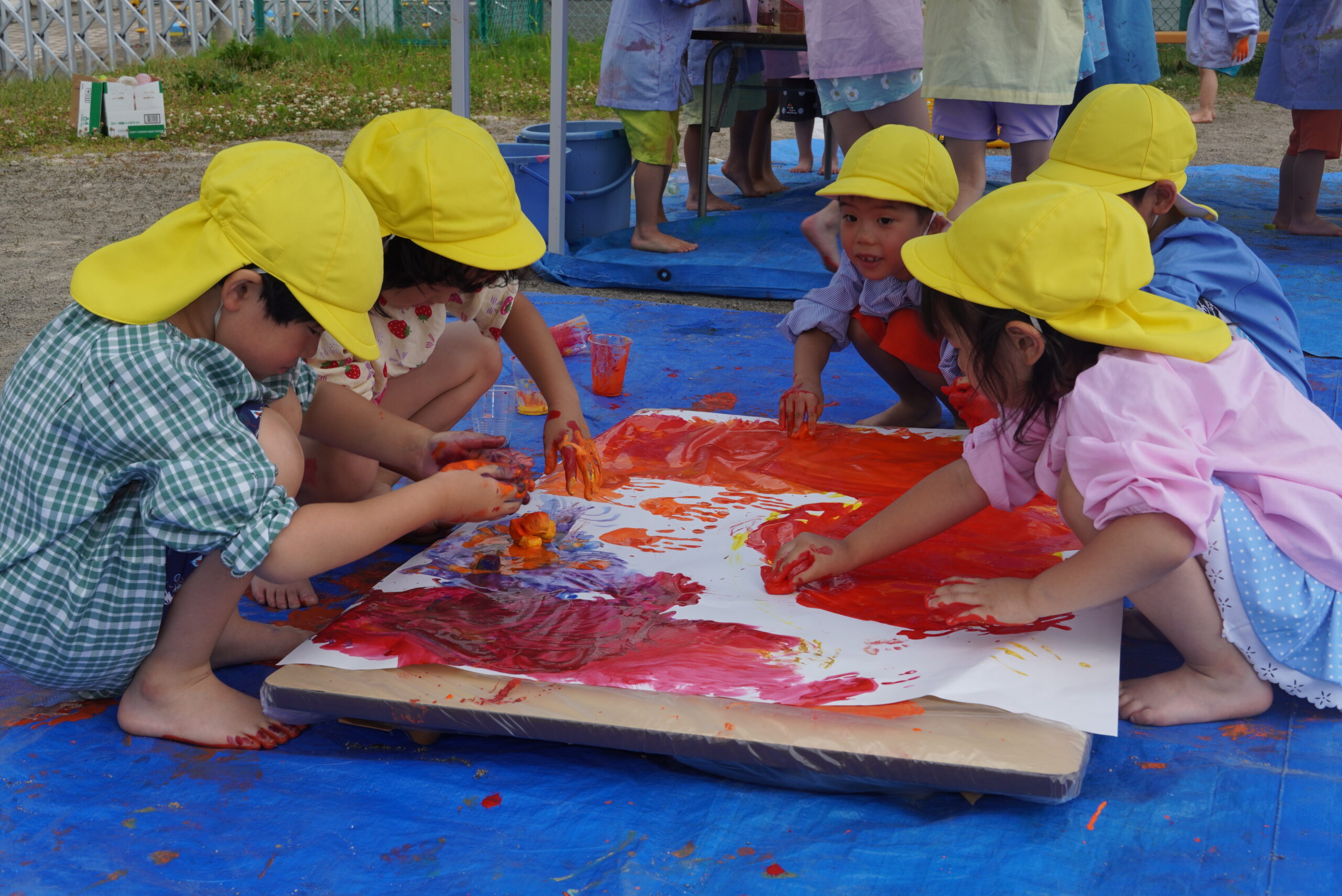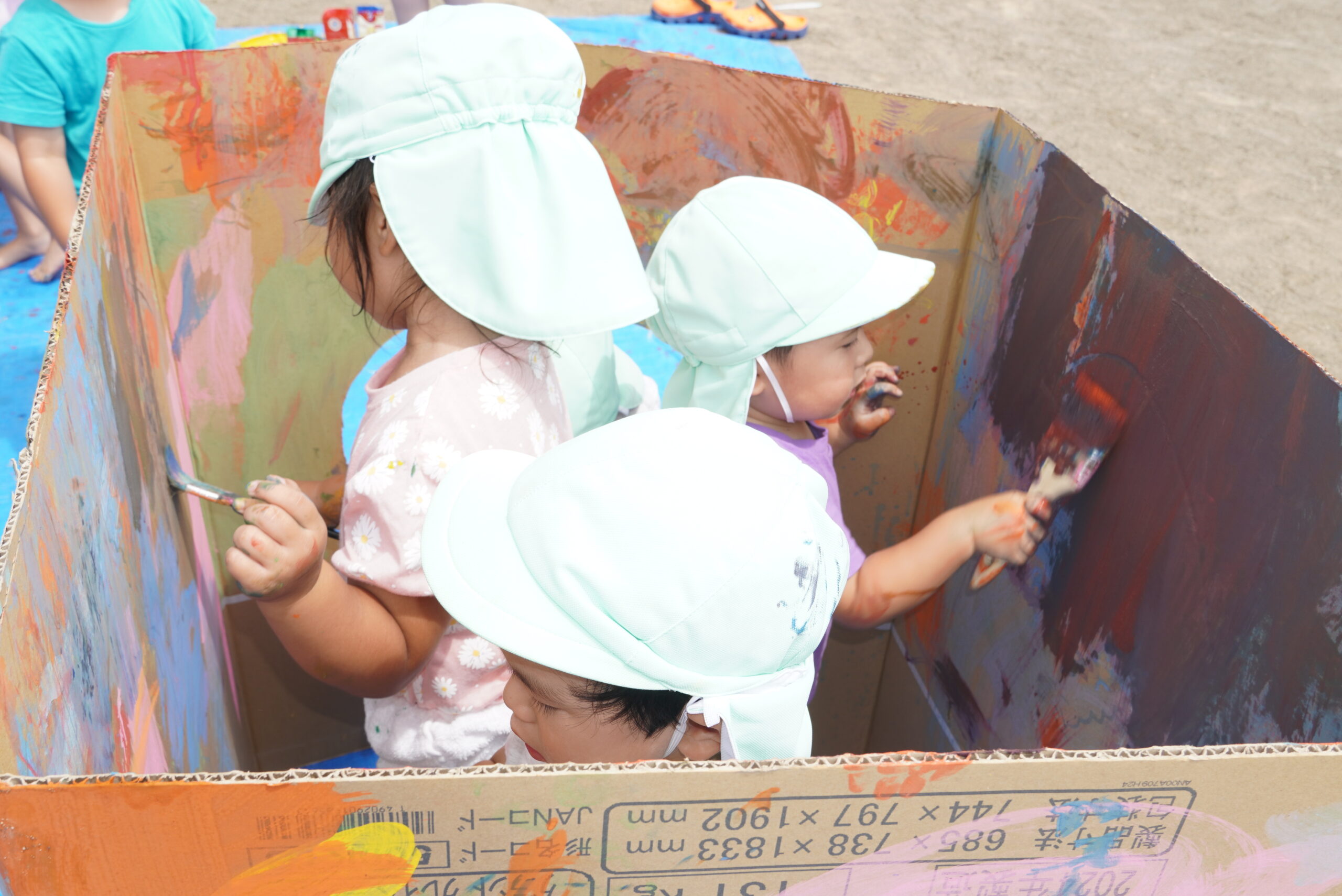 異年齢の交流をしながら、園庭でダイナミックに絵の具遊びを楽しむことが出来ました。
