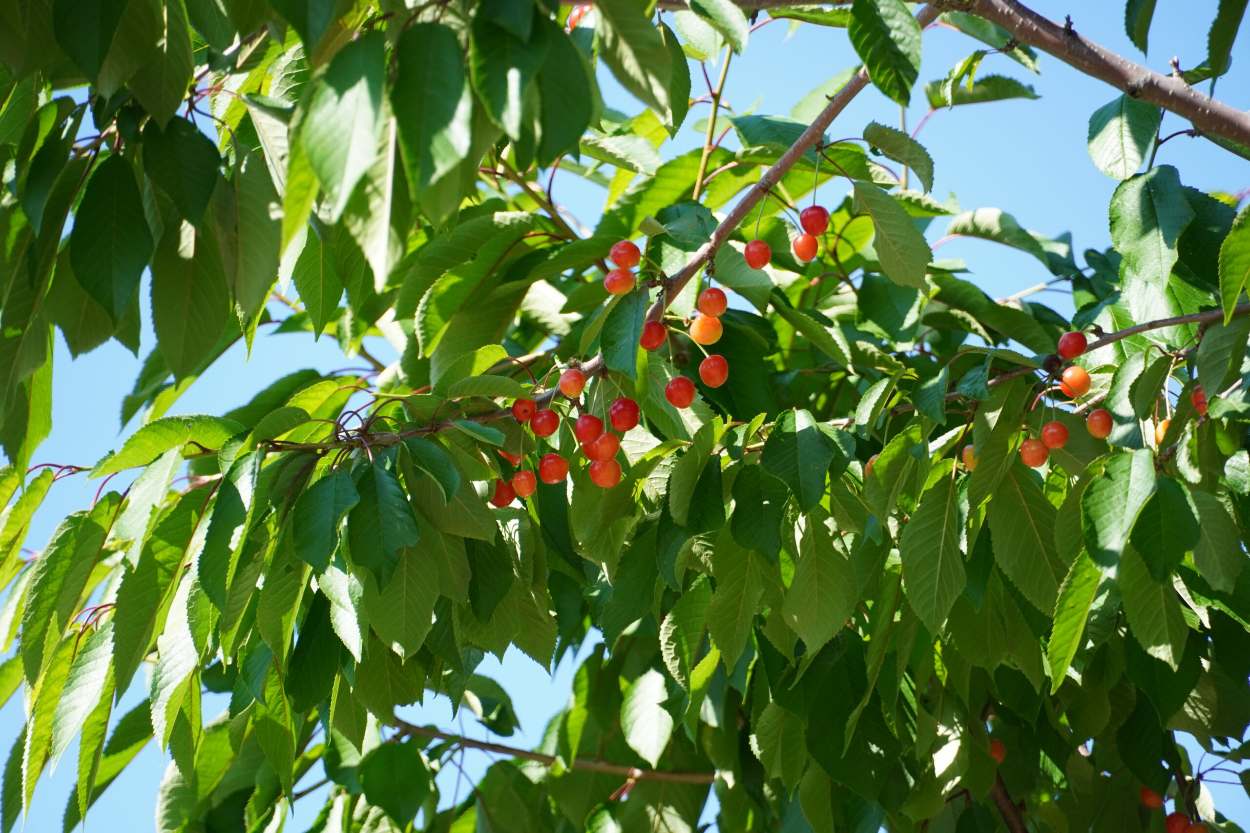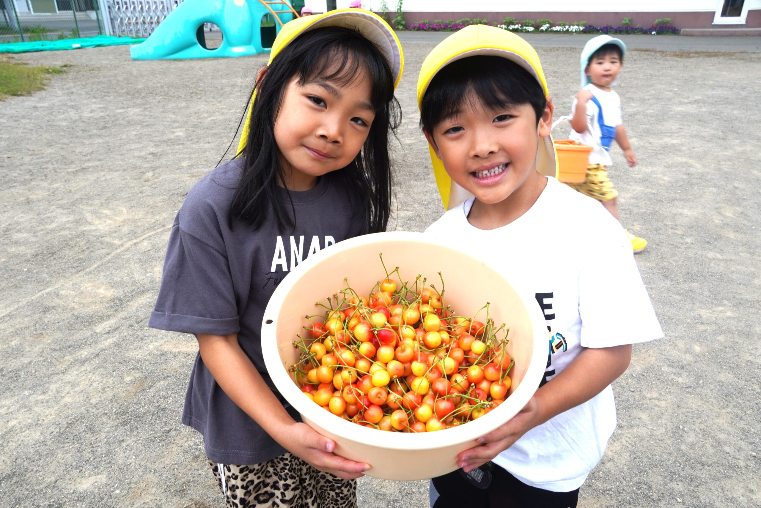 幼稚園の園庭のさくらんぼの木に今年もたくさんの実がなり、みんな喜んでたくさん食べていました。