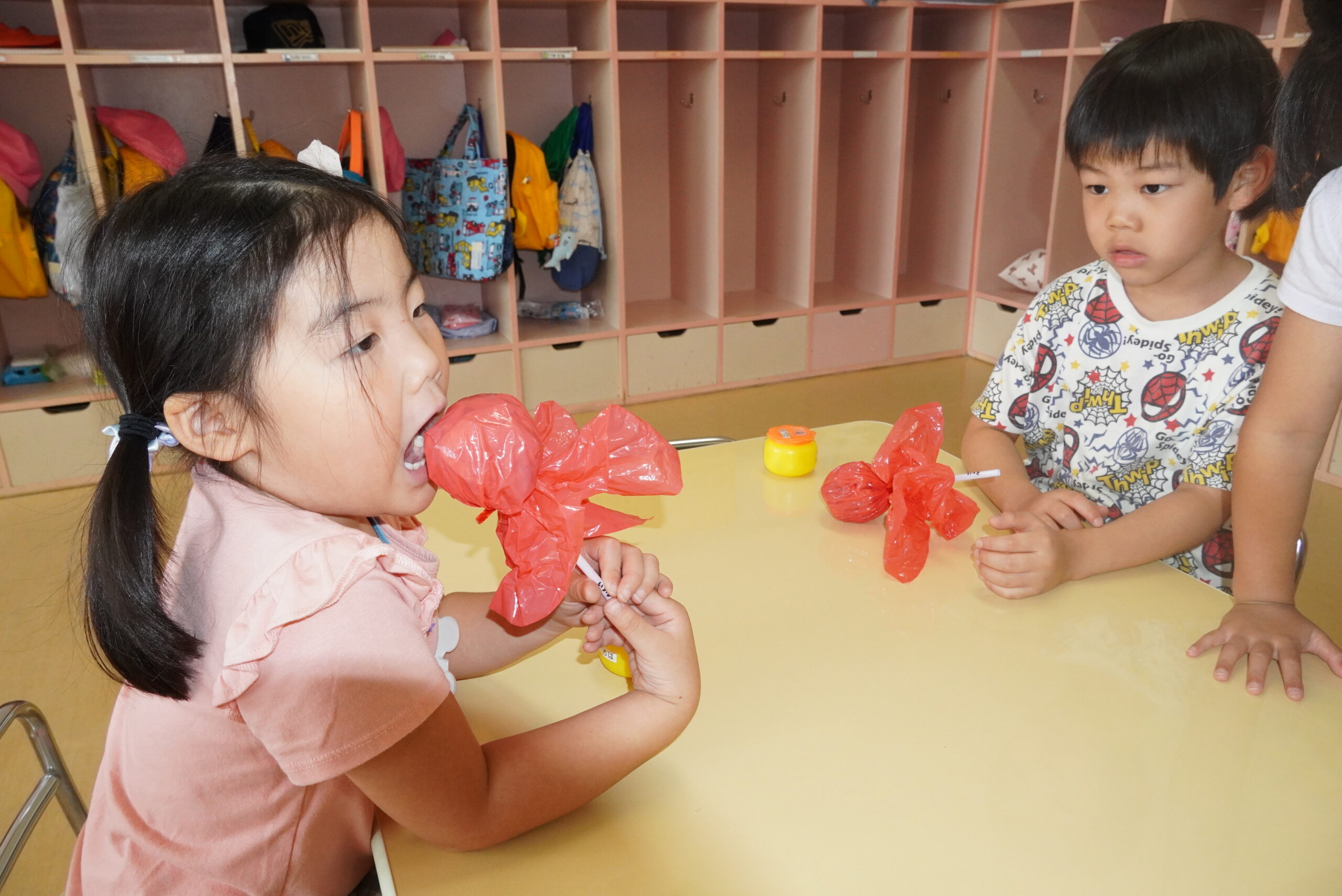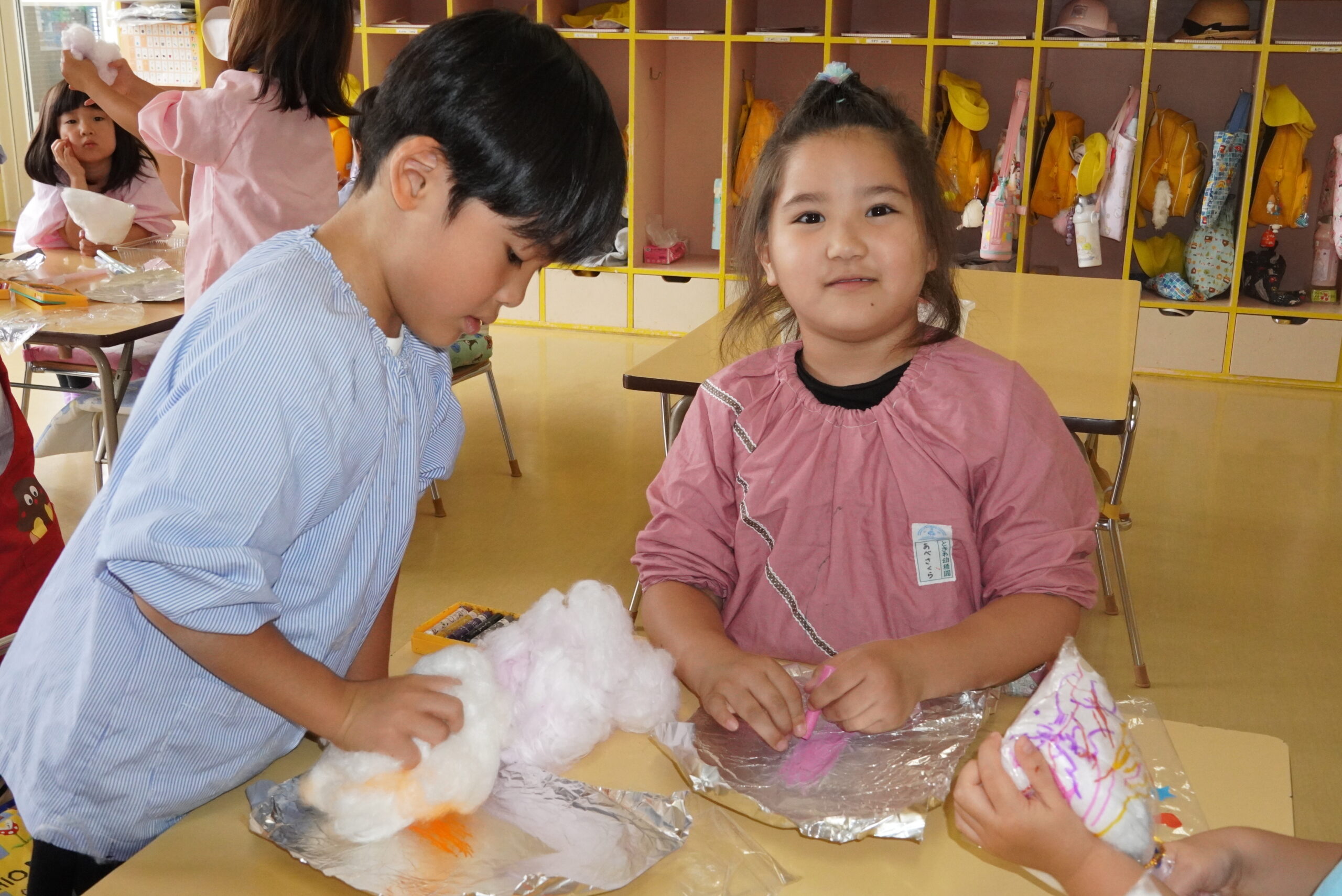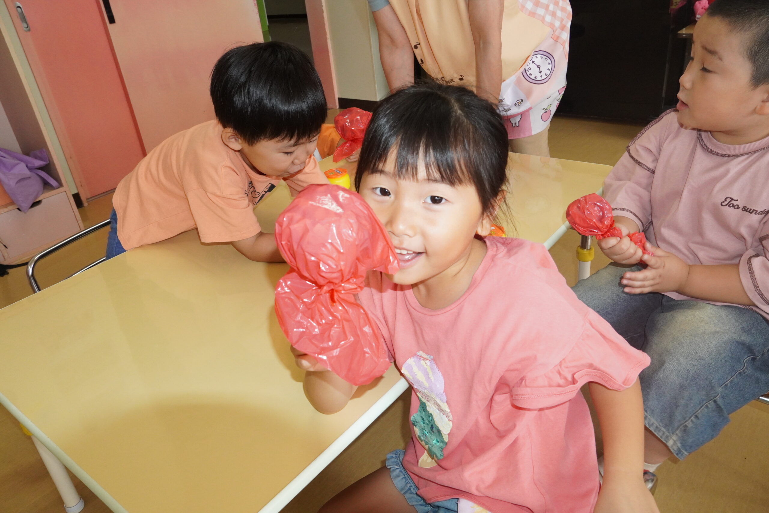 周りには3~5歳の園児が縦割り保育のクラスでそれぞれお祭りの綿あめ、りんご飴、かき氷を製作し飾りました。