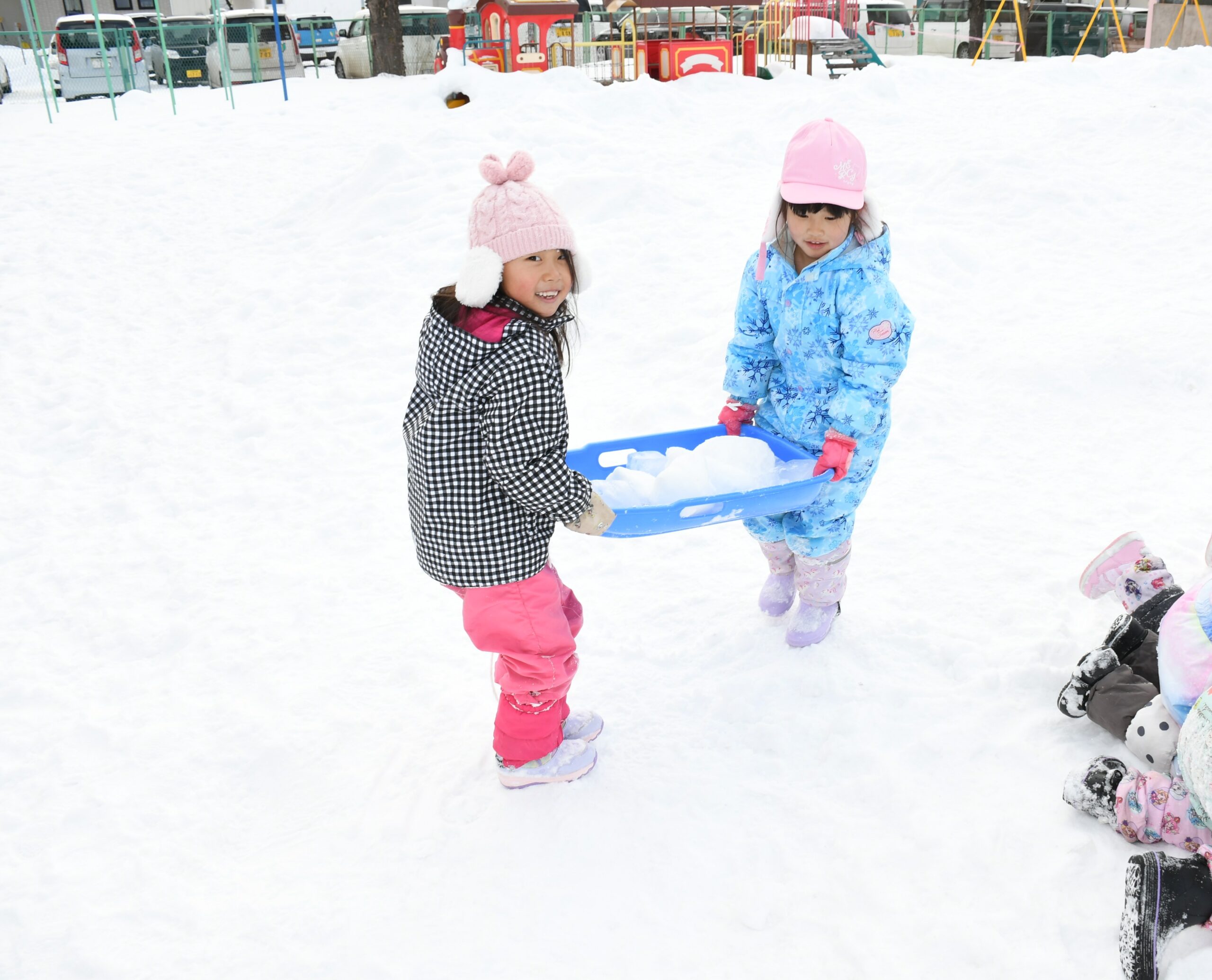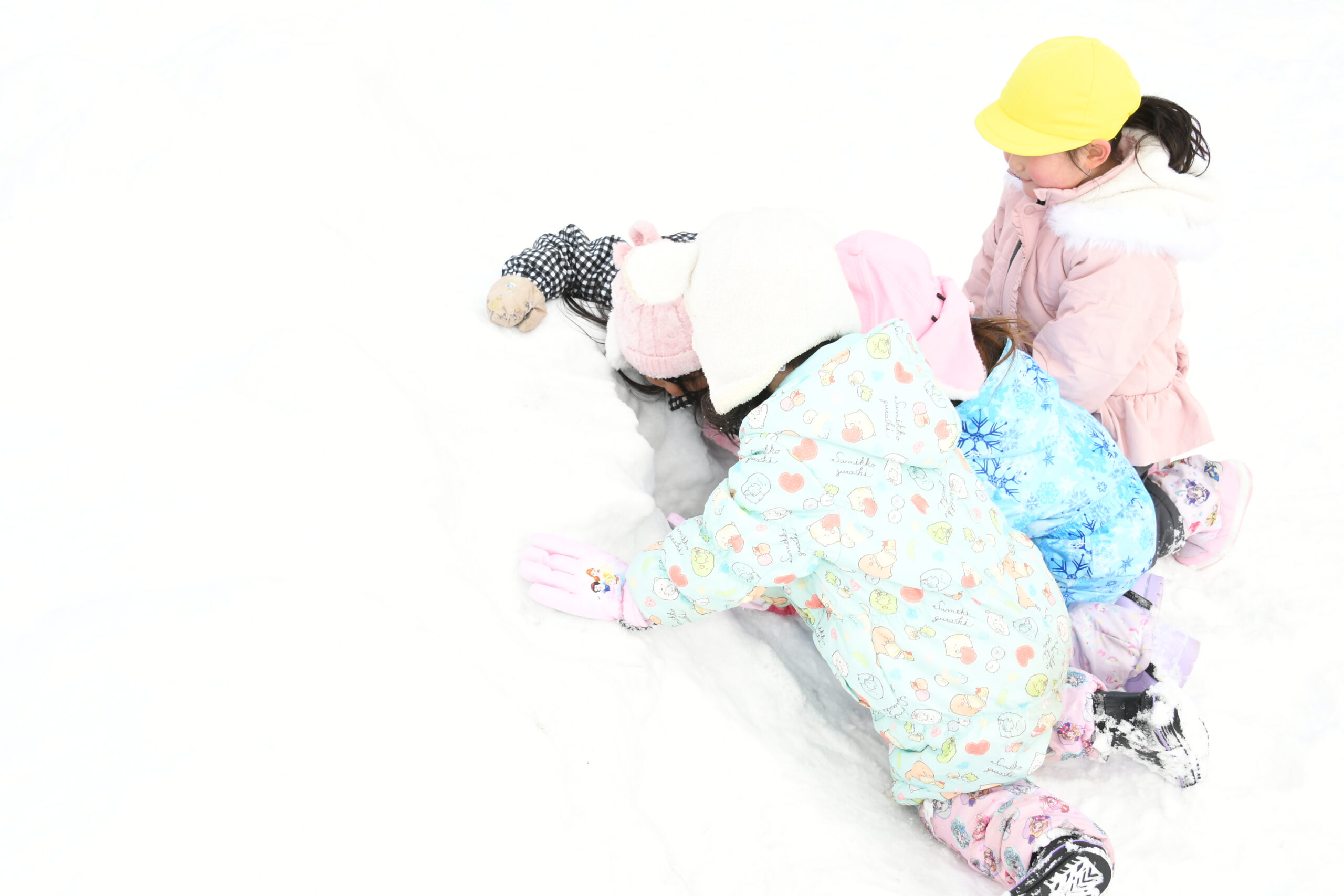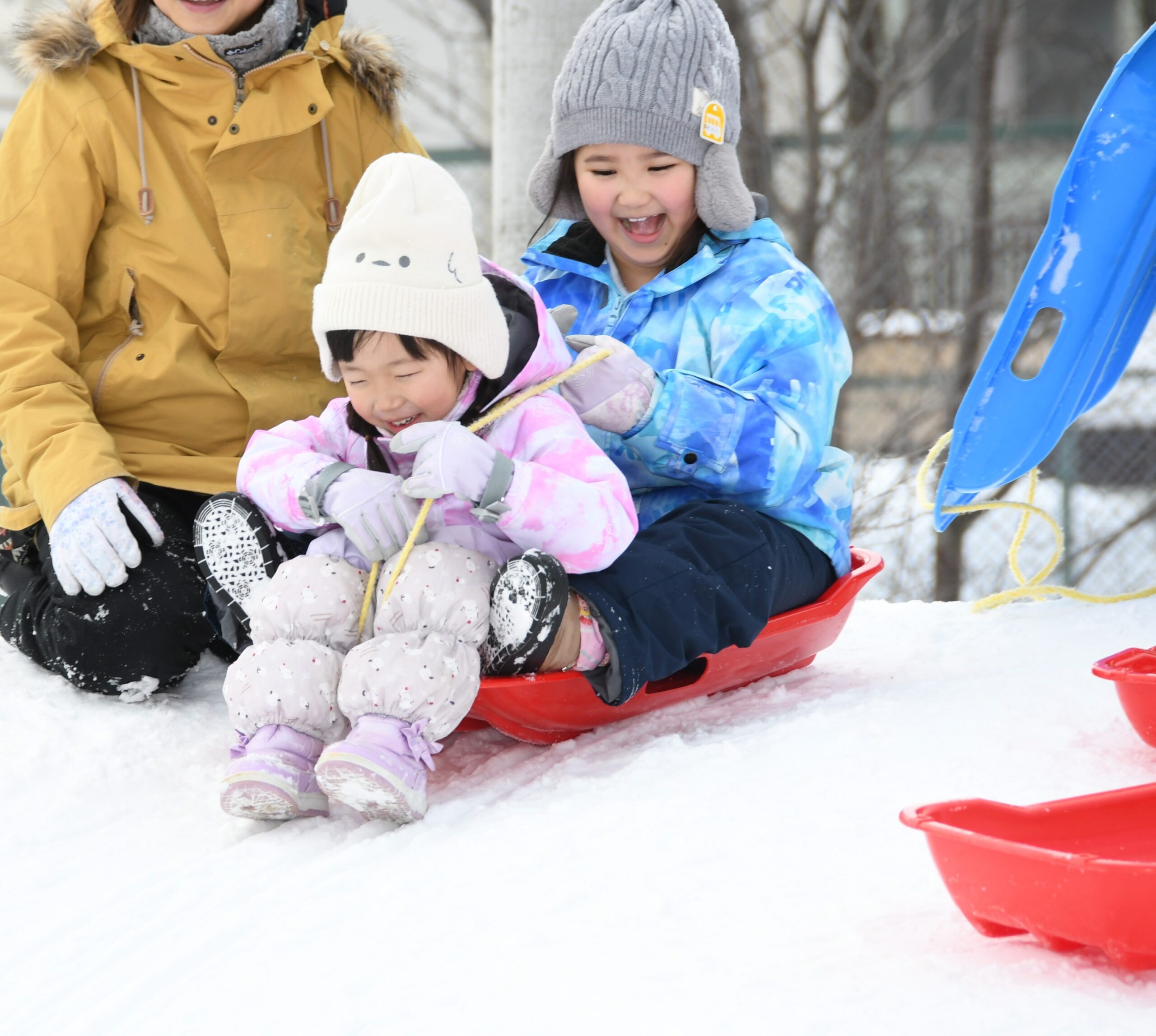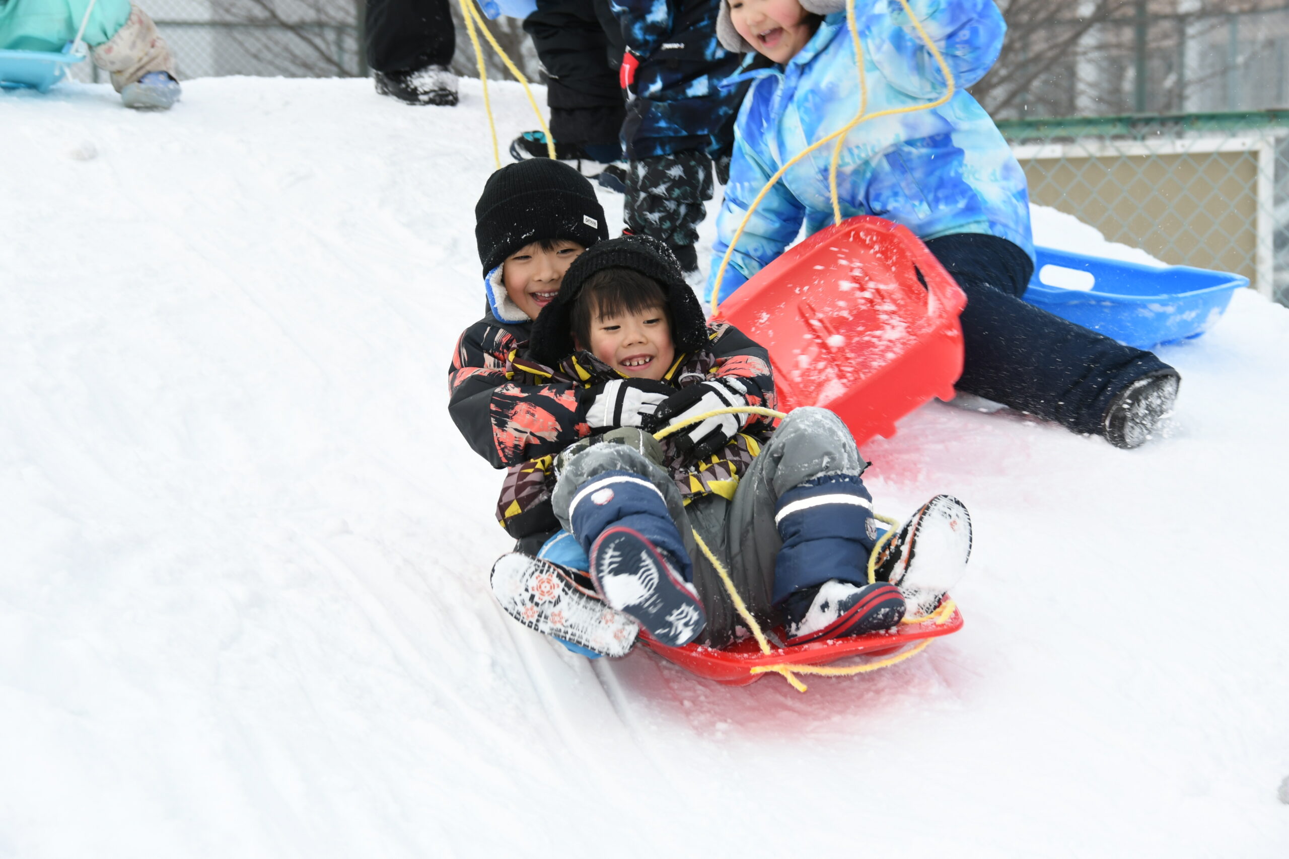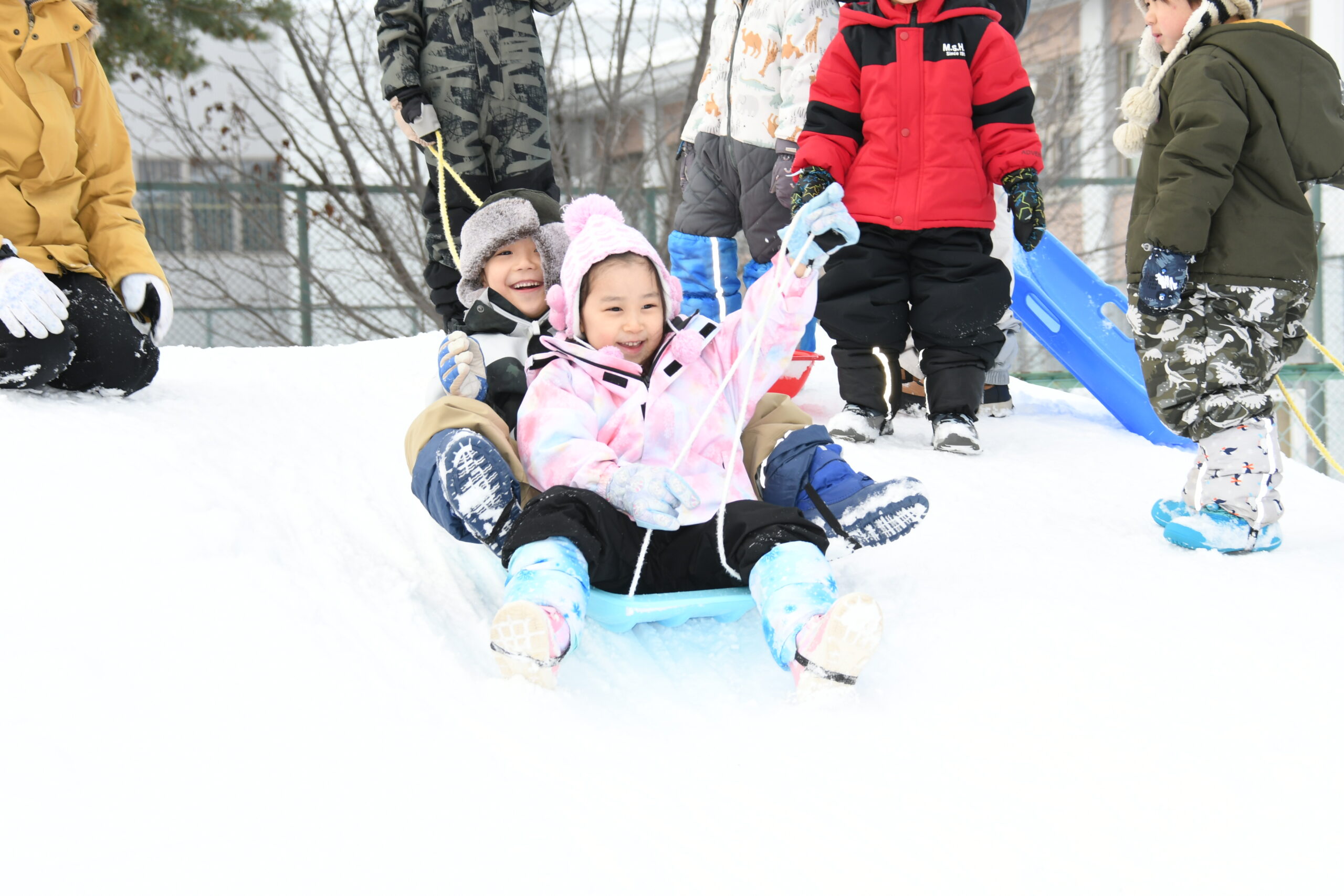 ゆめ組(5歳児)雪遊び 2026/1/30 1月30日(金)雪遊び 久しぶりの雪遊びに、「やったー!」と大喜び! そり滑りや雪だるまづくりに夢中です。冬の自然にたくさん触れ、お友達と雪遊びを思いきり楽しみました! そり滑りが人気なゆめ組さん! しっかり紐を掴んで、しゅぱーつ! 雪玉をたくさん作って・・・ どんどん積み上げて~・・・上手に積めるかな? 〈5段だるま〉の完成♪ そりで氷を運んで・・ 深く掘った穴の中に入れて、宝探しも楽しみました☆ 園ブログ2025年2026年