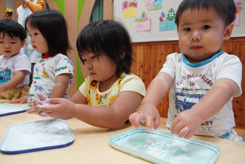 感触遊びでは、小麦粉・寒天・水遊び・緩衝材などを実際に体験することで、心の豊かさを育みます。