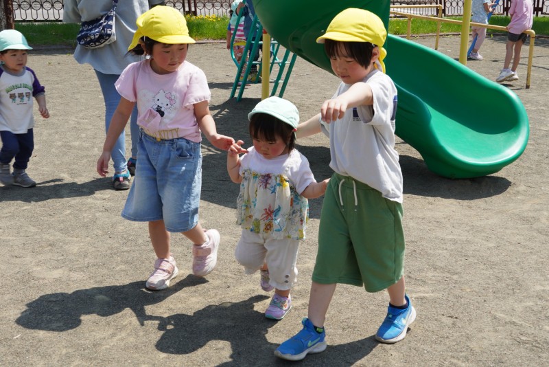 小さなお友達は、お兄さんお姉さんの遊ぶ様子を見て一緒に過ごす事から、物や人への興味・関心を広げ成長していきます。