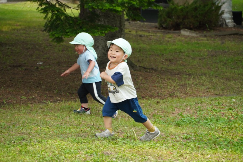 春には桜の花やたんぽぽの匂いを感じ、夏には小さなプールで水遊び、秋には公園でキノコ探し、冬には園庭に大きな雪山でおしり滑り!